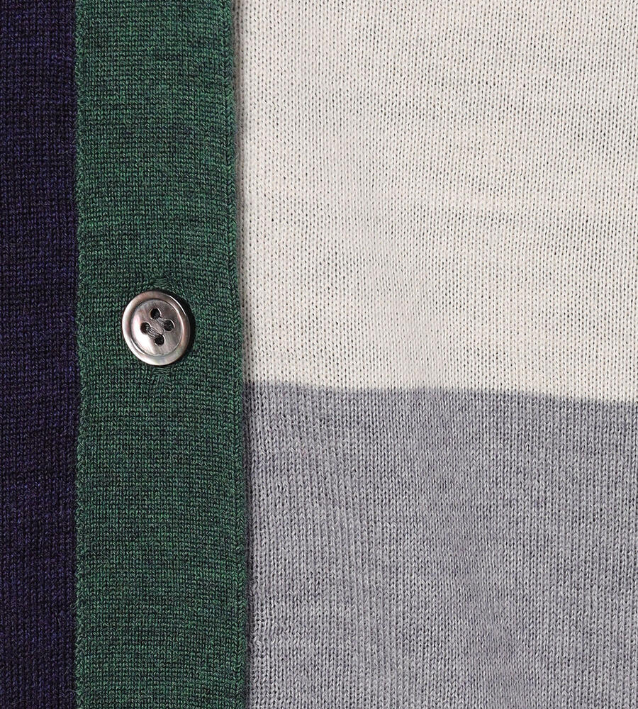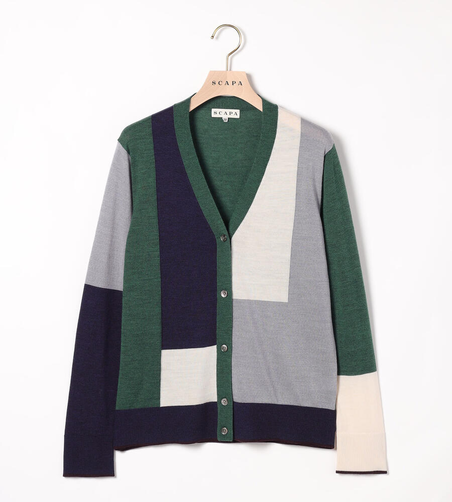 モダンアートのようなブロック柄がスタイリングのアクセントになる、フロントボタンニットカーディガン。あたたかくやわらかな毛100%素材を採用。インにシンプルなシャツやニットを合わせた、秋冬らしいレイヤードスタイルもおすすめです。