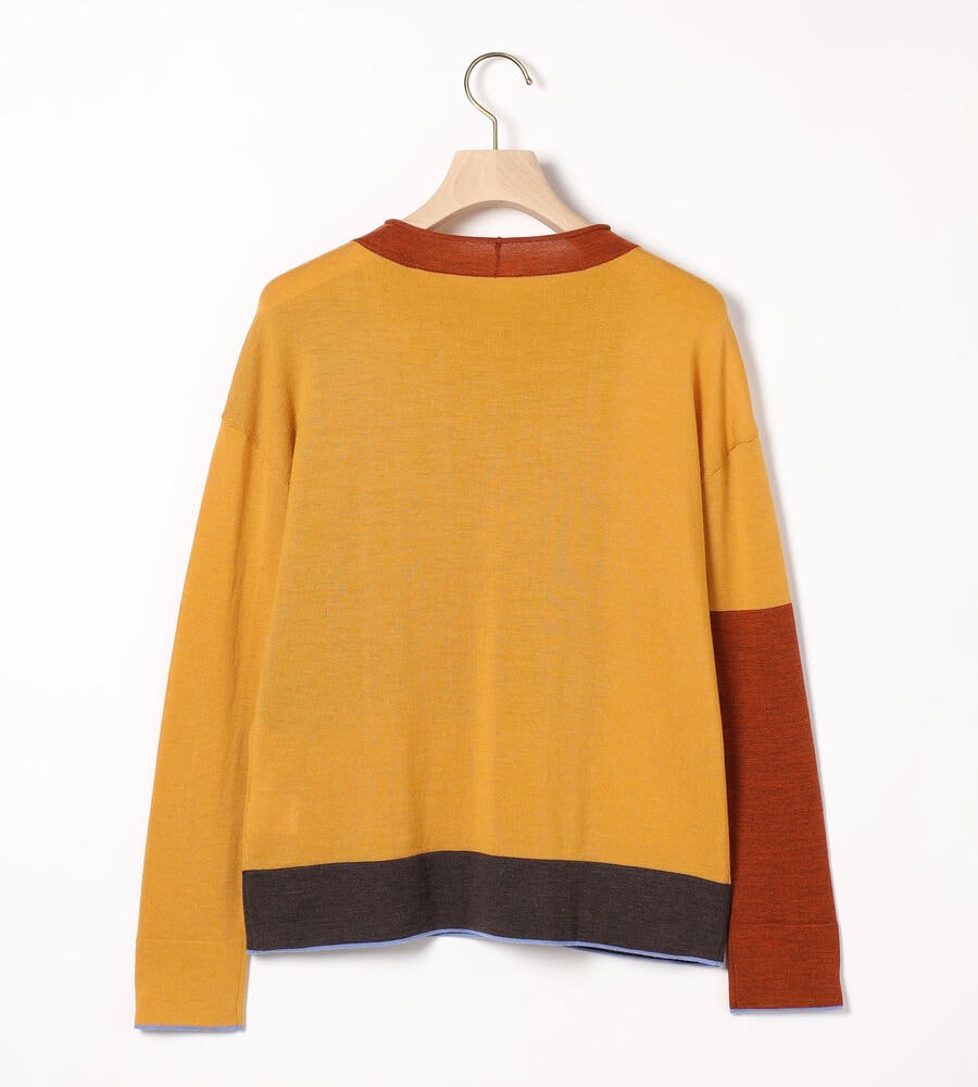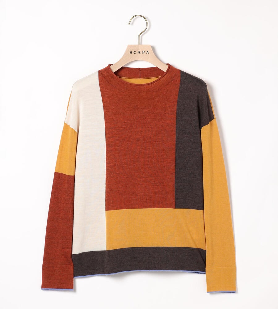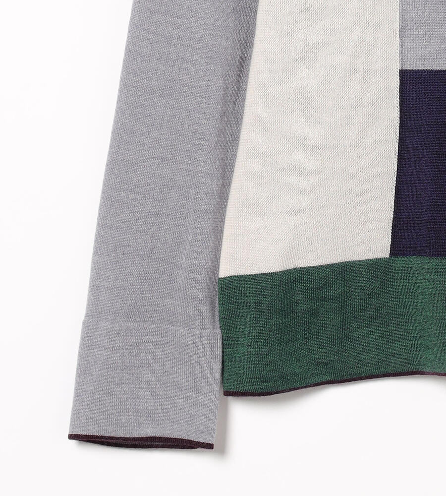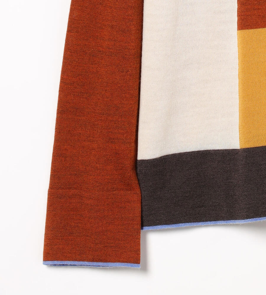 モダンアートのようなブロック柄がスタイリングのアクセントになるニットプルオーバー。あたたかくやわらかな毛100%素材を採用。袖口と裾のさりげないライン切り替えにこだわりが光るアイテムです。浅めのボトルネックが季節感を演出しています。
