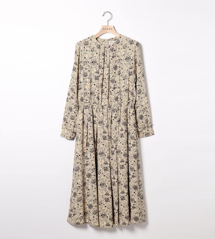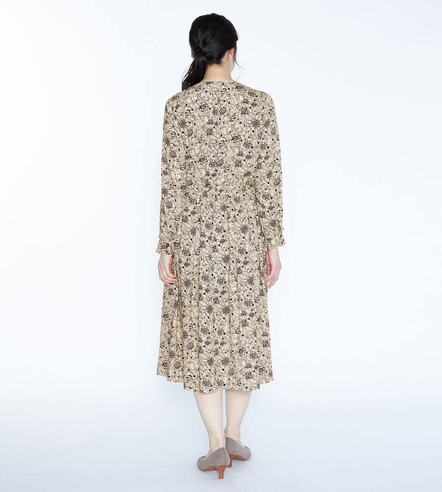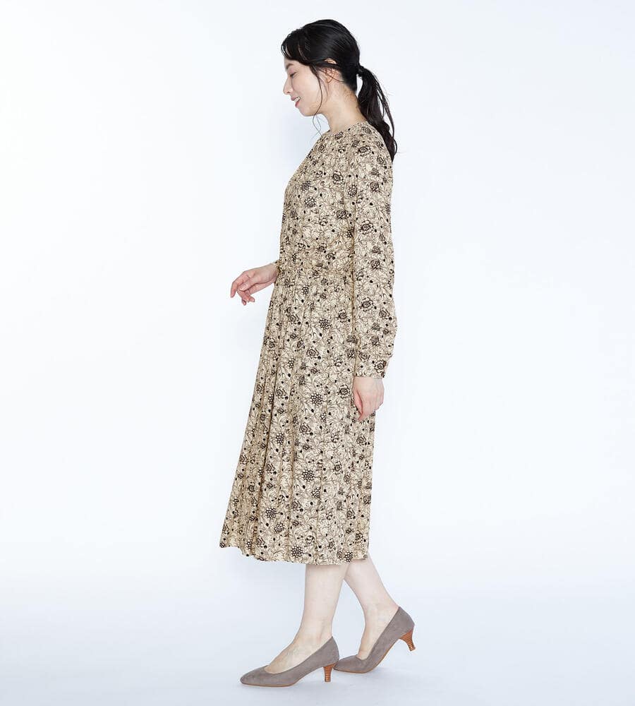 線画でデザインしたフラワープリントの長袖ワンピース。シックな配色やロング丈のデザインで大人のコーディネートに仕上がります。ウエストと袖口の切り替えにはボリューム控えめのフリルをあしらい、女性らしさをさりげなくプラス。存在感があり、1枚でコーディネートが決まるのも魅力のアイテムです。