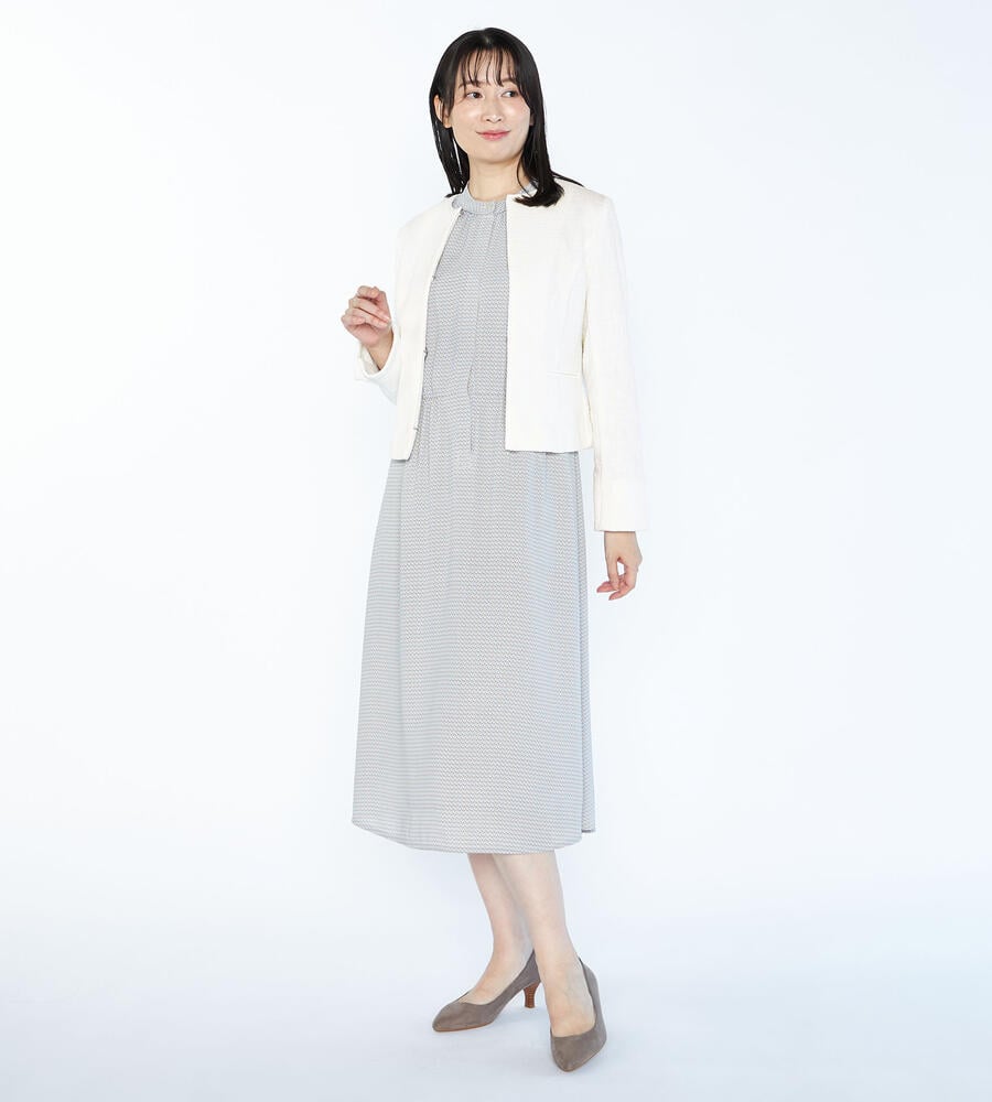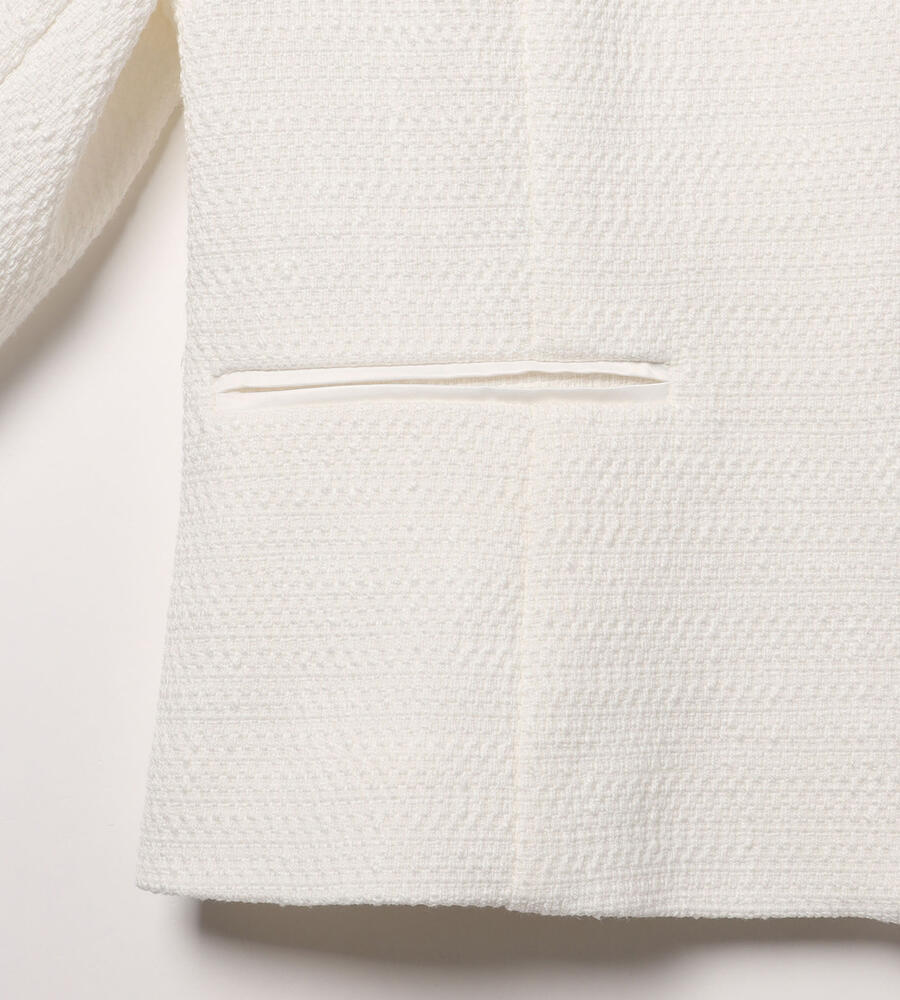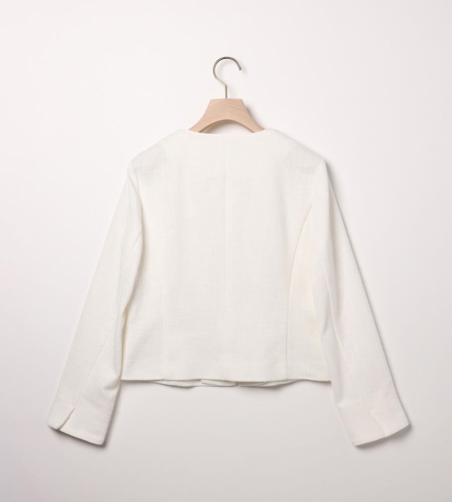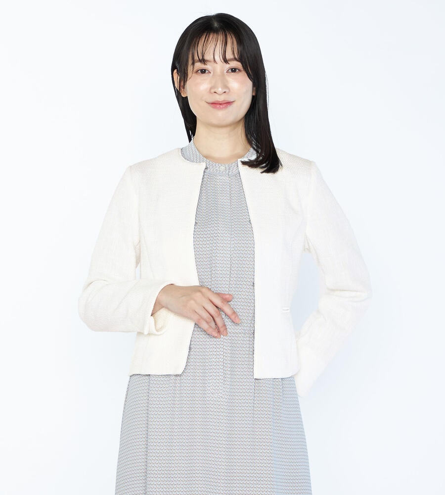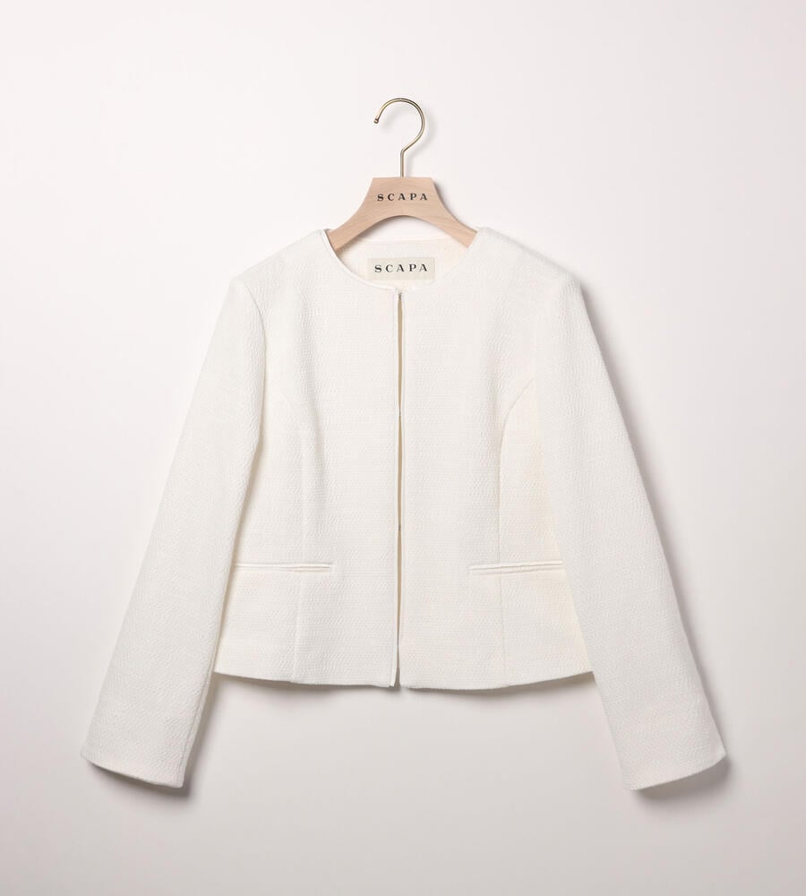 洗練されたルックスと着心地の良さを実現したノーカラーのストレッチツィードジャケット。フロントはボタンレスのデザインでシンプルに仕上げ、左右にはポケットを配置。部分的にテープを切り替えたさりげないこだわりもポイント。コンパクトなシルエットがボトムスとバランスが取りやすくおすすめです。