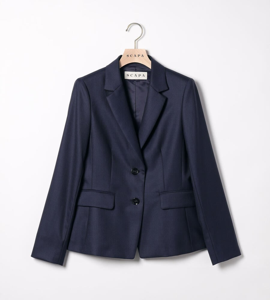 上質な光沢を持つウール素材を用いたラペル付きのジャケット。身体のラインに沿うようなダーツを入れて、スマートなシルエットに仕上げています。ウールながらもさらりとしたタッチの素材を用いており、気品のある表情を備えているのがポイント。ビジネススタイルに大人の品格を加える1点です。