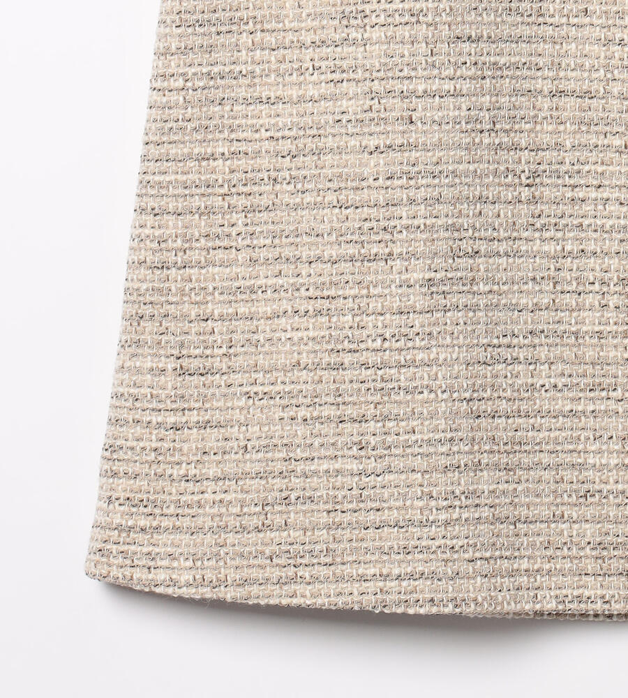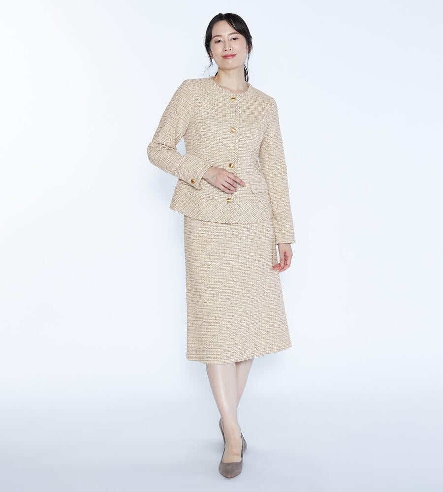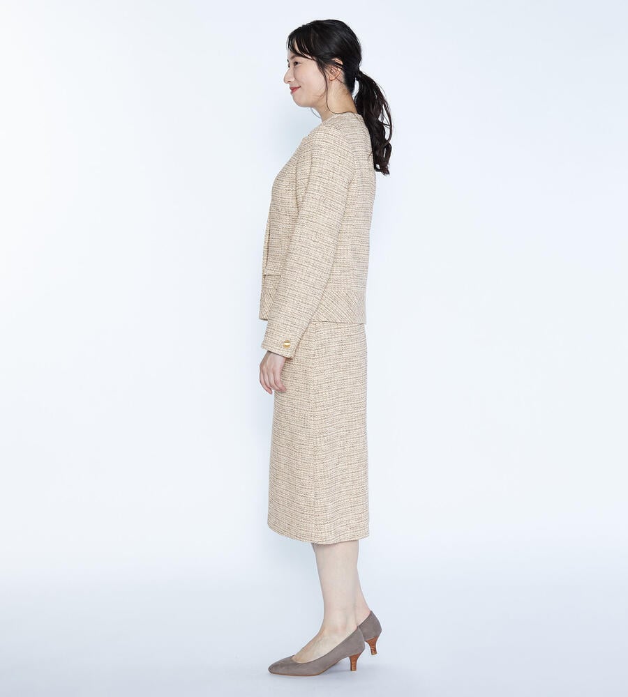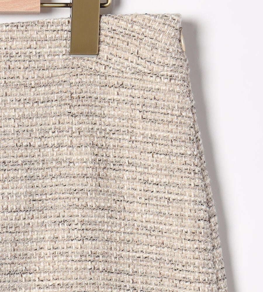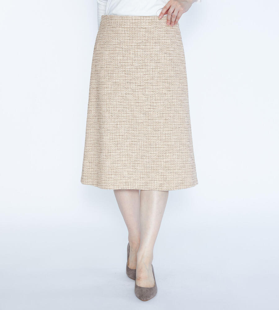 色が入り混じる様で目を楽しませてくれる、ミックスツイード素材のスカート。広がりが控えめな台形型と、膝が隠れる程度の着丈で、淑女の気品を備えた1点です。ツイードながらも起毛感は控えめで、すっきりと着こなせるのもポイント。同素材のジャケットを合わせると、改まったシーンにも最適なきれいめな着こなしが完成します。