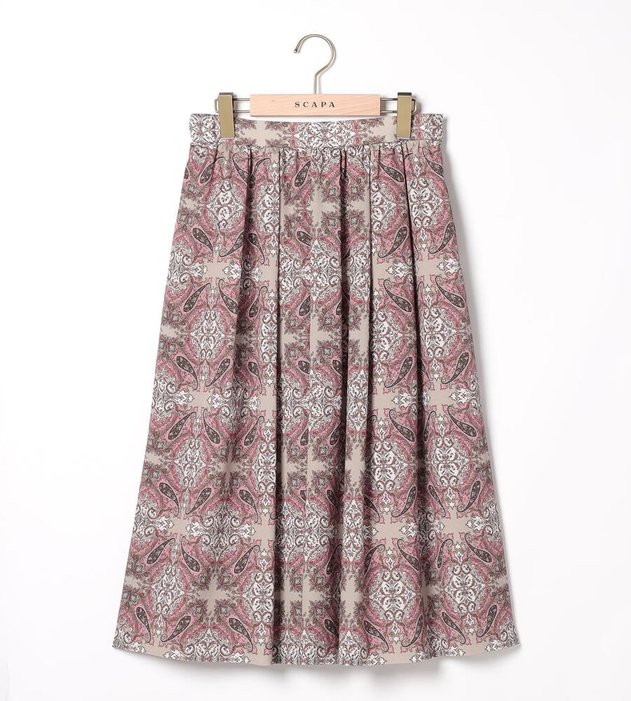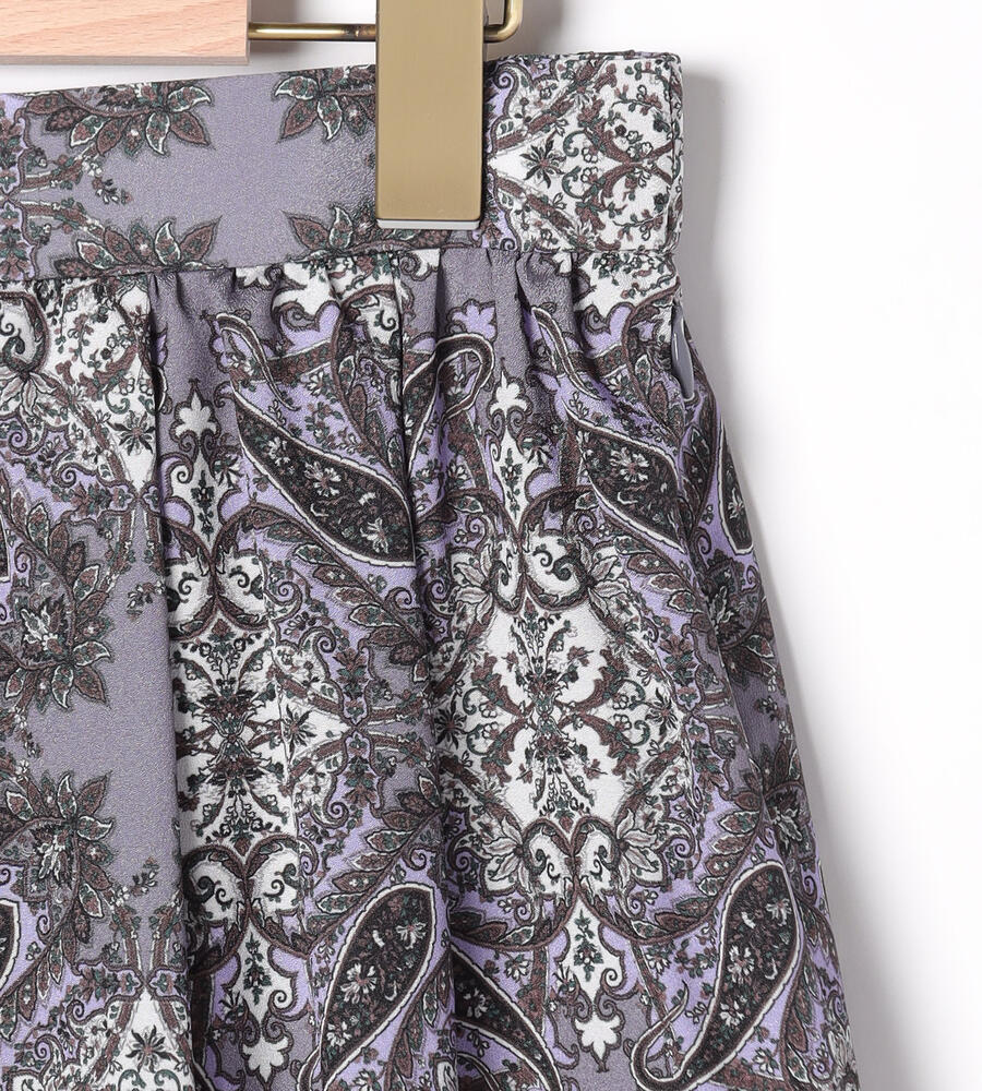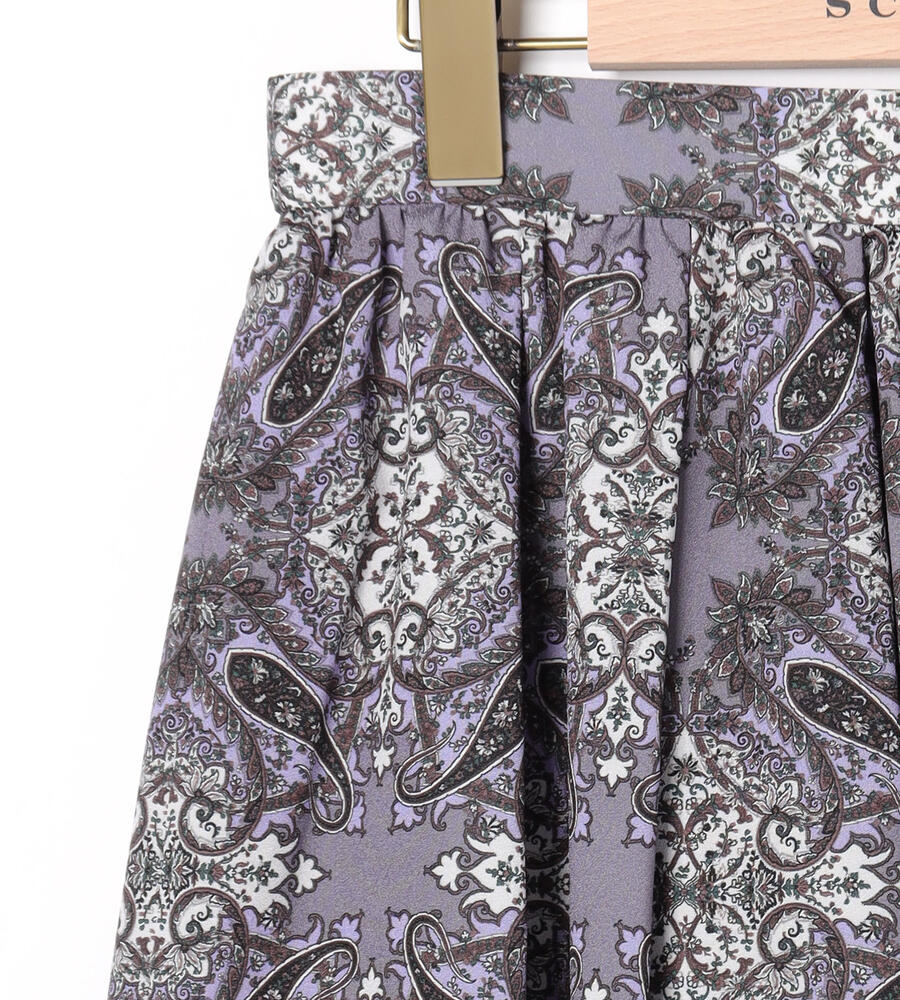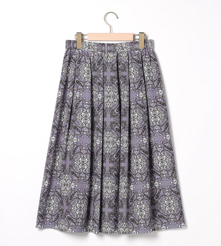 スクエアパターンのサラサの生地で仕立てたスカート。細かなディティールが描かれた華やかなデザインが魅力。タック入りで立体感のある美しいドレープが魅力。裾に向かってふんわりフレアに広がるフェミニンなシルエット。お手持ちのトップスを合わせておしゃれなお出かけコーディネートが完成するアイテムです。