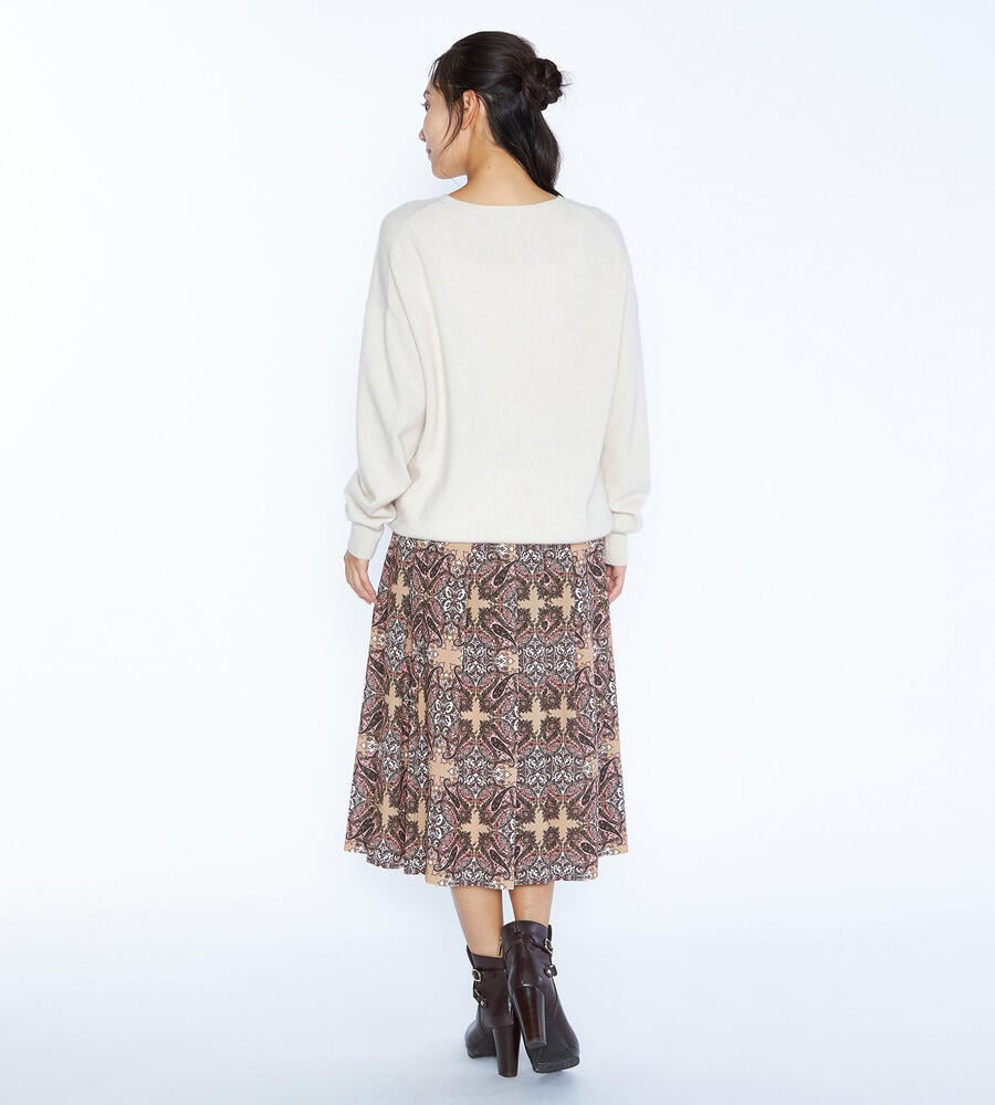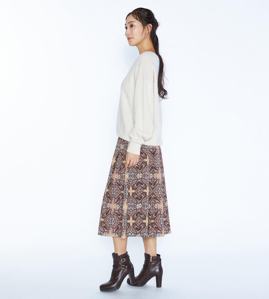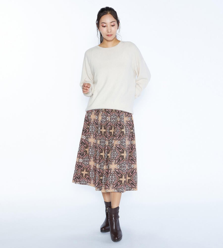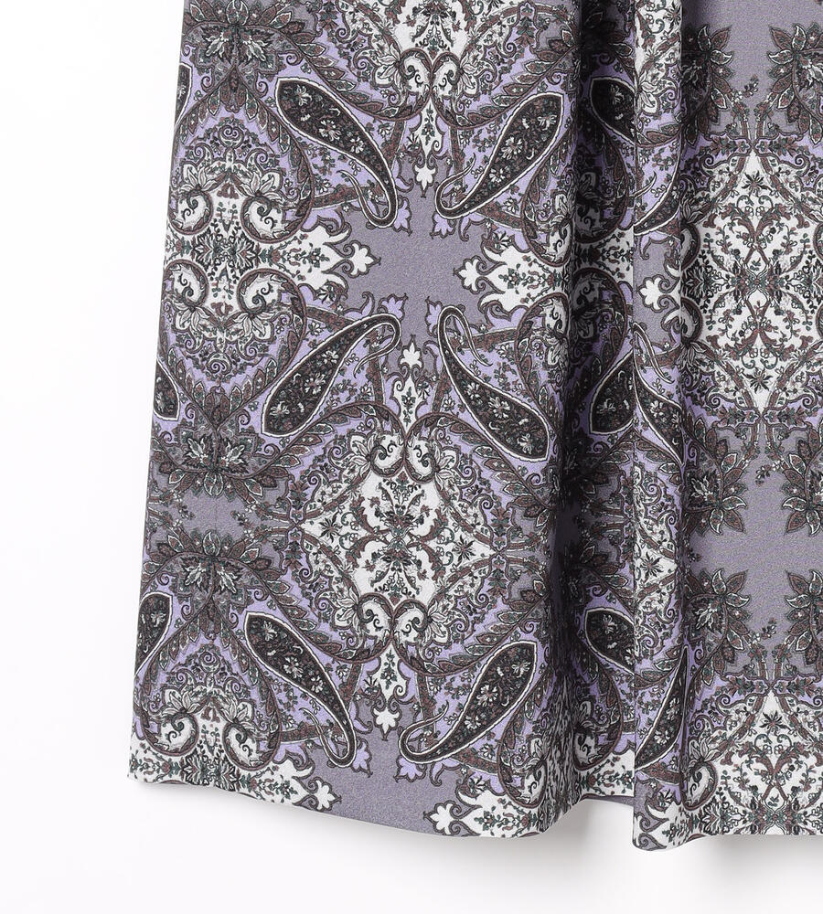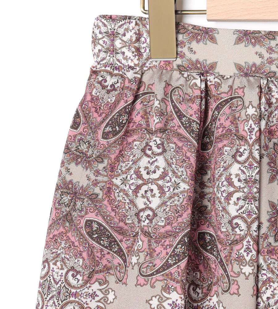 スクエアパターンのサラサの生地で仕立てたスカート。細かなディティールが描かれた華やかなデザインが魅力。タック入りで立体感のある美しいドレープが魅力。裾に向かってふんわりフレアに広がるフェミニンなシルエット。お手持ちのトップスを合わせておしゃれなお出かけコーディネートが完成するアイテムです。