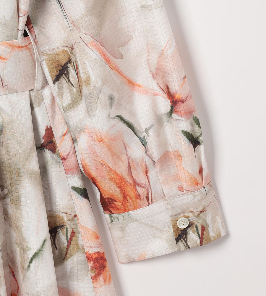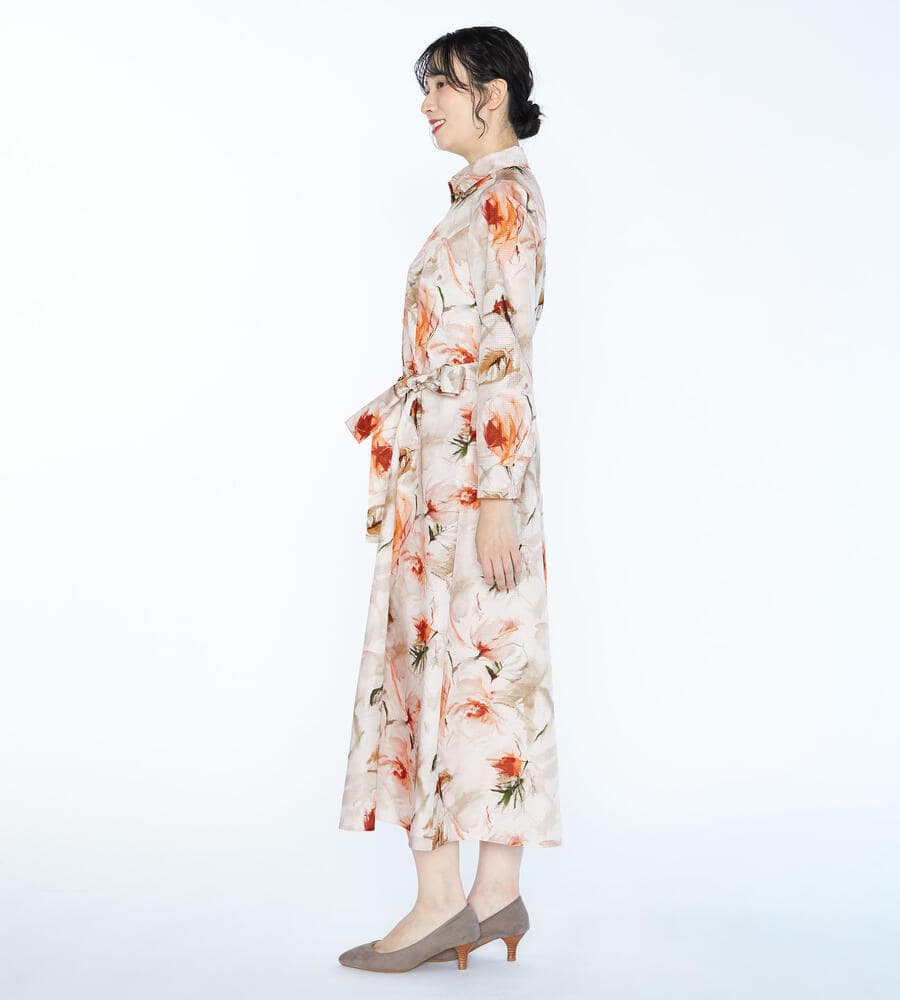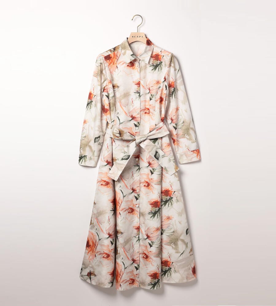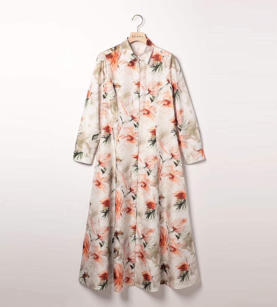 リップストップのような格子柄を織り込んだ生地に、水彩画のようなボタニカルプリントを乗せたワンピース。光沢とハリのある素材感で、着こなしを凛とした印象に仕上げます。ウエストをきゅっと結ぶリボンで、メリハリもプラス。アンダードレス付き。