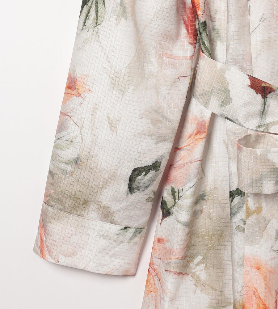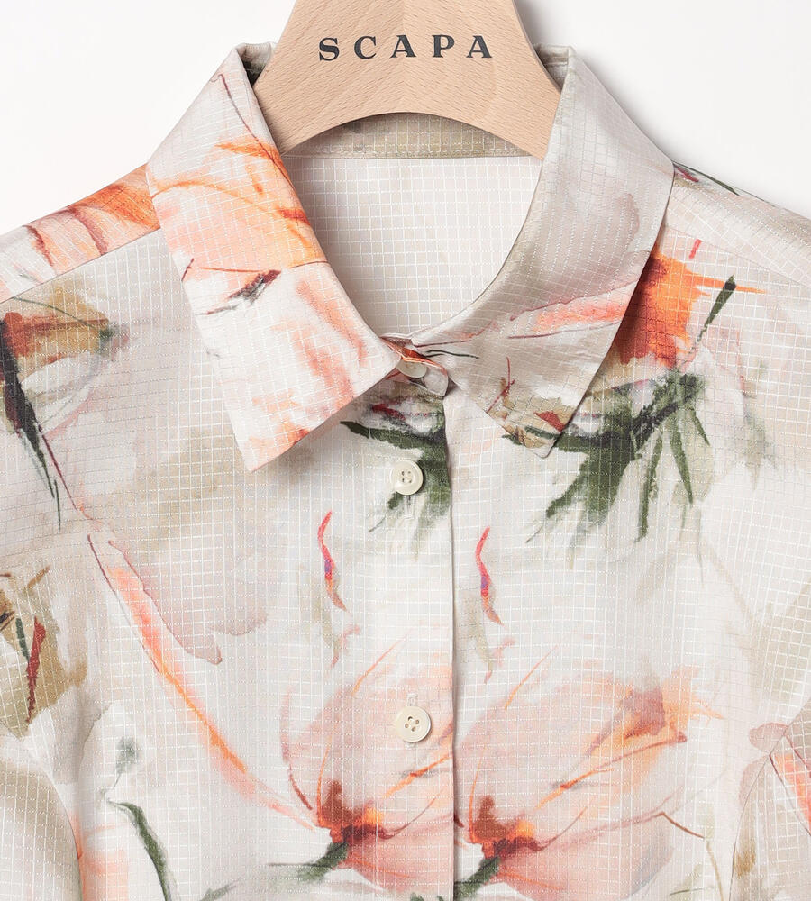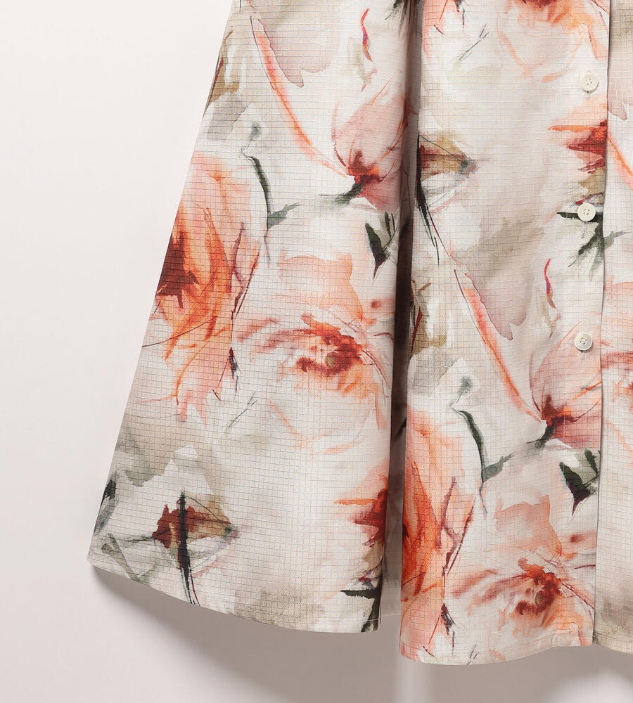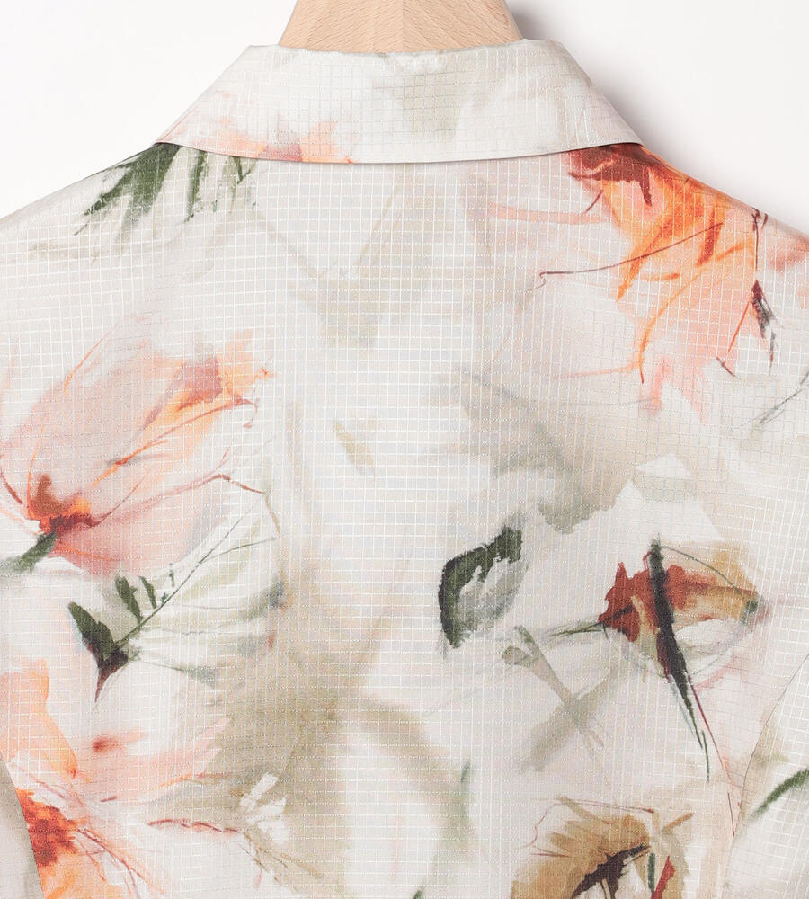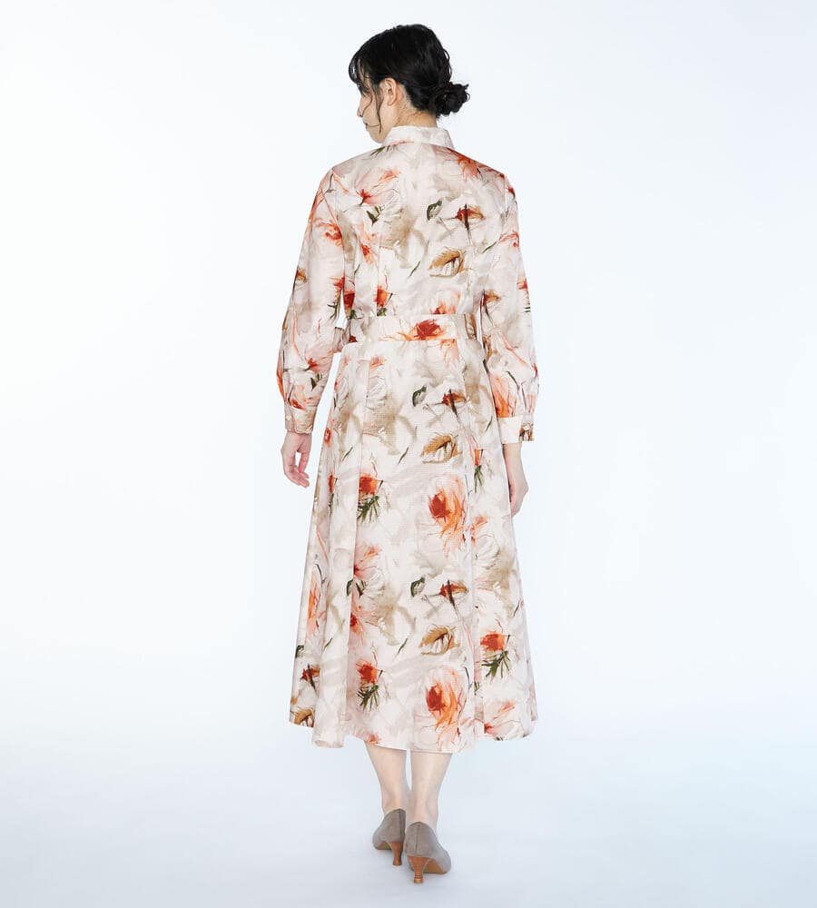 リップストップのような格子柄を織り込んだ生地に、水彩画のようなボタニカルプリントを乗せたワンピース。光沢とハリのある素材感で、着こなしを凛とした印象に仕上げます。ウエストをきゅっと結ぶリボンで、メリハリもプラス。アンダードレス付き。
