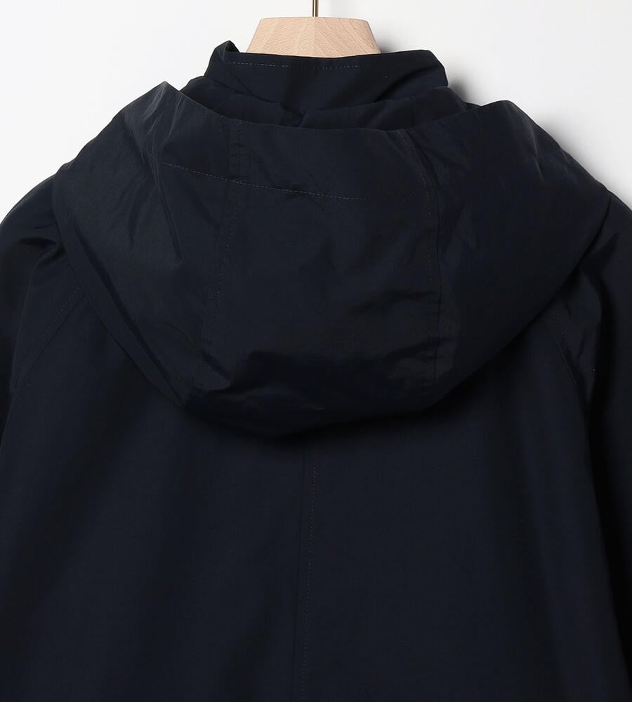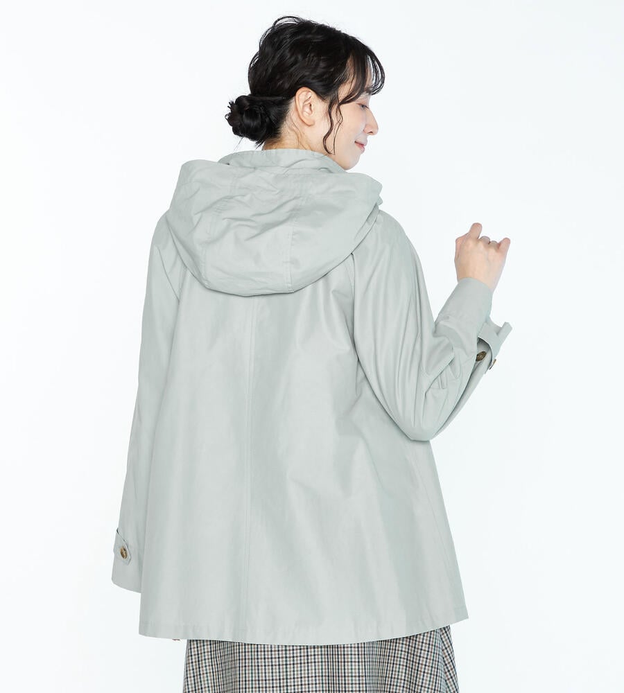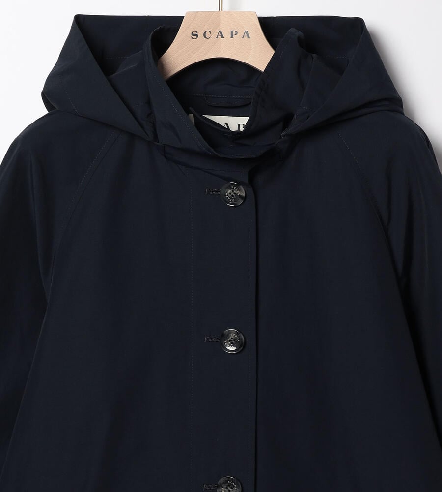 リラックス感と上品さを兼ね備えたフード付きコートです。春先から軽やかに着こなせるコットンとナイロンのブレンド素材を採用。ボタンにはブランドロゴをあしらい、左右にポケットを配置。フードは取り外しが可能です。腰まわりにゆとりのある裾広がりのシルエットがコンフォートなムードを演出します。