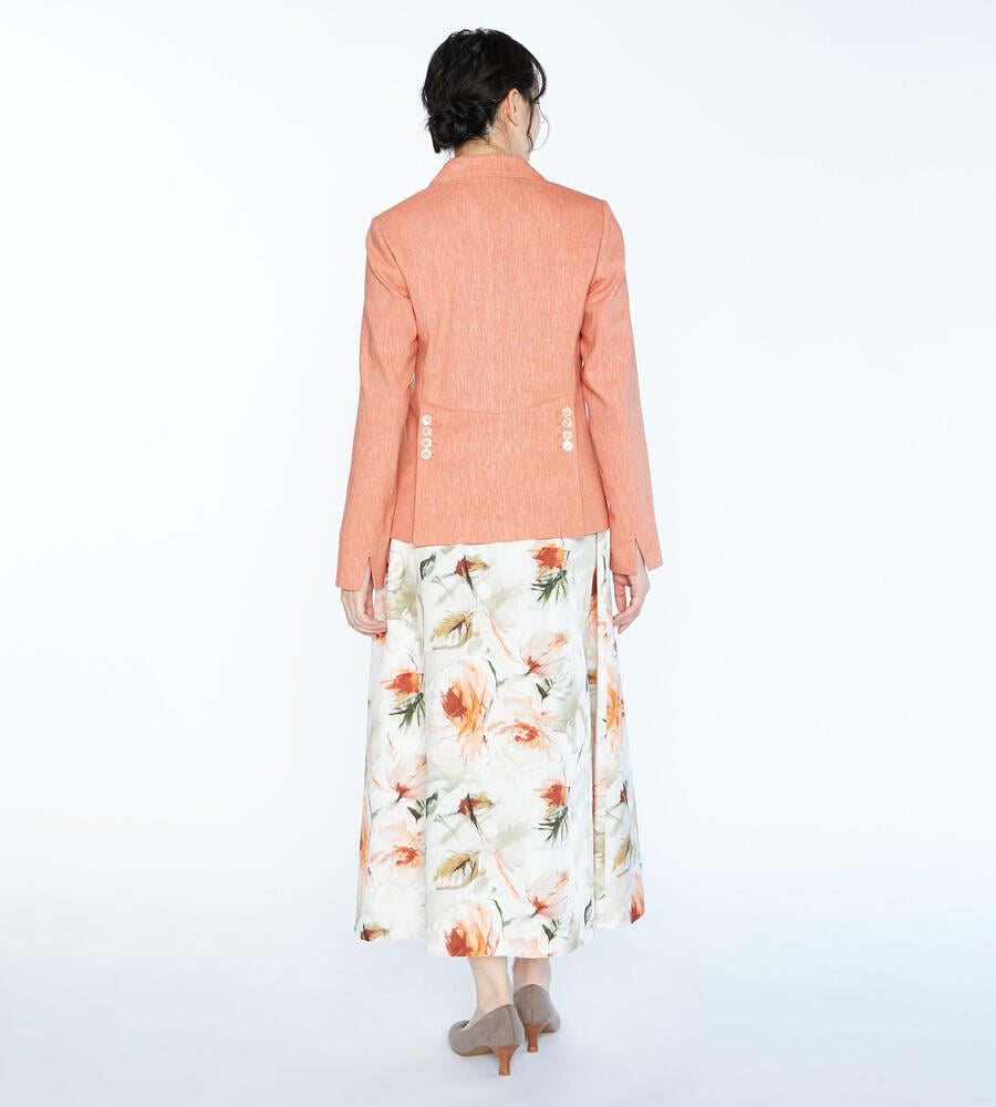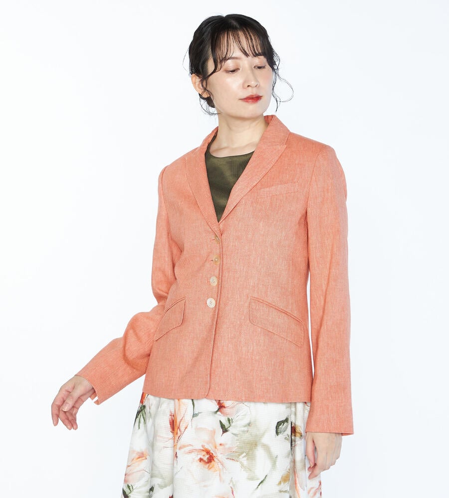 麻を織り交ぜつつもストレッチ性の効いた素材で、さっぱりとした表情に仕上げたジャケット。ユニークなラペルや、4つのボタンで、シンプルながらも個性的な印象です。ウエストがすっきりと見えるシルエットで、きちんと感とフェミニンな空気感を併せ持つデザイン。ワンピースなどの上からさらりと羽織るスタイルもおすすめです。