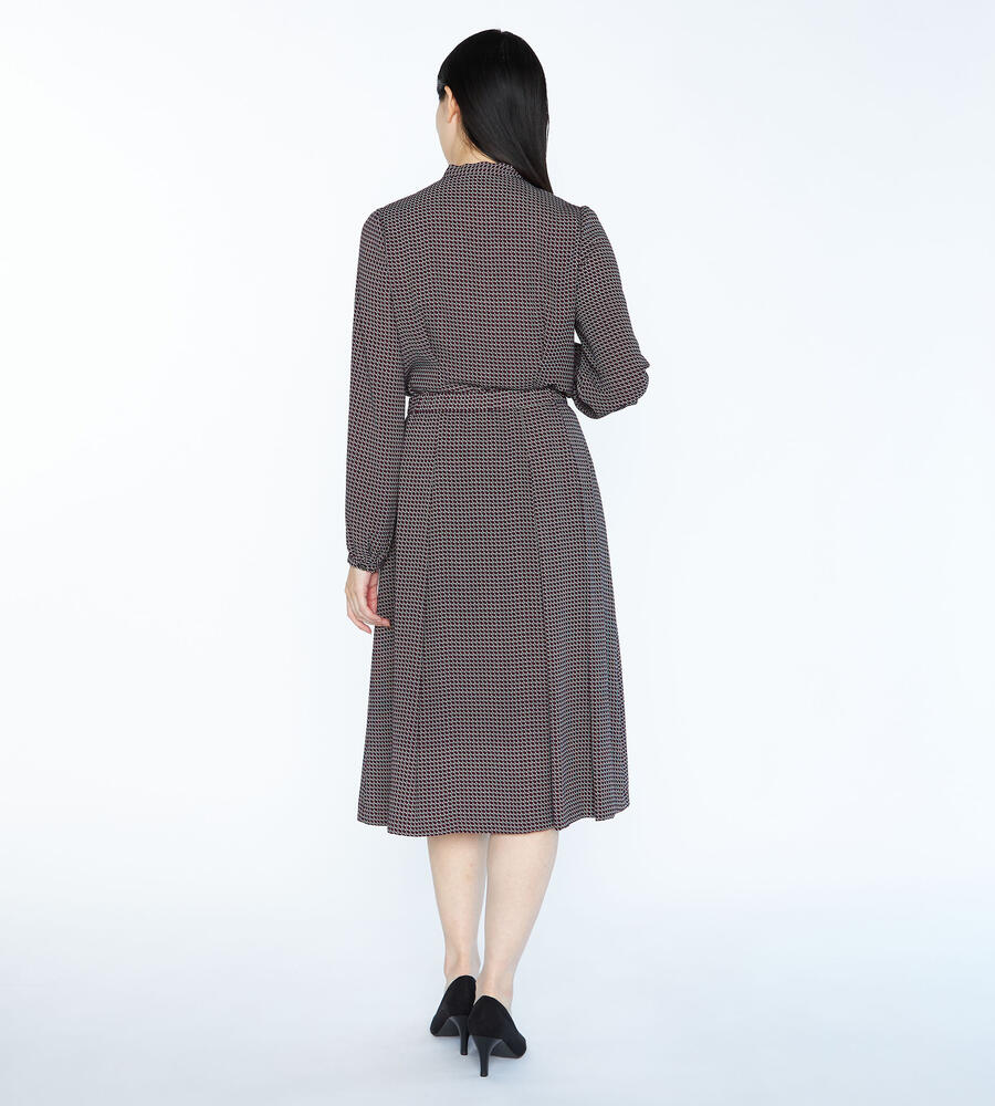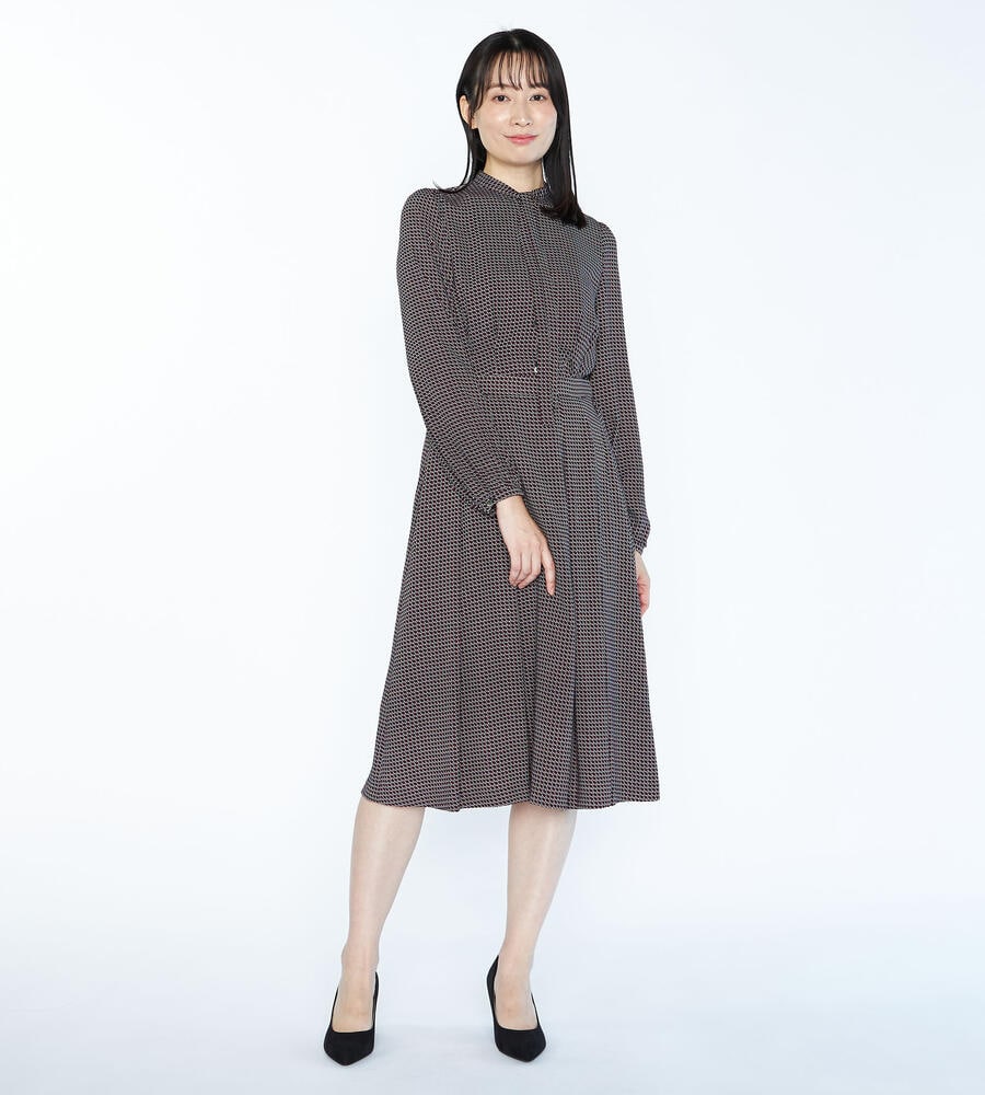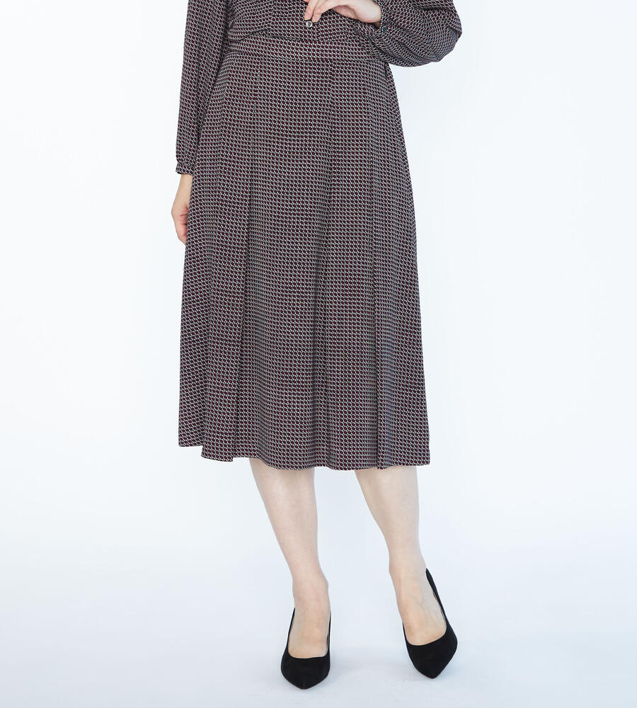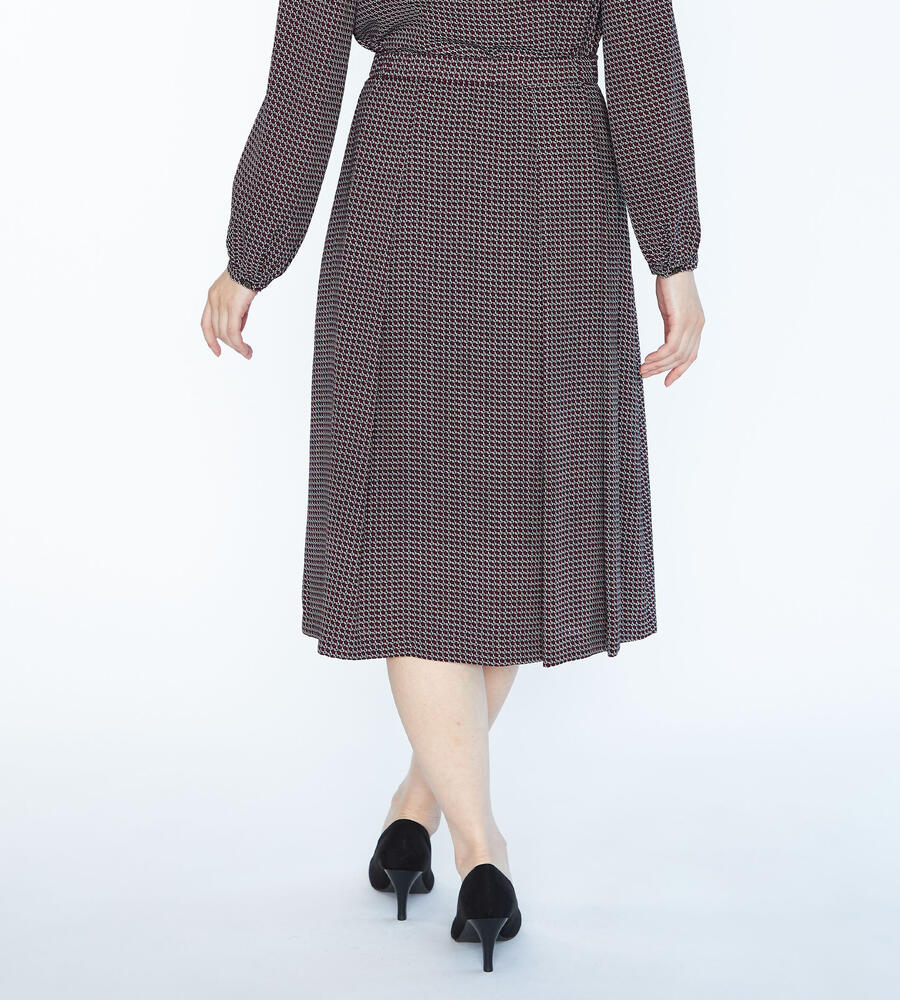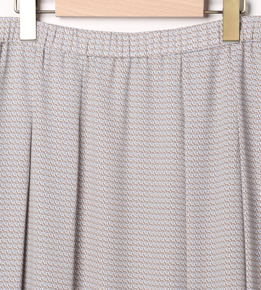 ヴィンテージライクな雰囲気を楽しめるジオメトリック柄のスカート。フロントにプリーツをあしらい、裾広がりのシルエットを演出。サイドファスナー仕様、バックウエストがゴムになったコンフォートな着心地も嬉しい。トップスインスタイルもキレイに仕上がります。