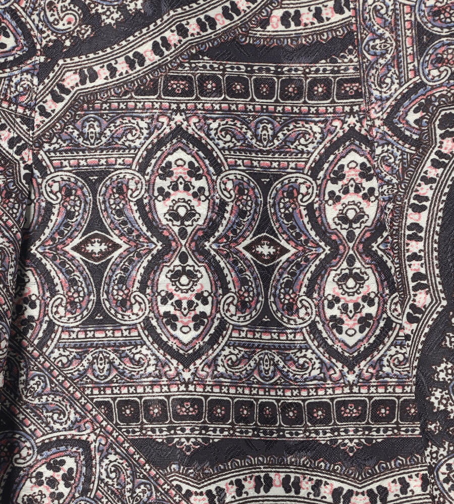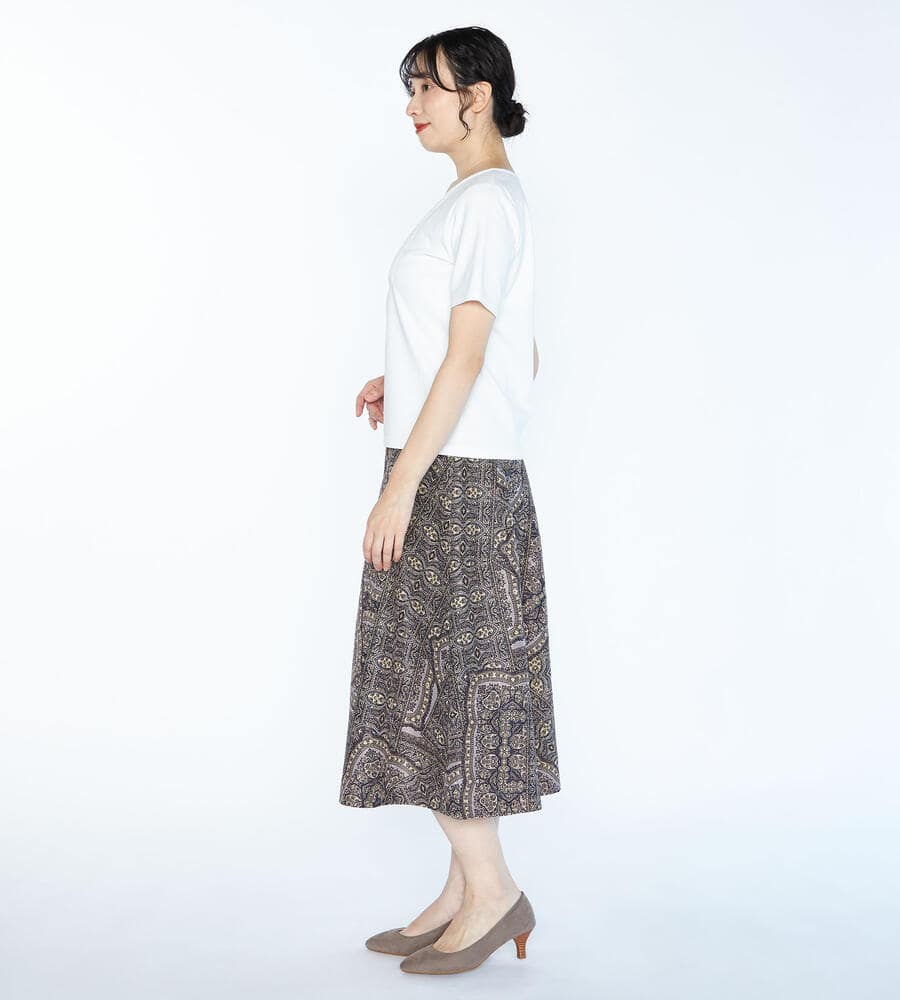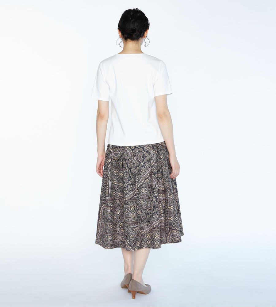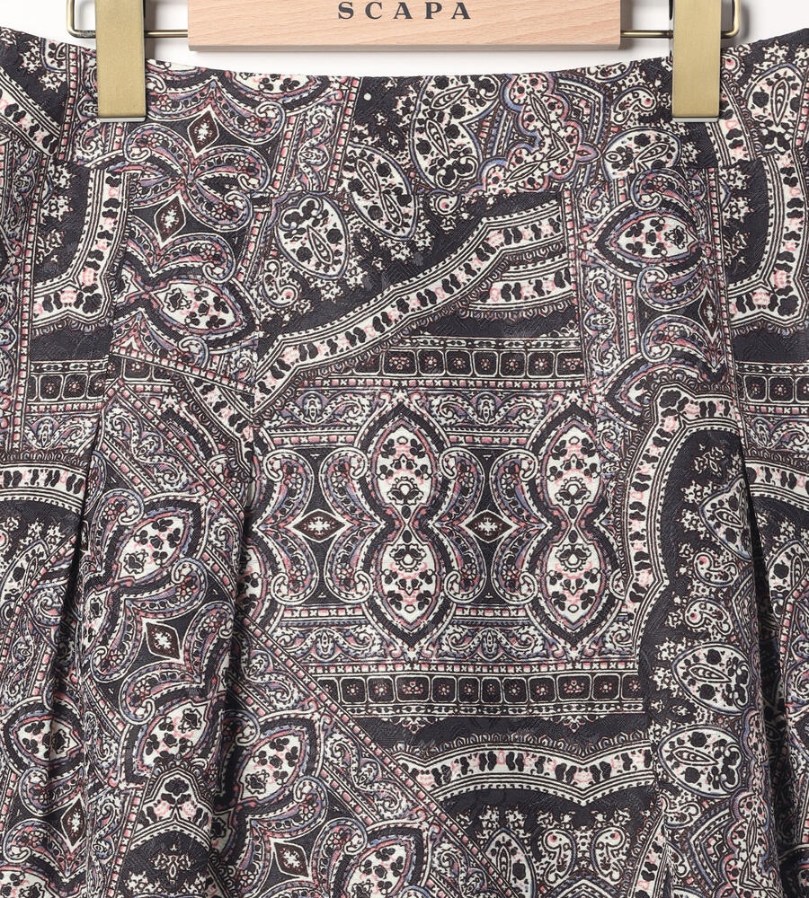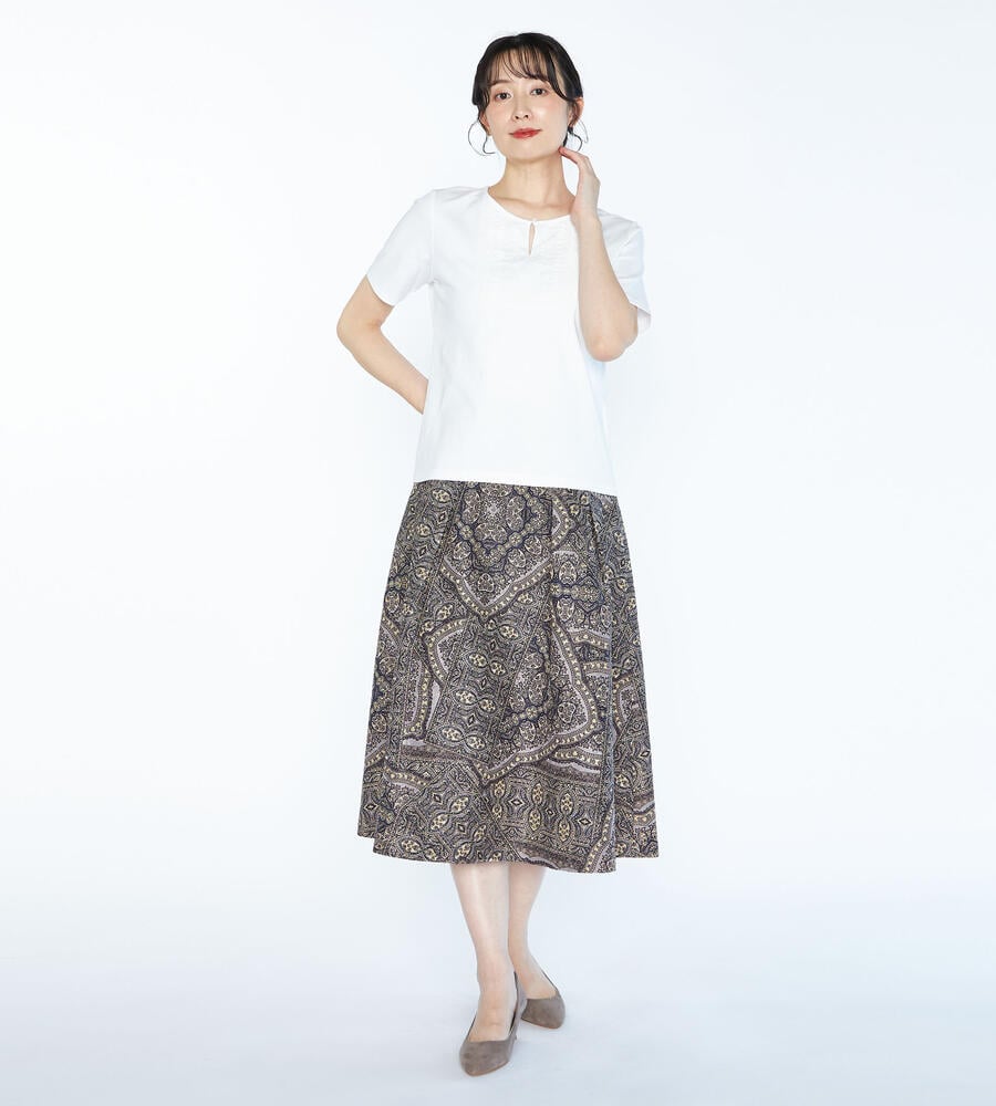 オリエンタルなムード漂う繊細な模様が描かれたジャカードサラサスカート。裾に向かって緩やかに広がるフレアシルエットが美しく、スタイリングの主役にふさわしい華やかさと上品さを兼ね備えています。トップスはシンプルなブラウスやニットと合わせて着こなしていただくと洗練された表情に。