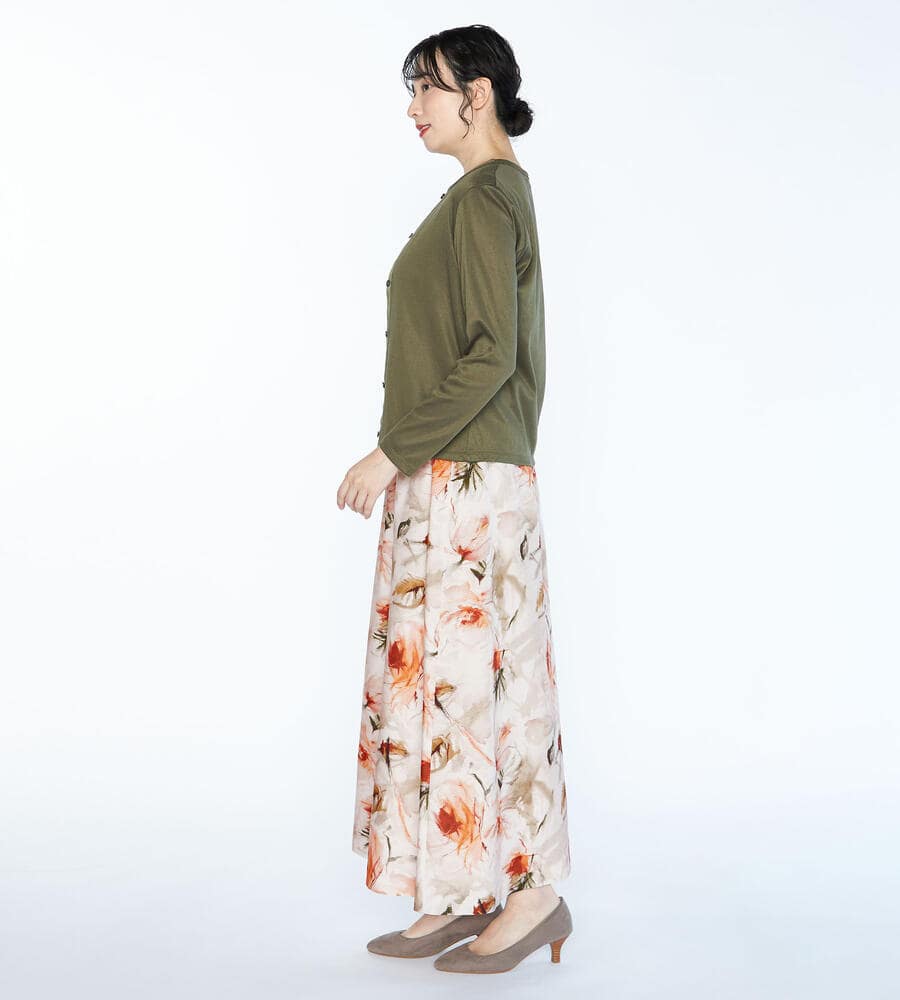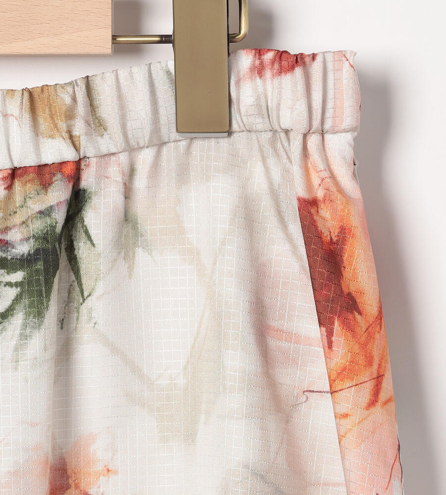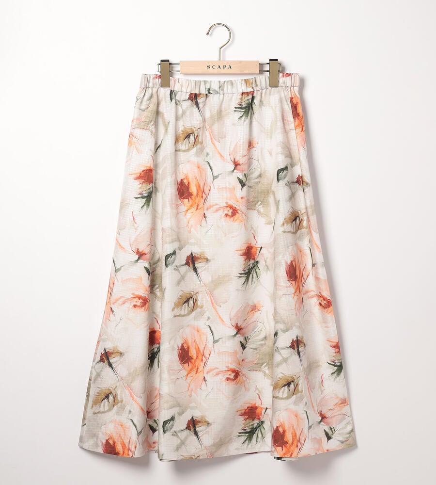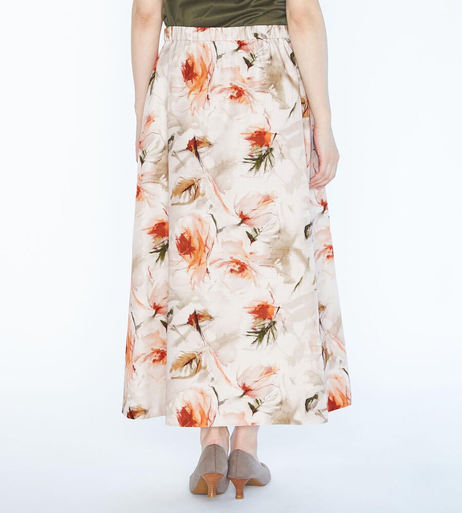 格子状の織りで仕上げた素材に、水彩画のようなボタニカルプリントを乗せたスカート。独特の光沢感と軽やかな量感で、春夏のスタイリングを格調高く映し出す1点です。ウエストをゴム仕立てにしており、ゆったりと身に着けられるのも特徴。着こなしの品位をキープできる、ロング丈を採用しています。ロング丈ながらも重く見えないのがポイントです。