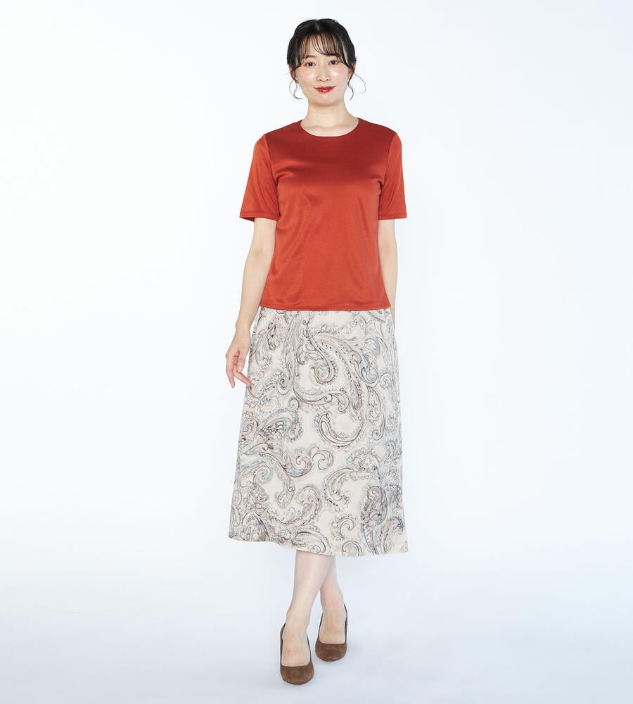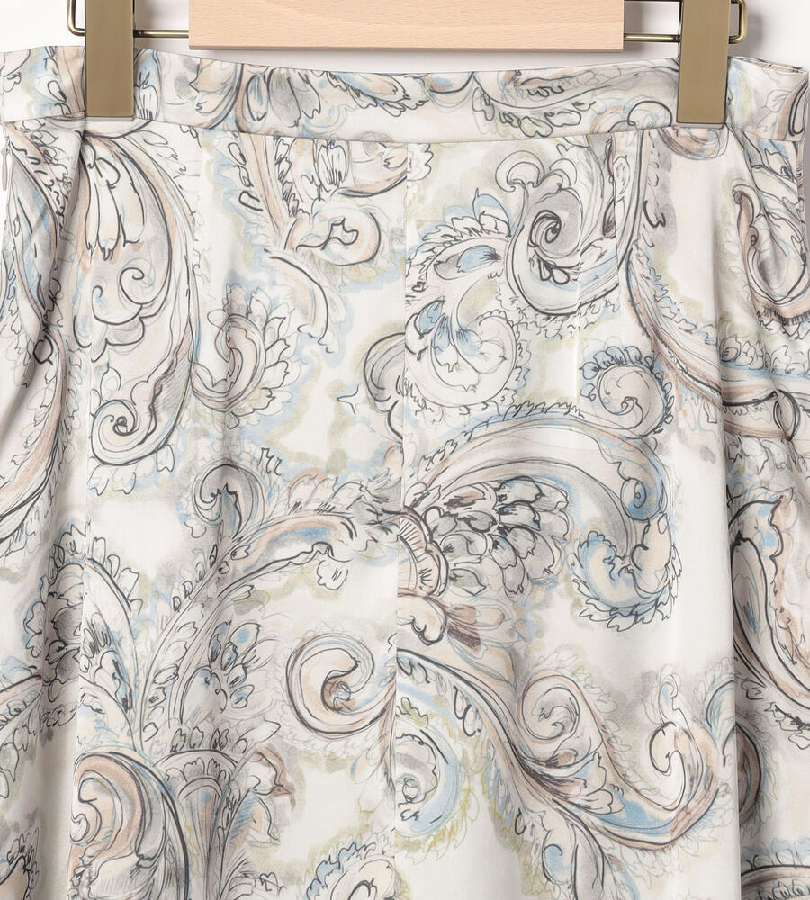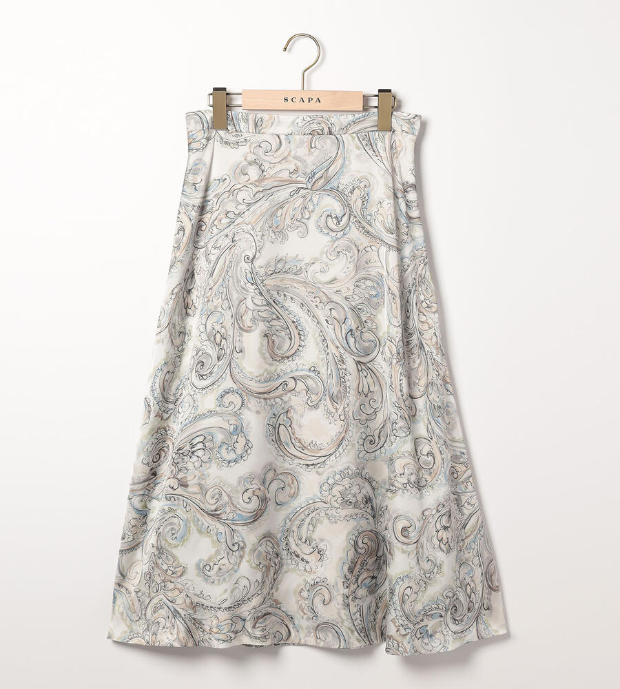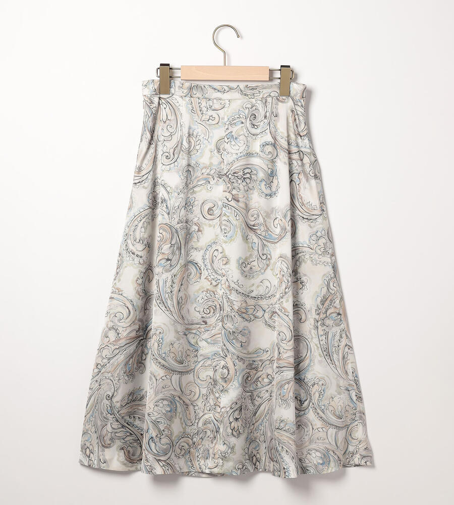 軽やかで優美な動きを持つポリエステル素材を用いたフレアスカートです。手描きタッチのペーズリー柄を載せ、絵画のように美しく仕上げています。膝が隠れる程度の着丈で、格調高い着こなしを後押しする1点。広がりが控えめなため、すっきりとしたスタイリングをお楽しみいただけます。裏地が付いており安心感のある穿き心地。