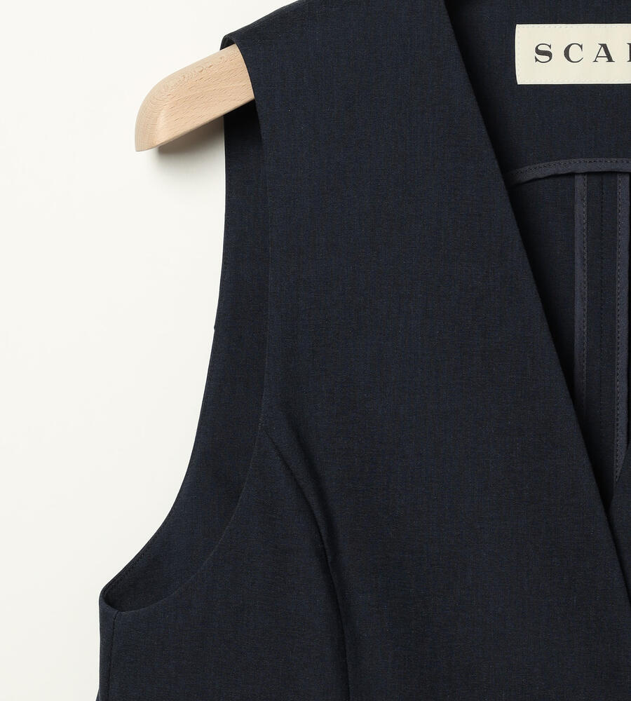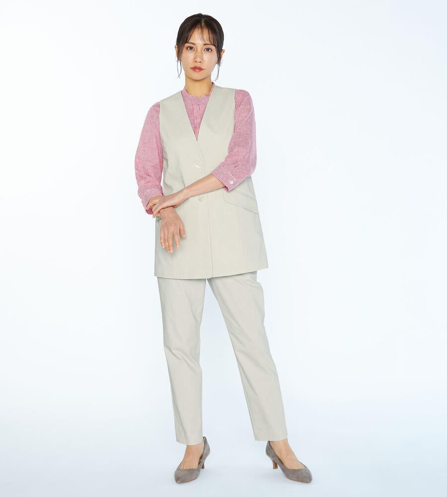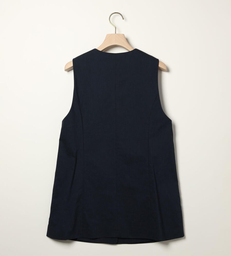ロング丈でエレガントに仕上げたマニッシュなベスト。インナーとのレイヤードスタイルを楽しめる深めのVネックデザインが特徴です。フロントは3つボタン、左右にフラップポケットを配置。ストレッチコットン素材を採用しています。腰まわりをカバーする着丈が着心地の良さのポイント。