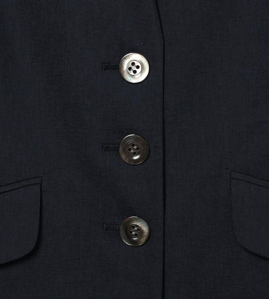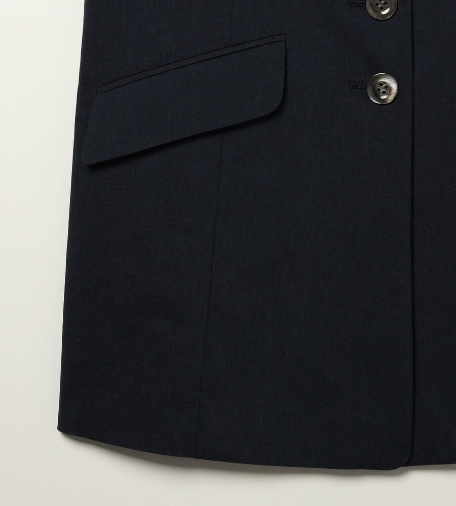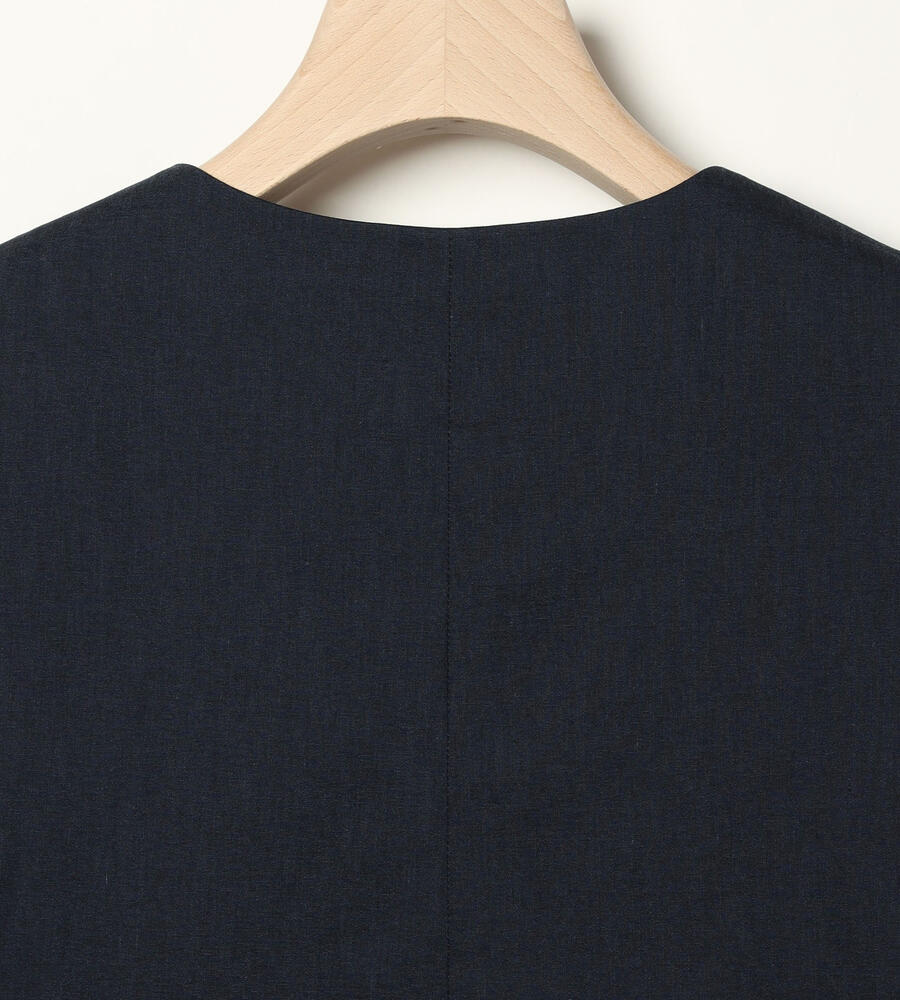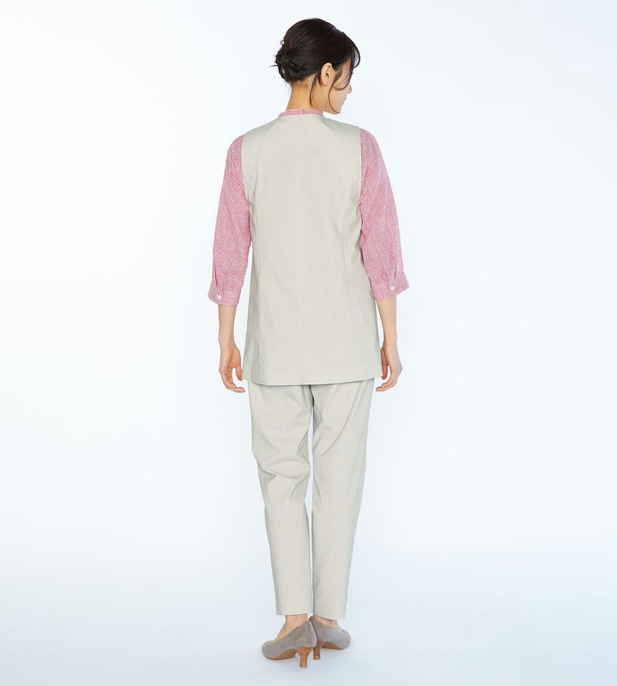 ロング丈でエレガントに仕上げたマニッシュなベスト。インナーとのレイヤードスタイルを楽しめる深めのVネックデザインが特徴です。フロントは3つボタン、左右にフラップポケットを配置。ストレッチコットン素材を採用しています。腰まわりをカバーする着丈が着心地の良さのポイント。