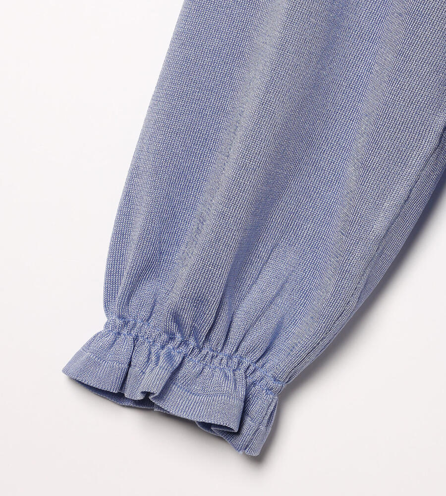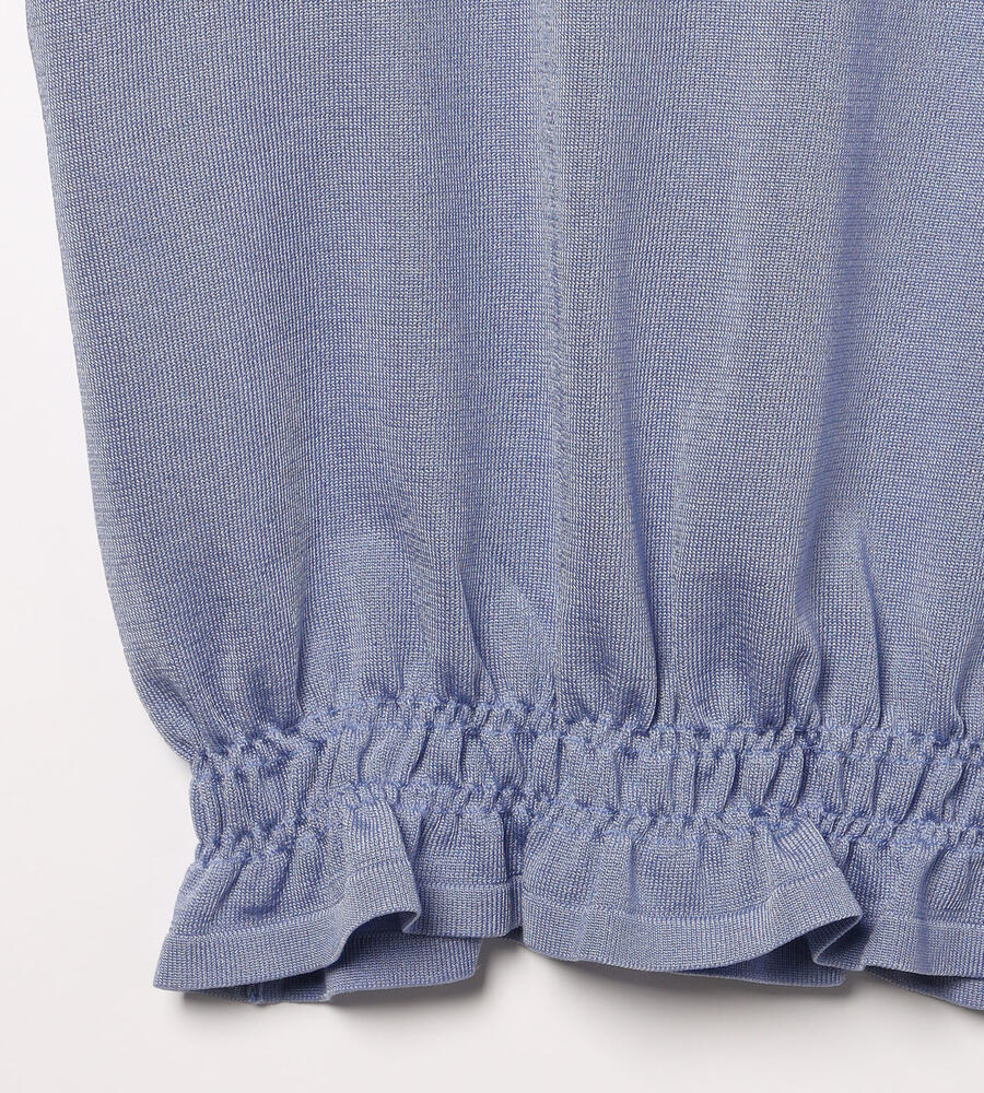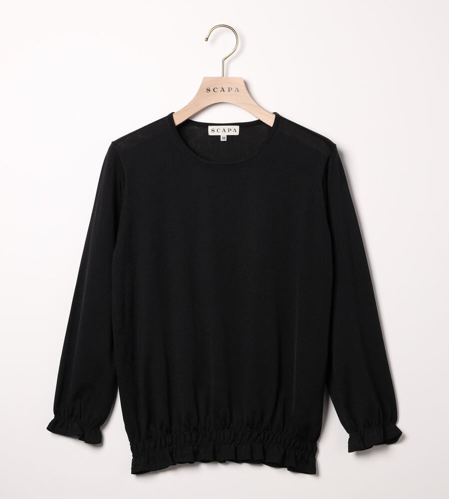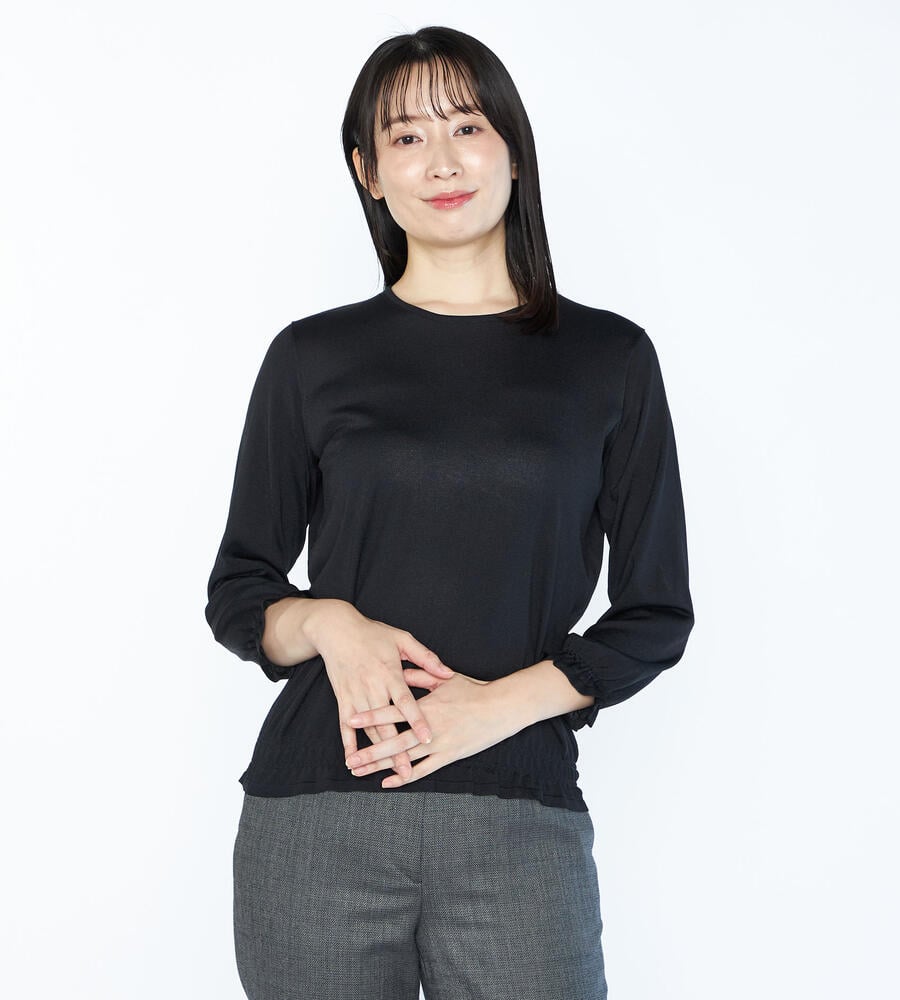 袖口と裾にシャーリングをあしらい、大人フェミニンなディテールを取り入れたシャインニットプルオーバー。表情を明るく見せてくれる上品な光沢素材でさりげない華やかさを演出。手首の見える袖丈がスタイリングを軽やかな雰囲気に仕上げてくれるアイテムです。