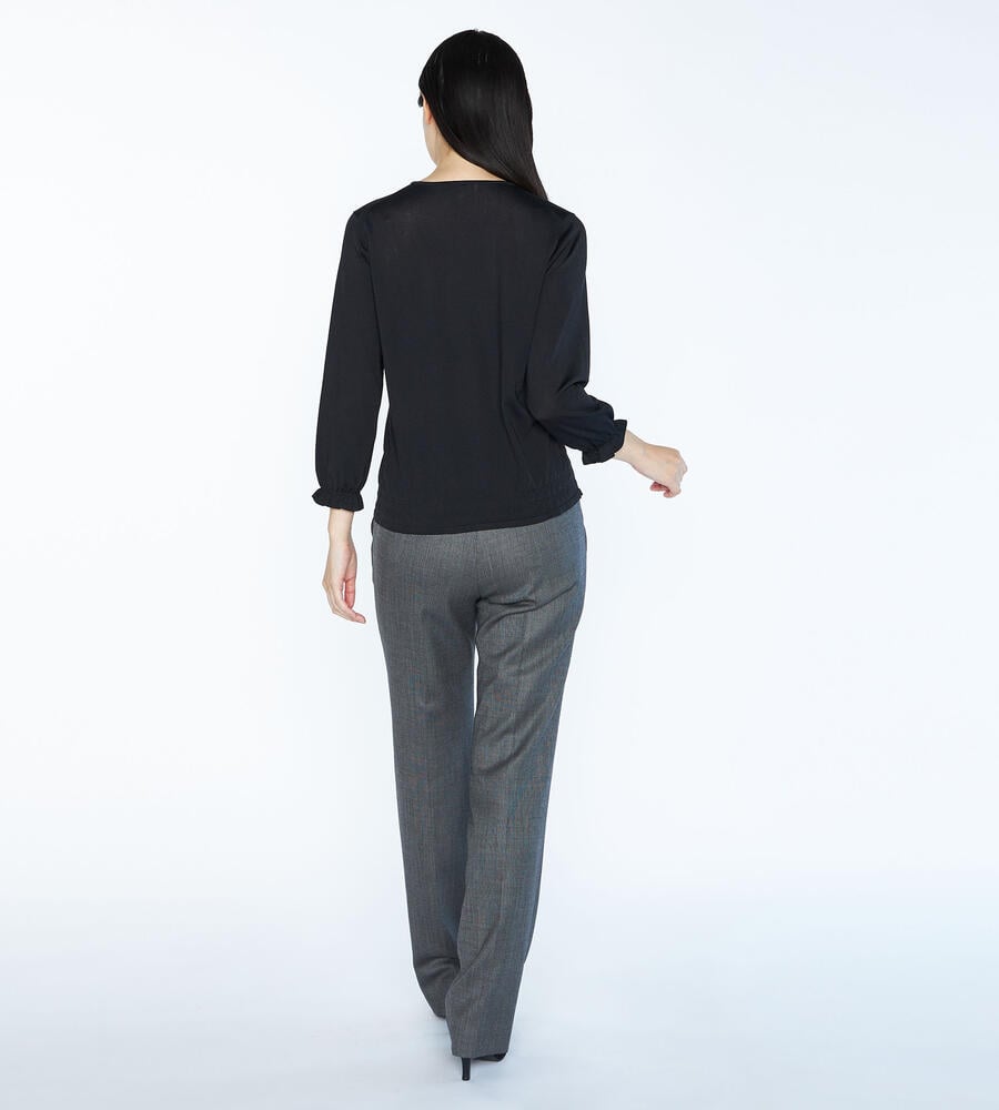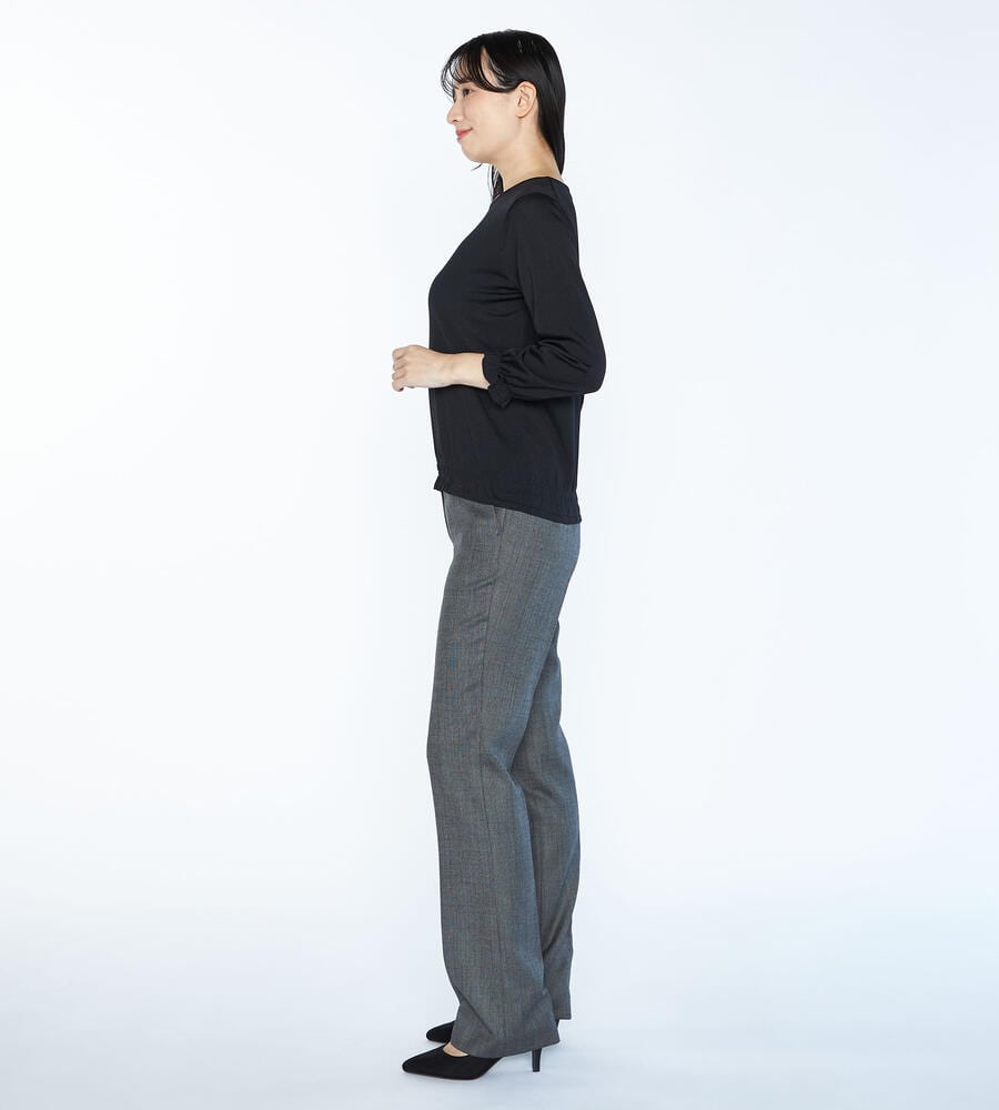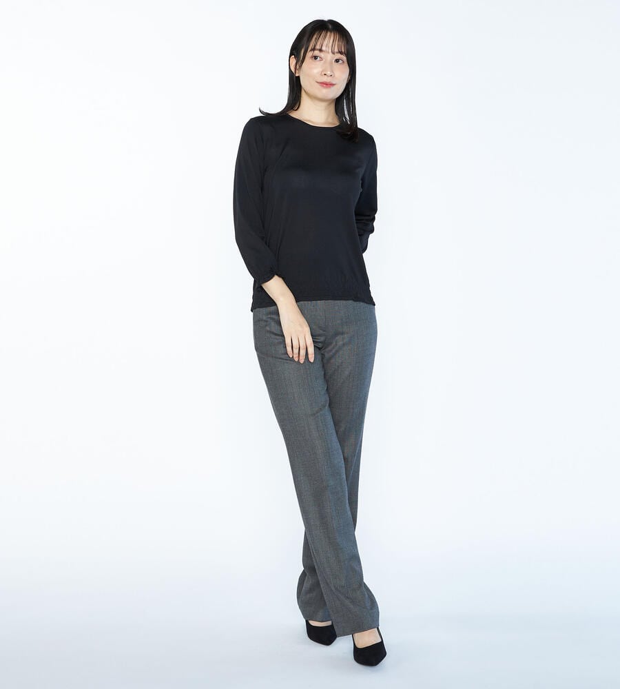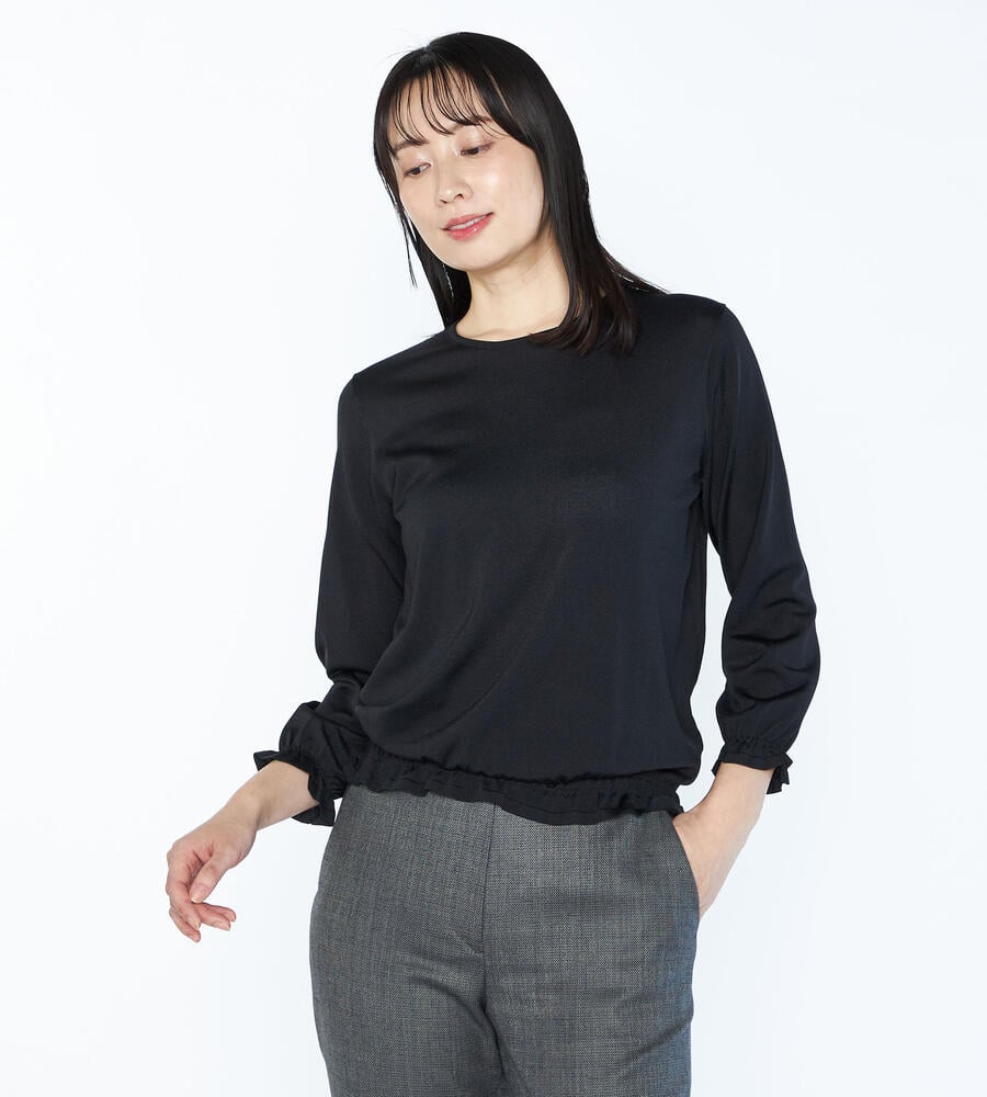 袖口と裾にシャーリングをあしらい、大人フェミニンなディテールを取り入れたシャインニットプルオーバー。表情を明るく見せてくれる上品な光沢素材でさりげない華やかさを演出。手首の見える袖丈がスタイリングを軽やかな雰囲気に仕上げてくれるアイテムです。