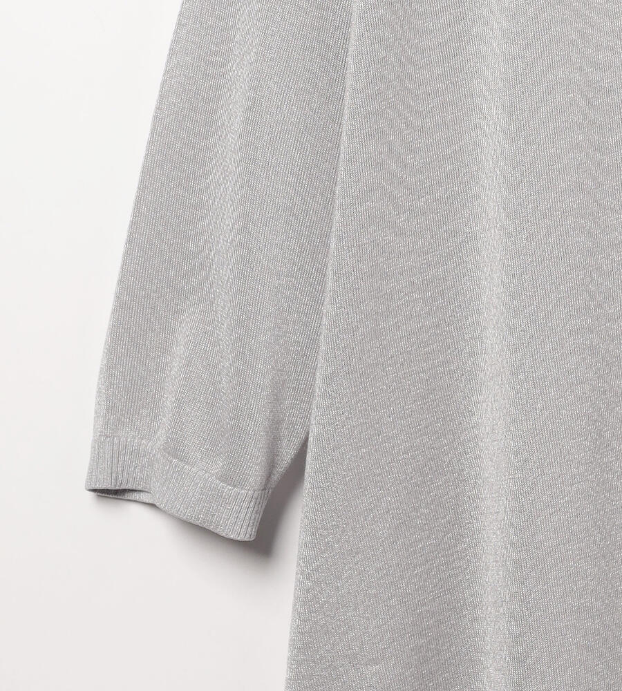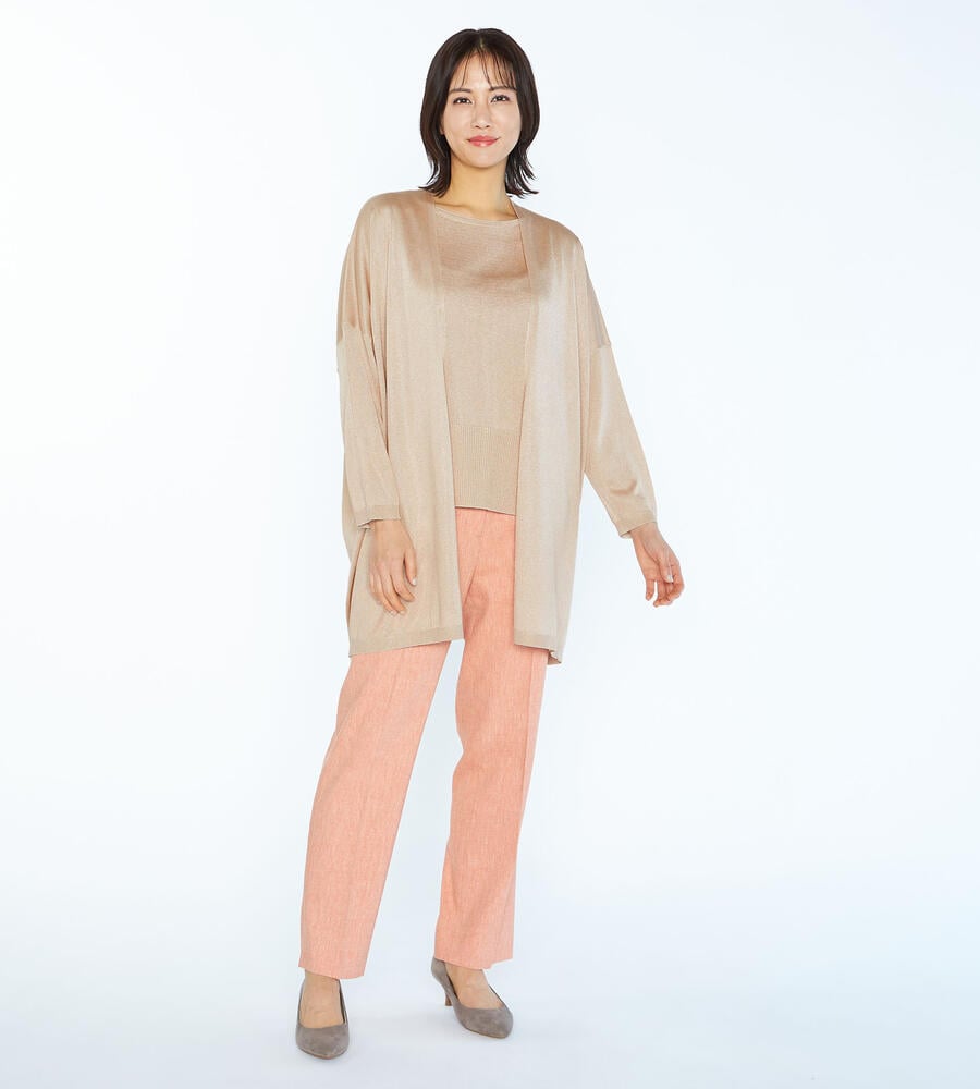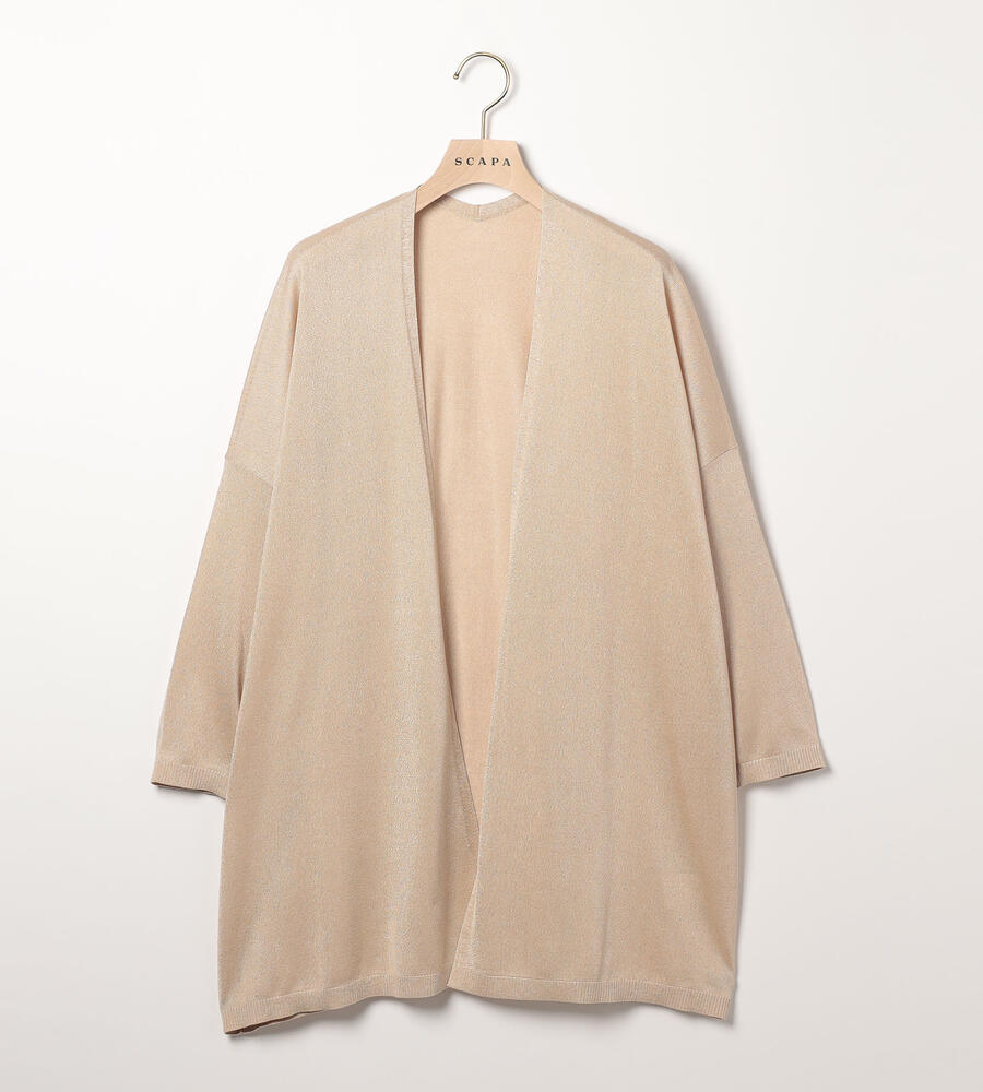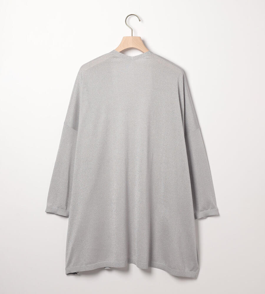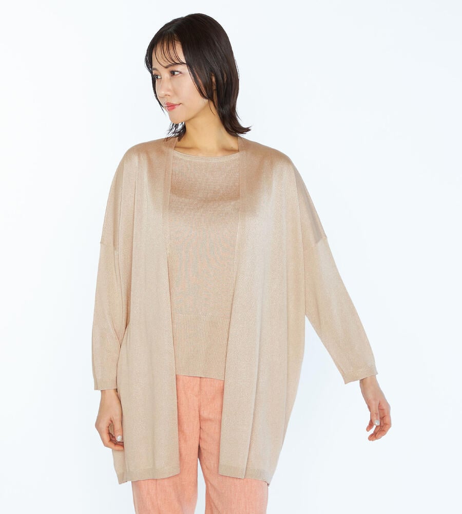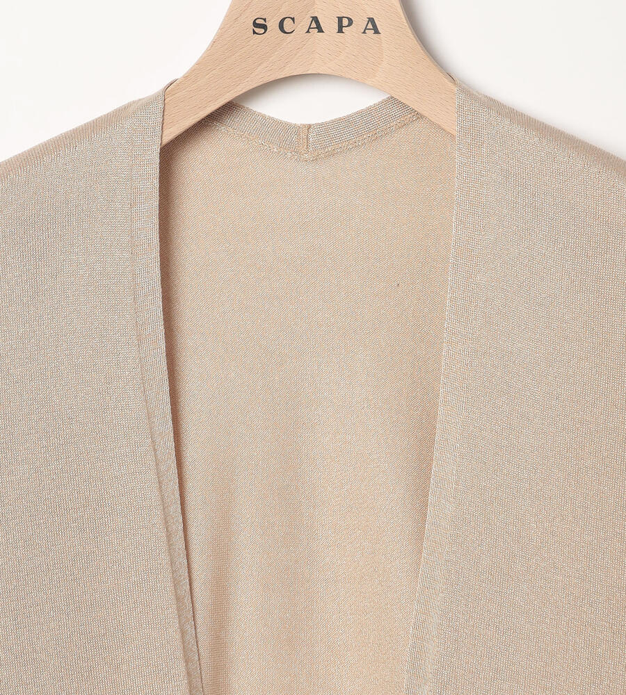 上品な光沢と透け感のあるニット素材を用いたカーディガンです。ヒップが隠れる程度の着丈と留め具のないデザインで、エレガントな表情に仕上げています。肩まわりに程良いゆとりがあり、Tシャツなどの上からも羽織りやすい仕立て。オンオフ問わず、多彩なシーンに活躍する洗練度の高いアイテムです。