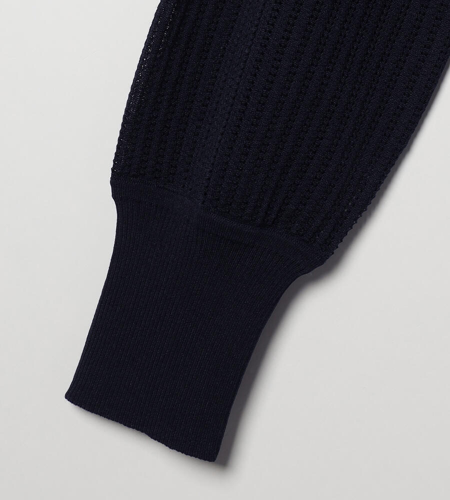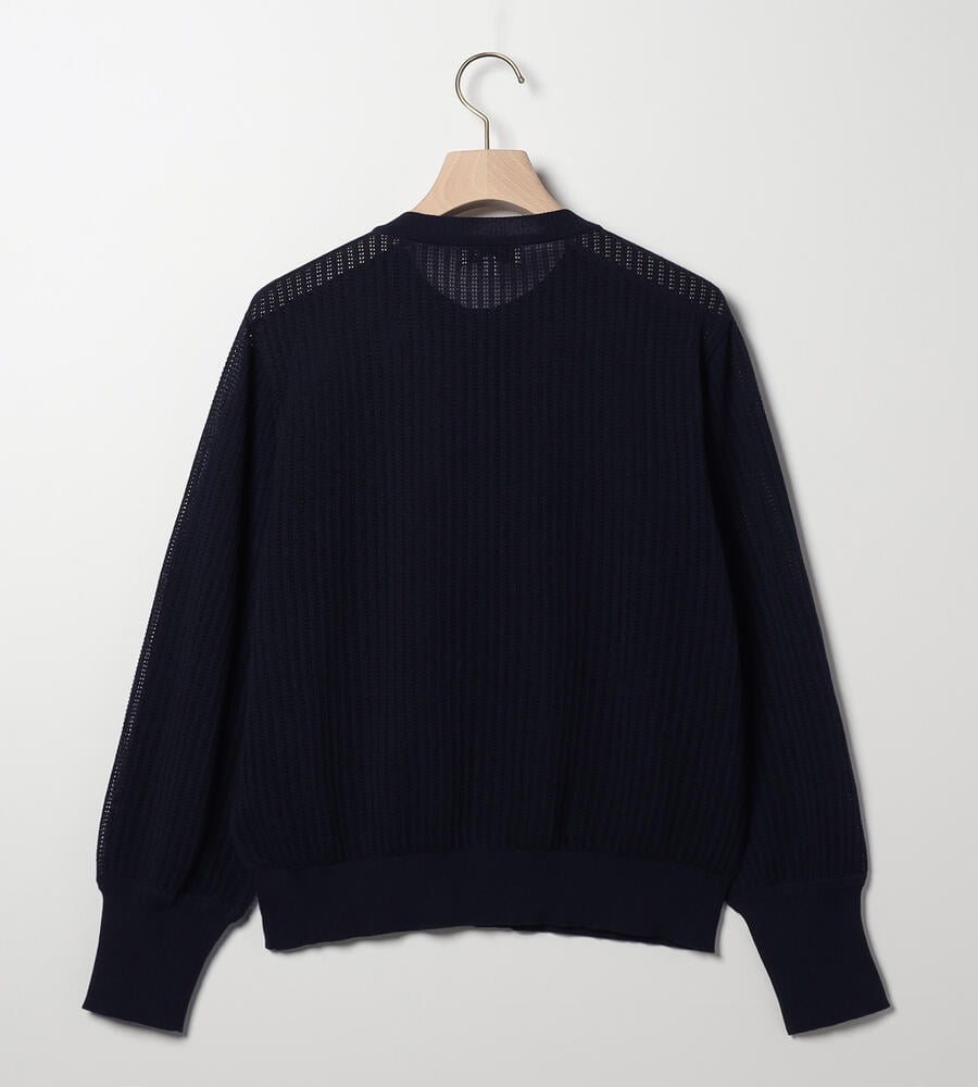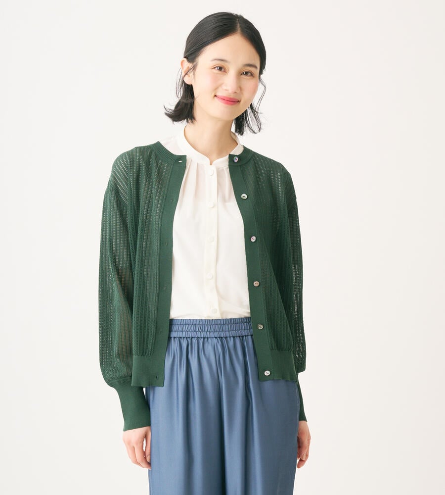 シアーな透かし編みのニットカーディガン。透け過ぎない上品なデザインで、大人のトレンドスタイルにおすすめの一着です。シルエットは適度なゆとりがあり、袖口や裾部分はすっきりとしたリブ仕様。トップス感覚でも羽織りとしても活躍し、同シリーズのニットとアンサンブルでも着用可能です。