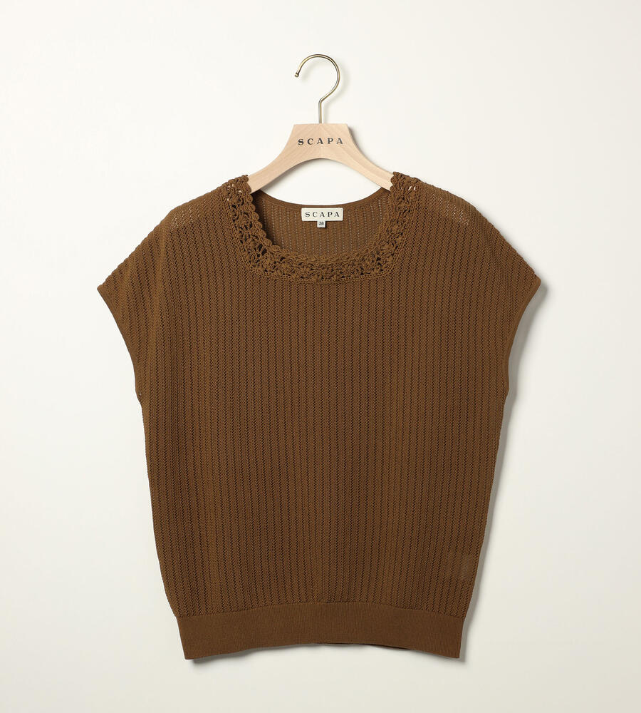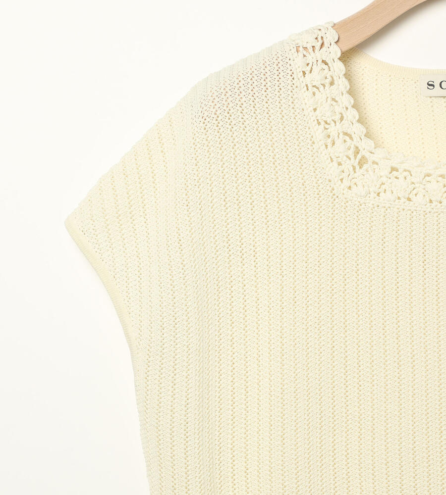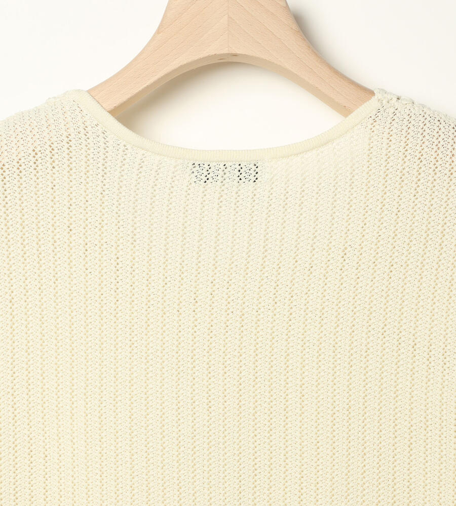 春夏シーズンにぴったりなフレンチスリーブニット。ローゲージに編まれた透け感のある涼やかなムードが特徴。首周りのレース編みがエレガントなデザインポイント。シンプルなデザインで様々なボトムとマッチ。お手持ちのボトムにプラスして、エレガントな雰囲気のコーディネートが実現するアイテムです。