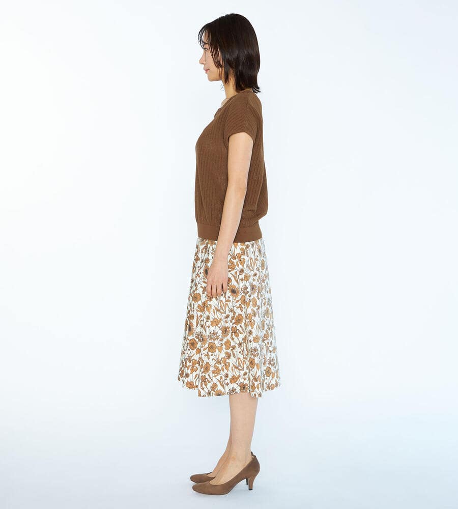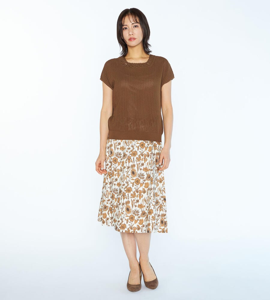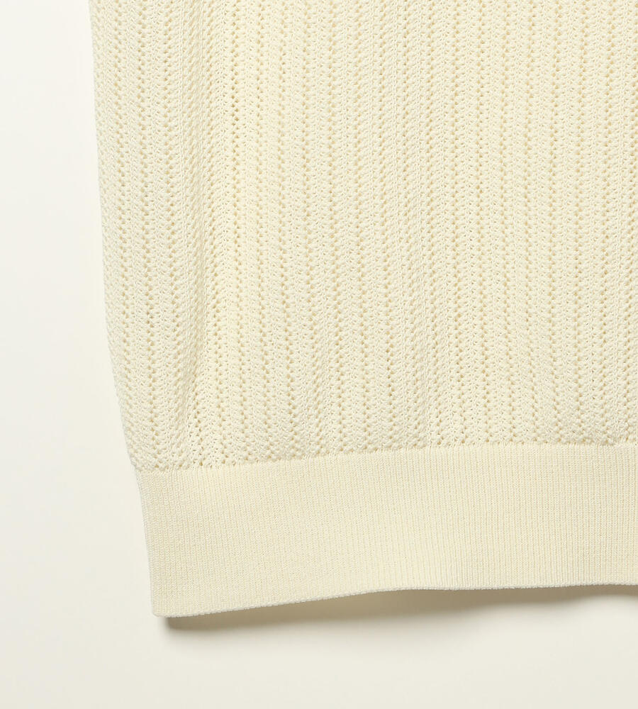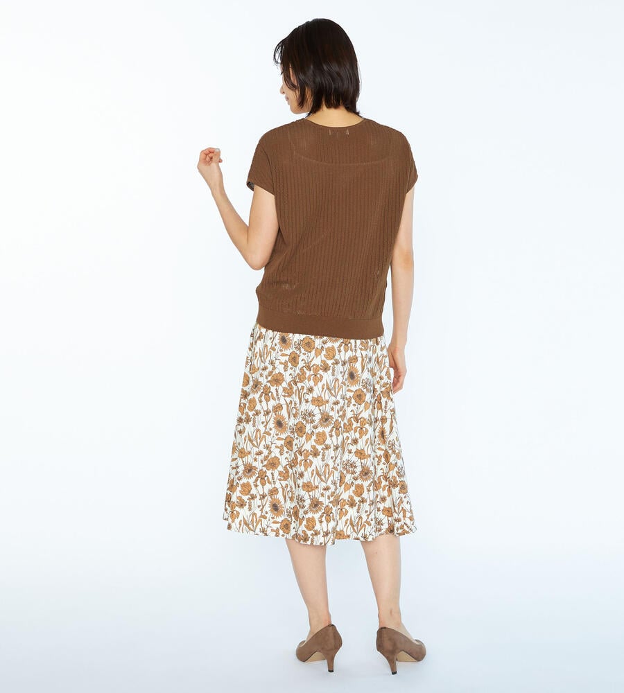 春夏シーズンにぴったりなフレンチスリーブニット。ローゲージに編まれた透け感のある涼やかなムードが特徴。首周りのレース編みがエレガントなデザインポイント。シンプルなデザインで様々なボトムとマッチ。お手持ちのボトムにプラスして、エレガントな雰囲気のコーディネートが実現するアイテムです。