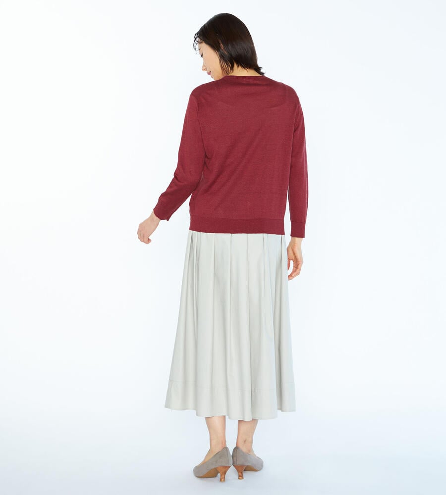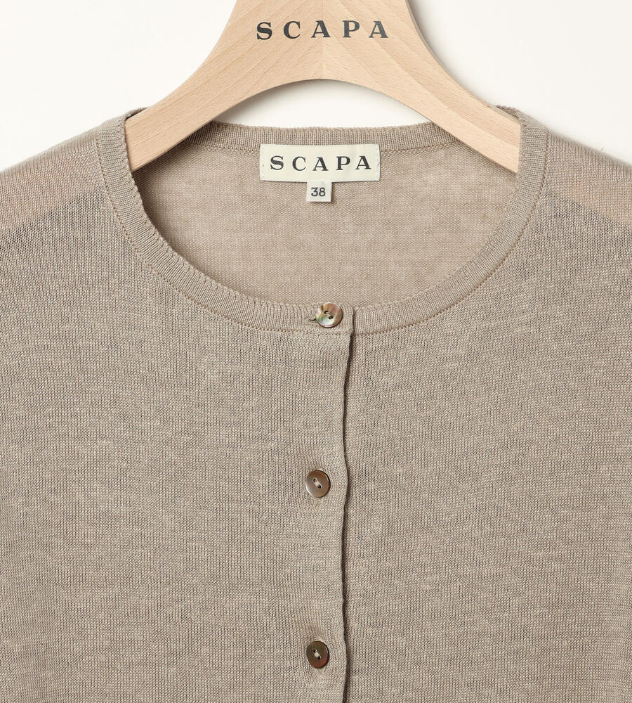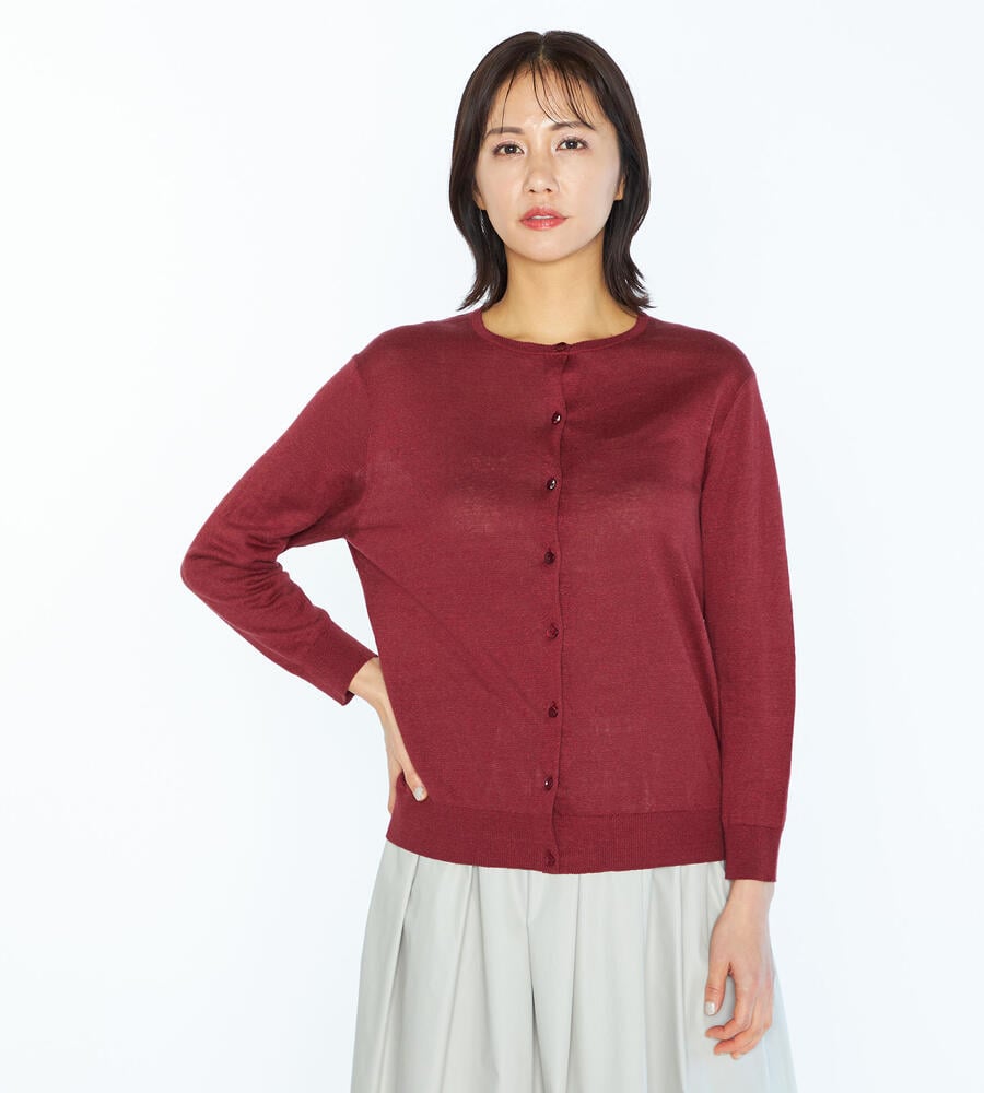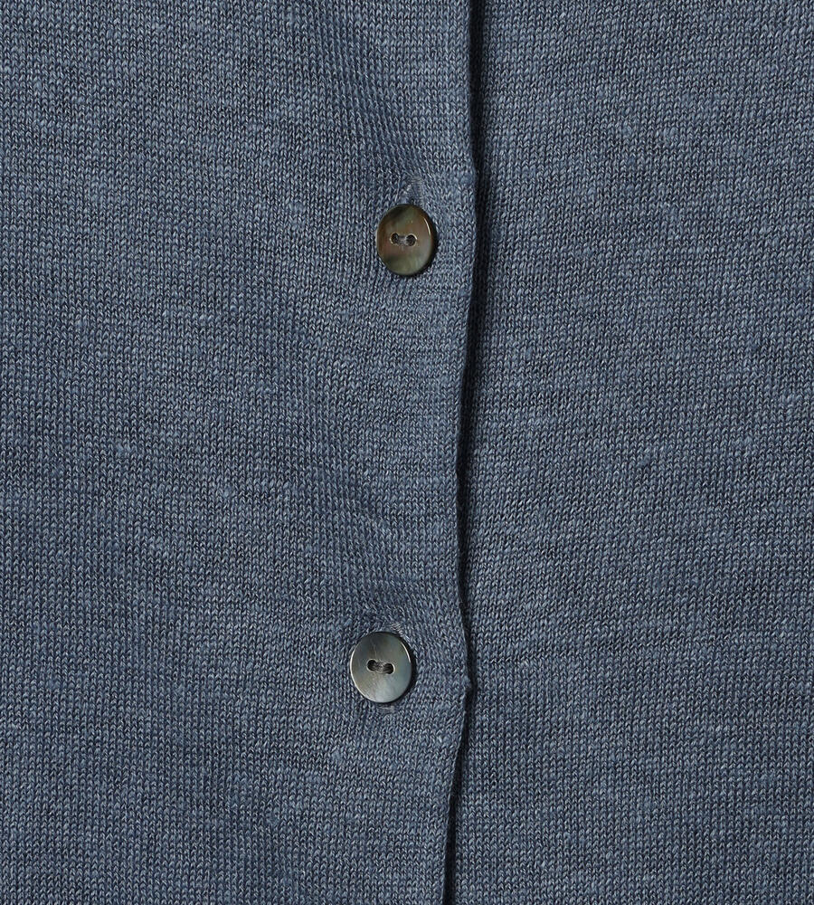 うっすらと透ける薄手のラウンドネックニットカーディガン。通気性の高い麻100%素材で、見た目にも着心地にも涼しげな一枚です。洗練されたベーシックなデザイン、すっきり品のあるシルエット、リブ仕様の裾なども特徴。羽織りとしてもトップス感覚でも着用でき、同生地の半袖ニットとアンサンブルでも楽しめます。