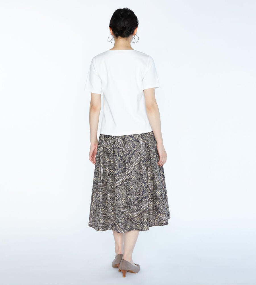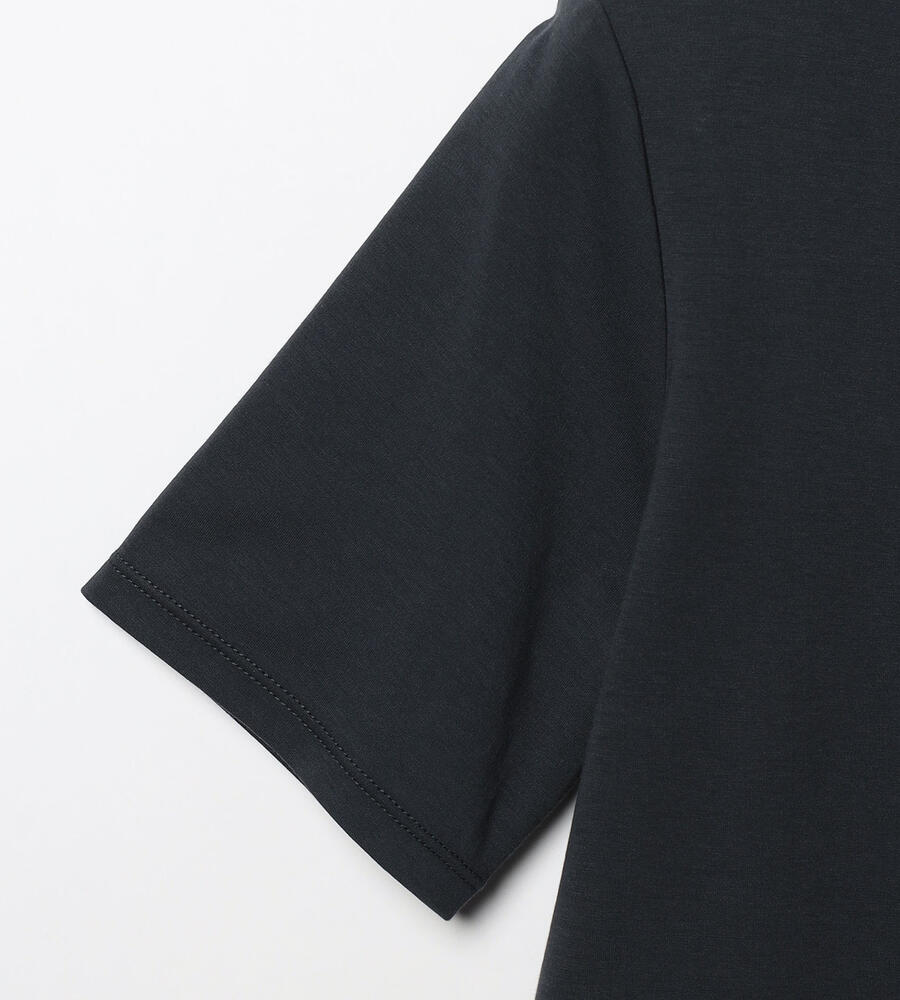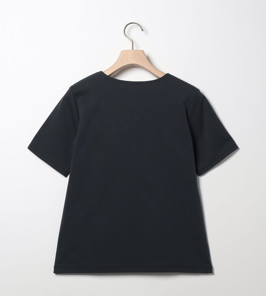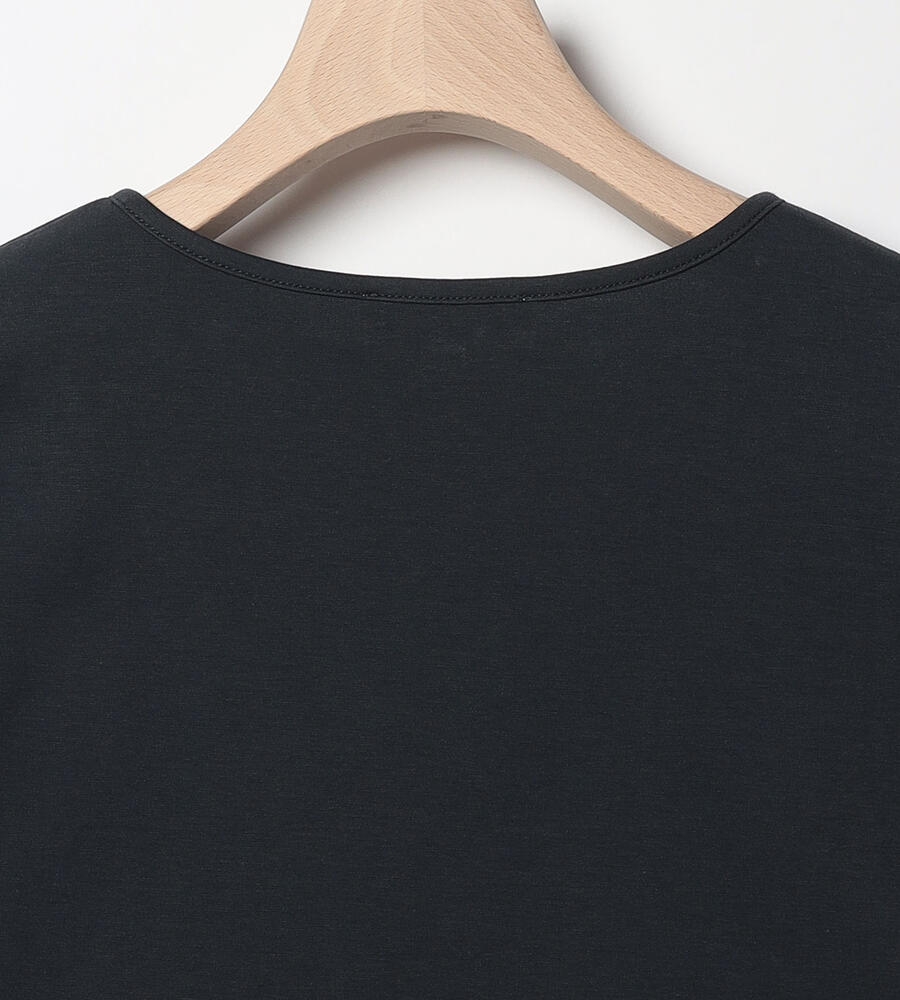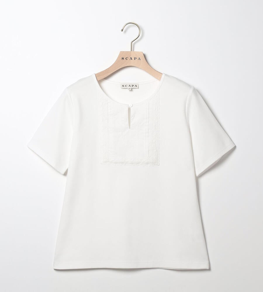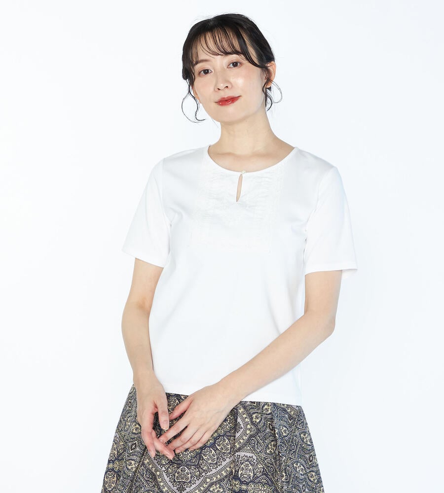 肌当たりの良いコットンのジャージー素材を用いたカットソー。フロントにエンブロイダリーを施し、シンプルさに華やかなアクセントをプラスしています。身体にすっきりと沿うシルエットのため、上からアウターやジャケットなどを羽織りやすいのもポイント。春先から夏まで長く活躍するアイテムです。