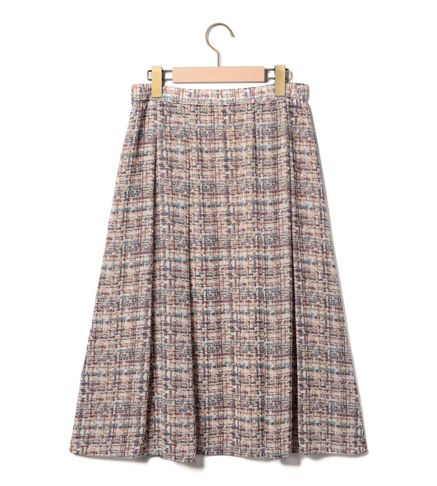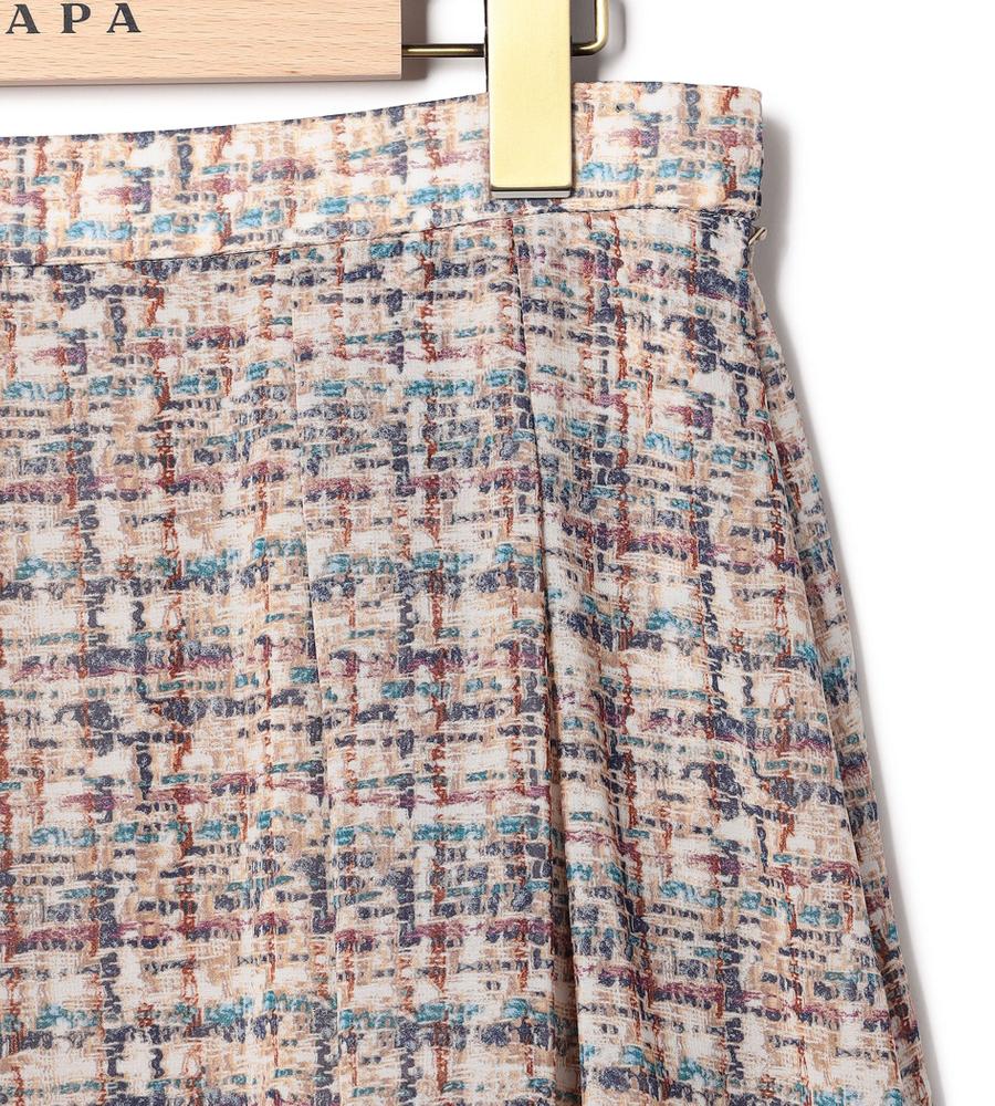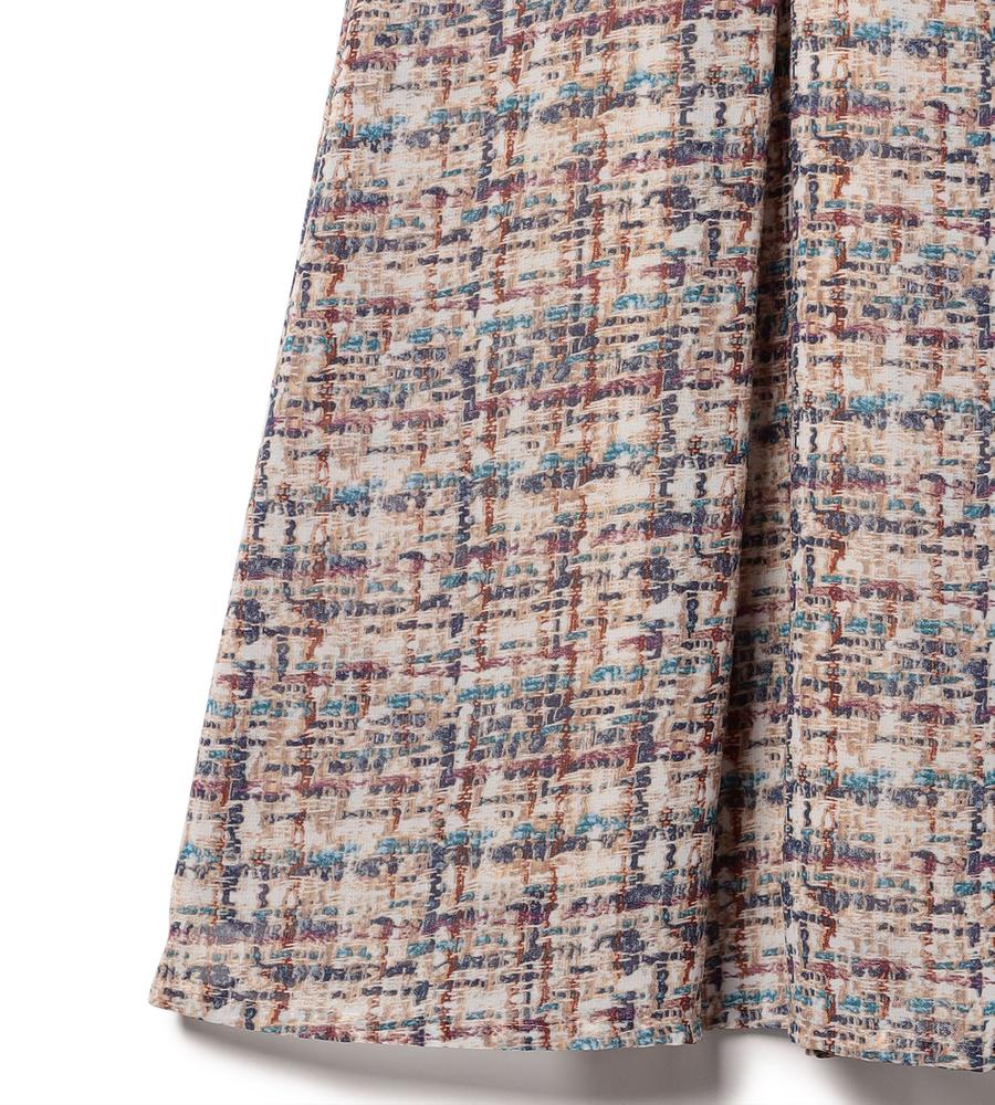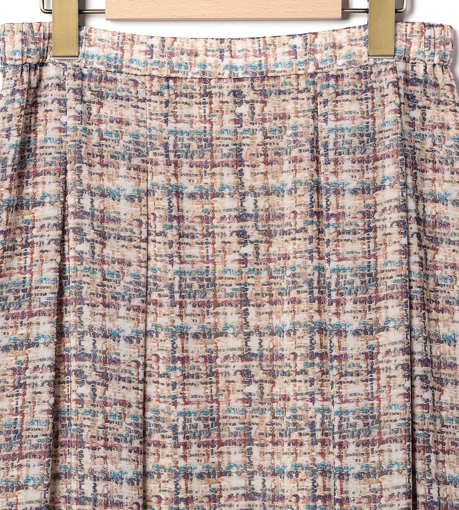 繊細なツイード調プリントがコーディネートの主役になるスカート。さりげないドレープの入ったデザインが、優雅な着こなしを叶えてくれそう。甘くなりすぎないフェミニンスタイルを楽しみたい日にもおすすめの一枚です。