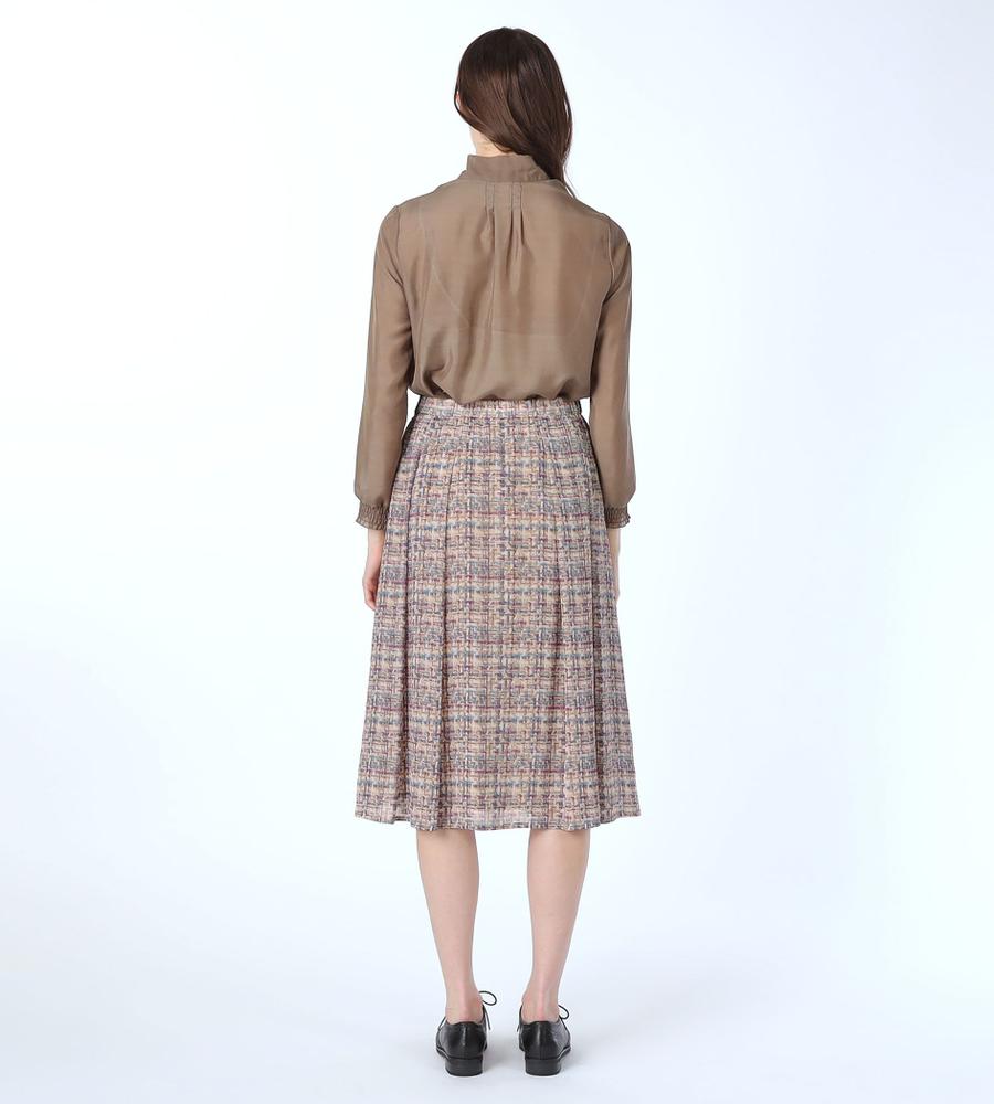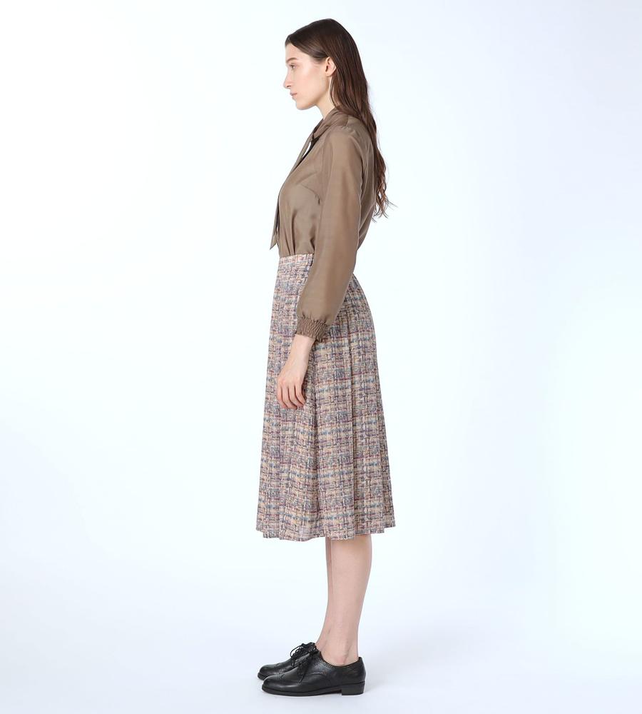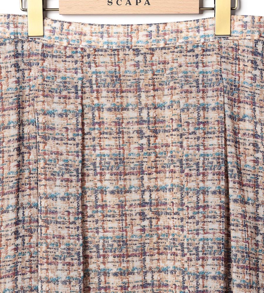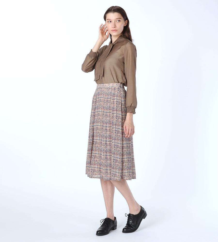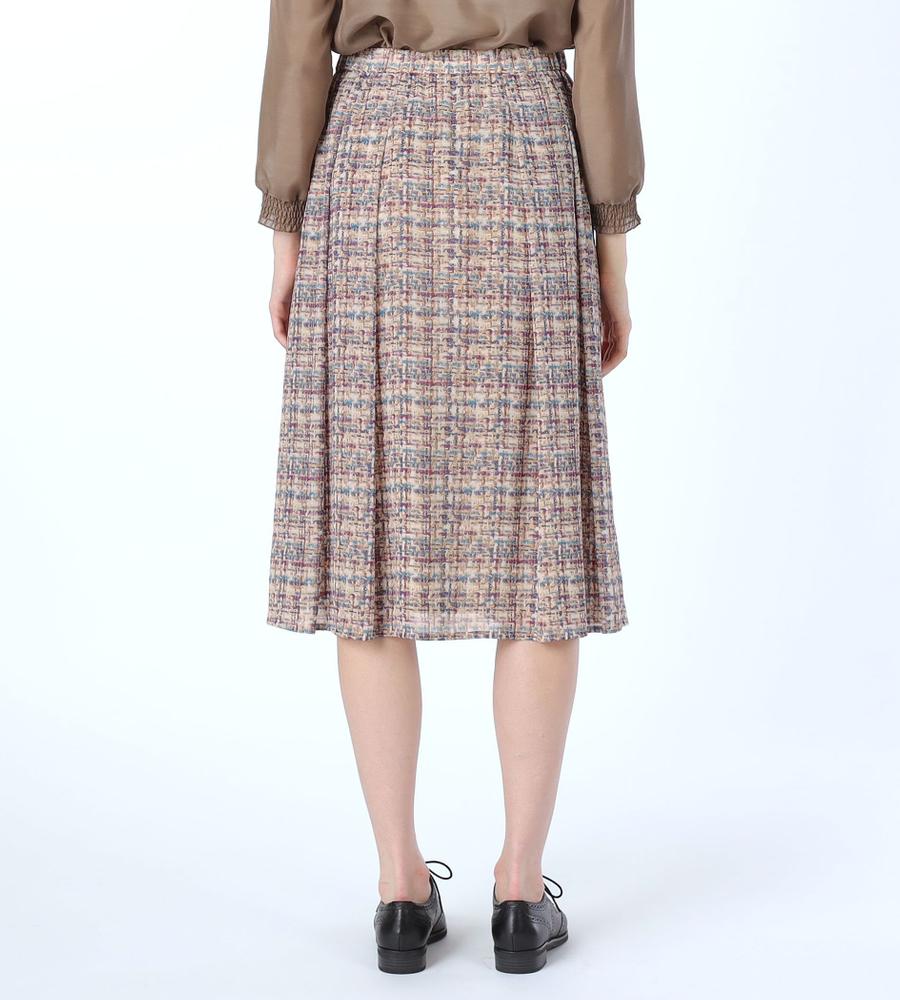 繊細なツイード調プリントがコーディネートの主役になるスカート。さりげないドレープの入ったデザインが、優雅な着こなしを叶えてくれそう。甘くなりすぎないフェミニンスタイルを楽しみたい日にもおすすめの一枚です。