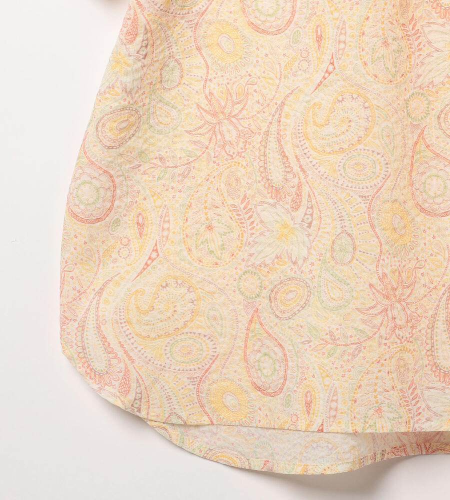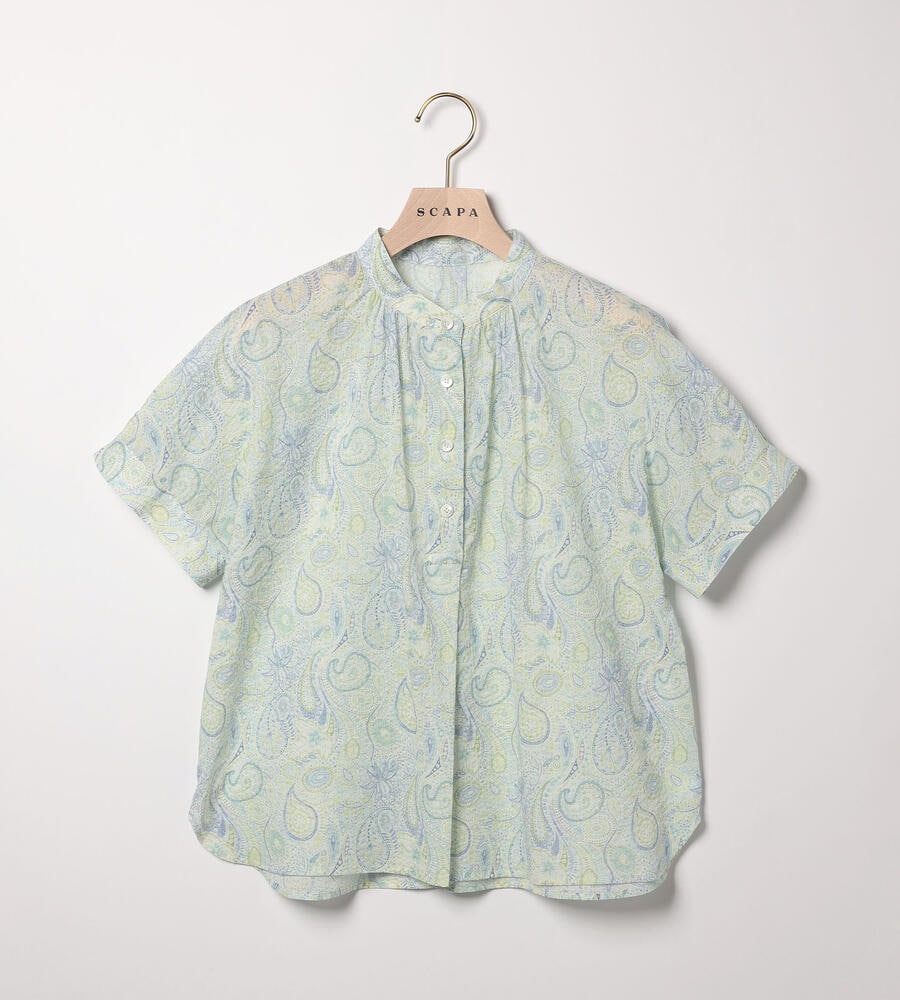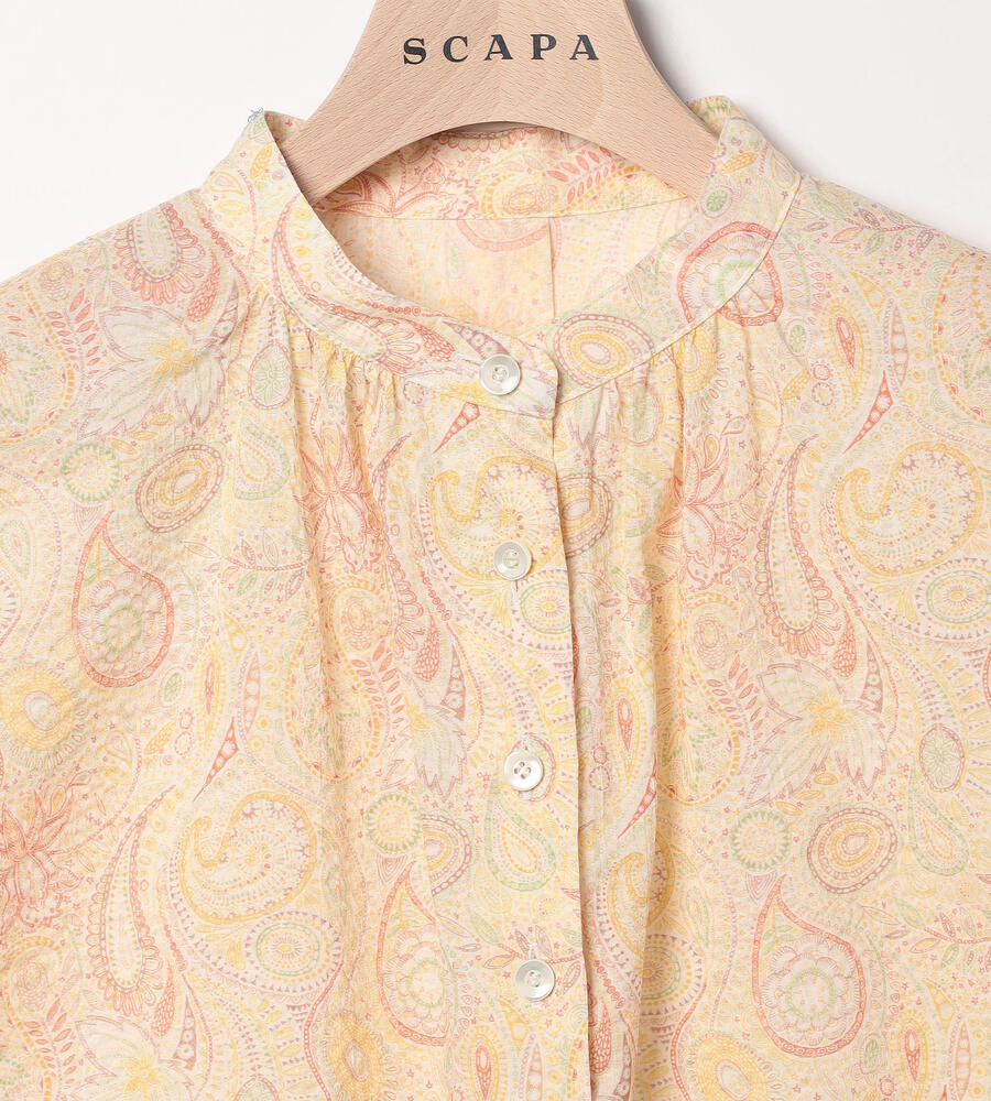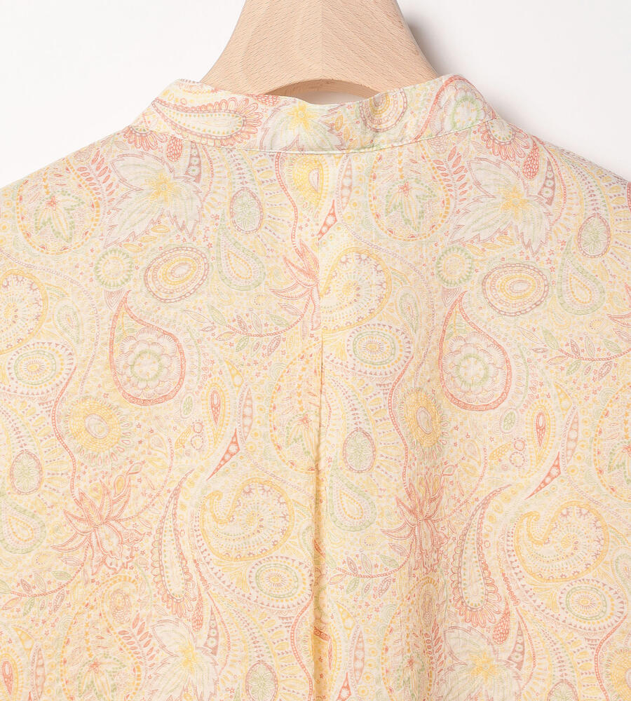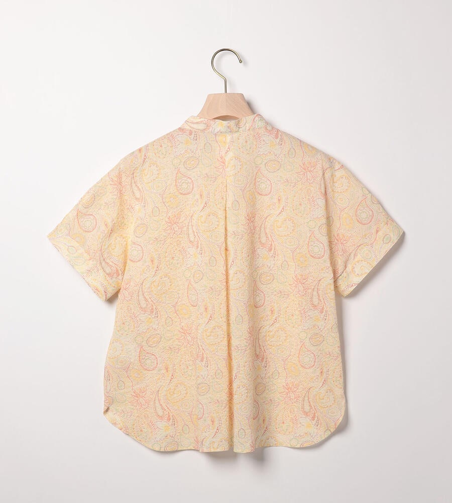 エスニック感あふれるペイズリー柄を、淡く明るい配色でデザインしたブラウス。スタイリッシュな印象のスタンドカラーを採用しています。衿回りにはさりげなくギャザーを施して、フェミニンをプラス。薄手の生地感の軽やかさが夏らしいリゾートコーディネートにもぴったりです。着丈は少し短めですっきりと着こなせます。