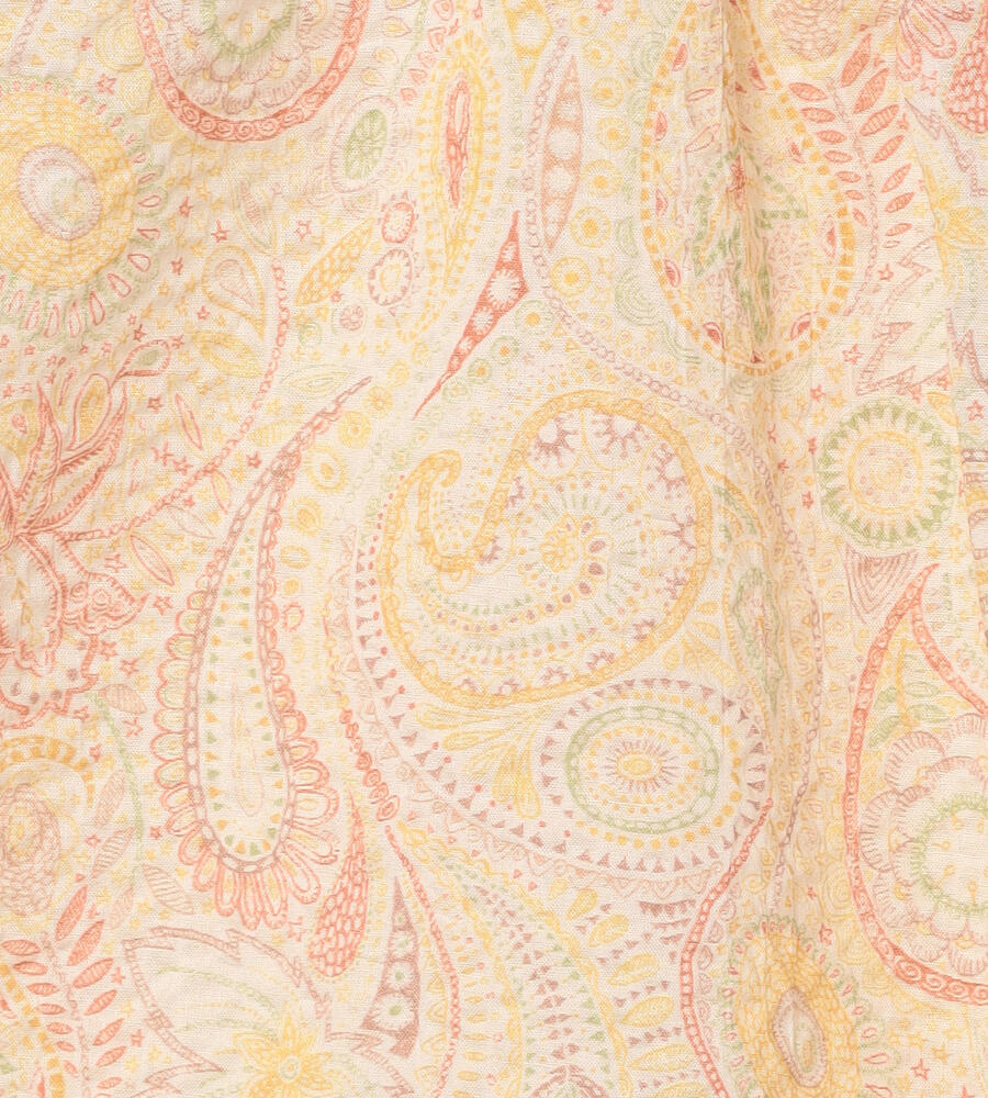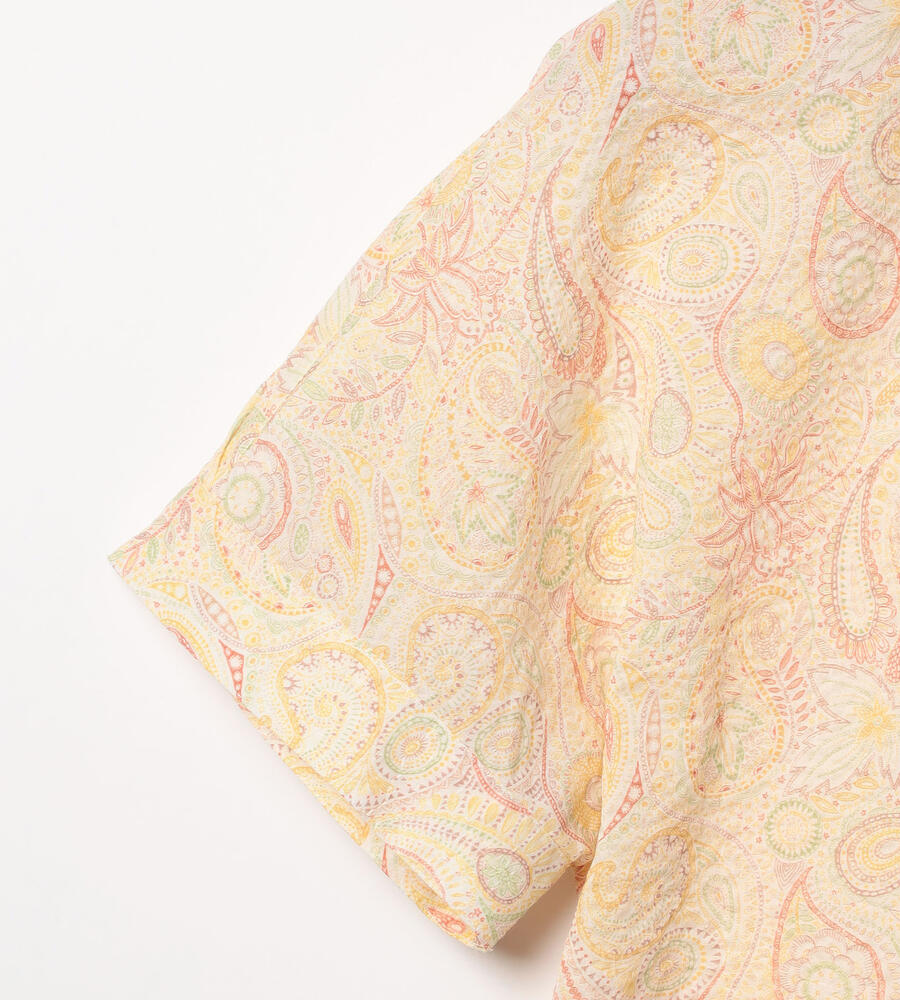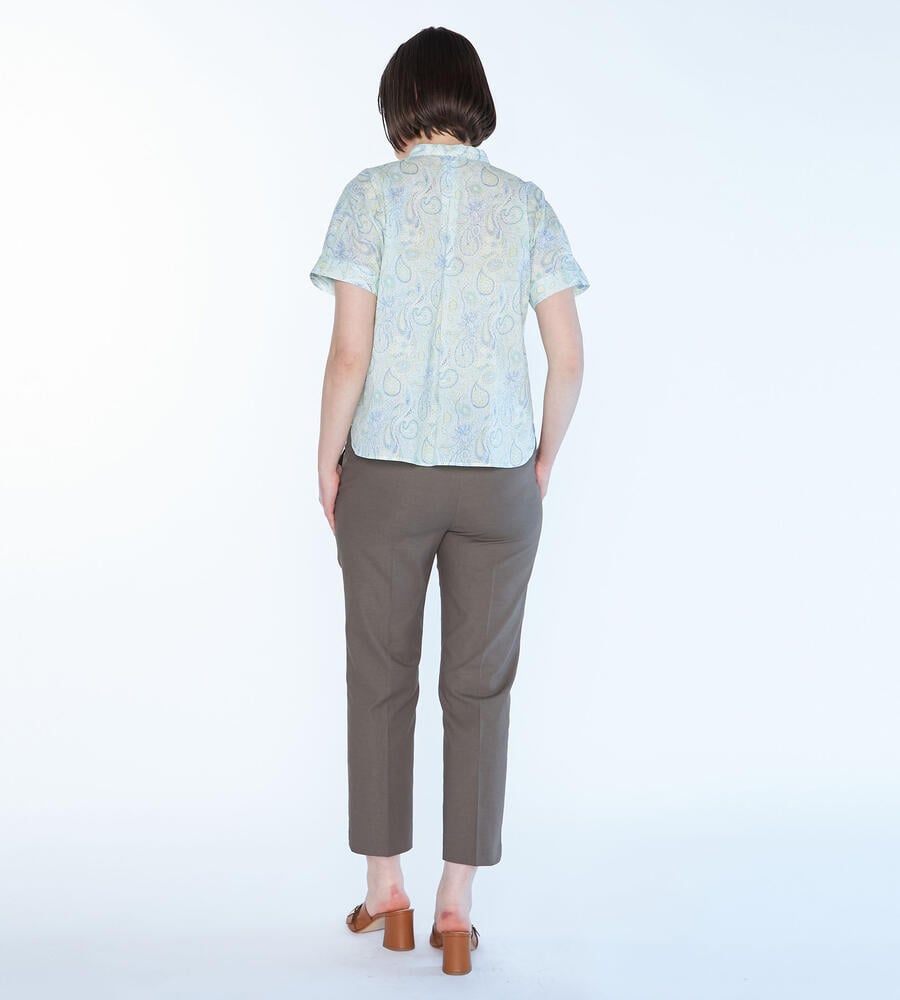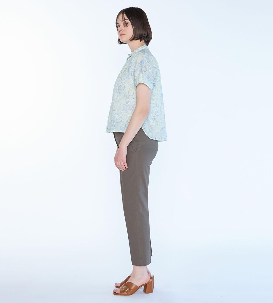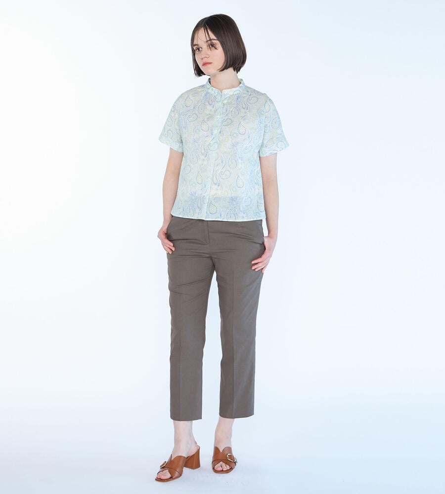 エスニック感あふれるペイズリー柄を、淡く明るい配色でデザインしたブラウス。スタイリッシュな印象のスタンドカラーを採用しています。衿回りにはさりげなくギャザーを施して、フェミニンをプラス。薄手の生地感の軽やかさが夏らしいリゾートコーディネートにもぴったりです。着丈は少し短めですっきりと着こなせます。