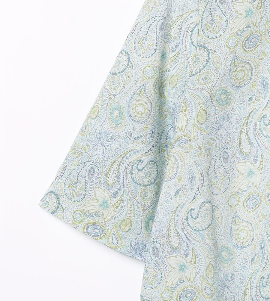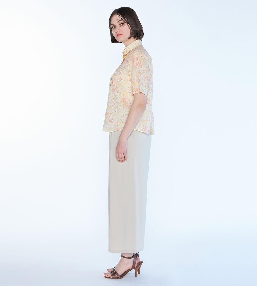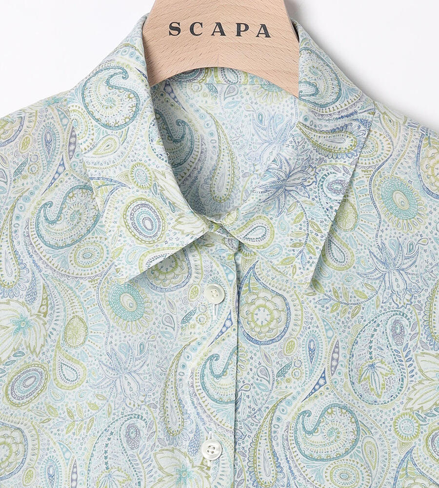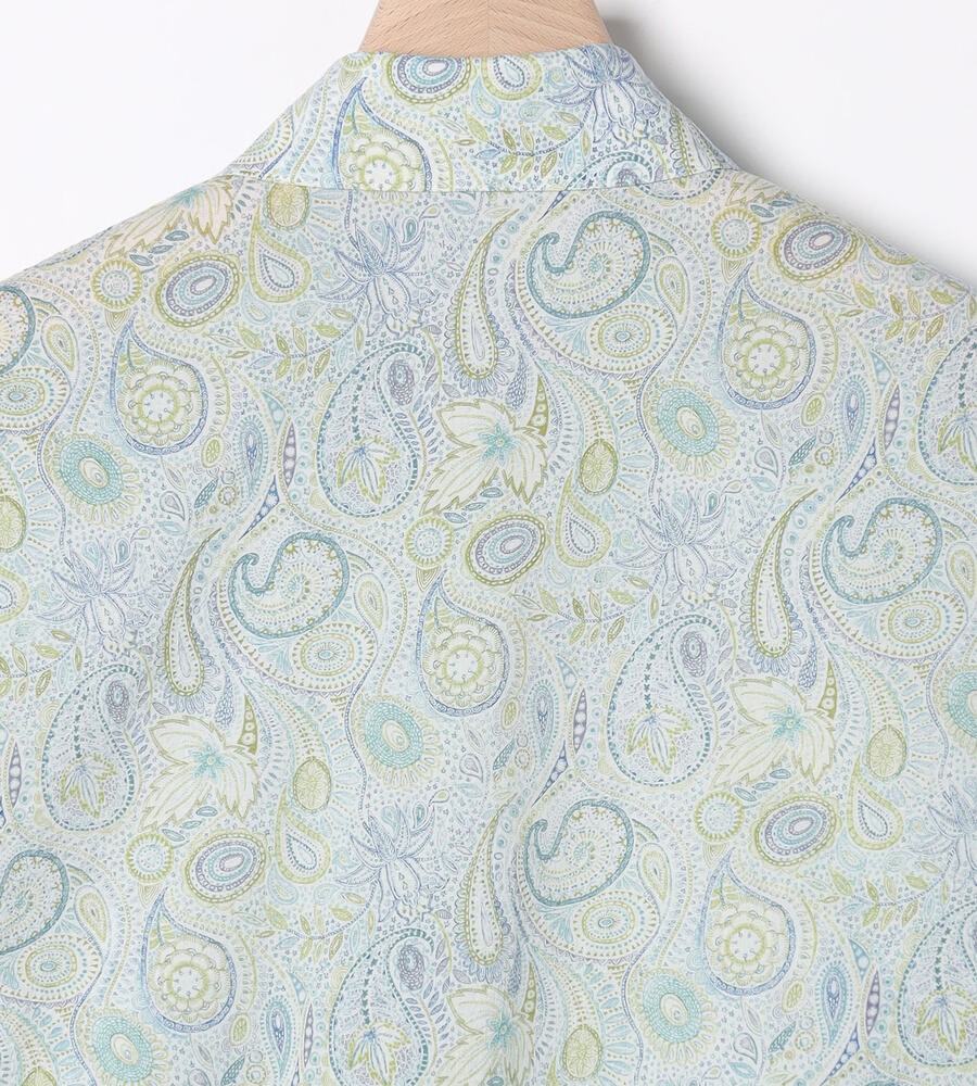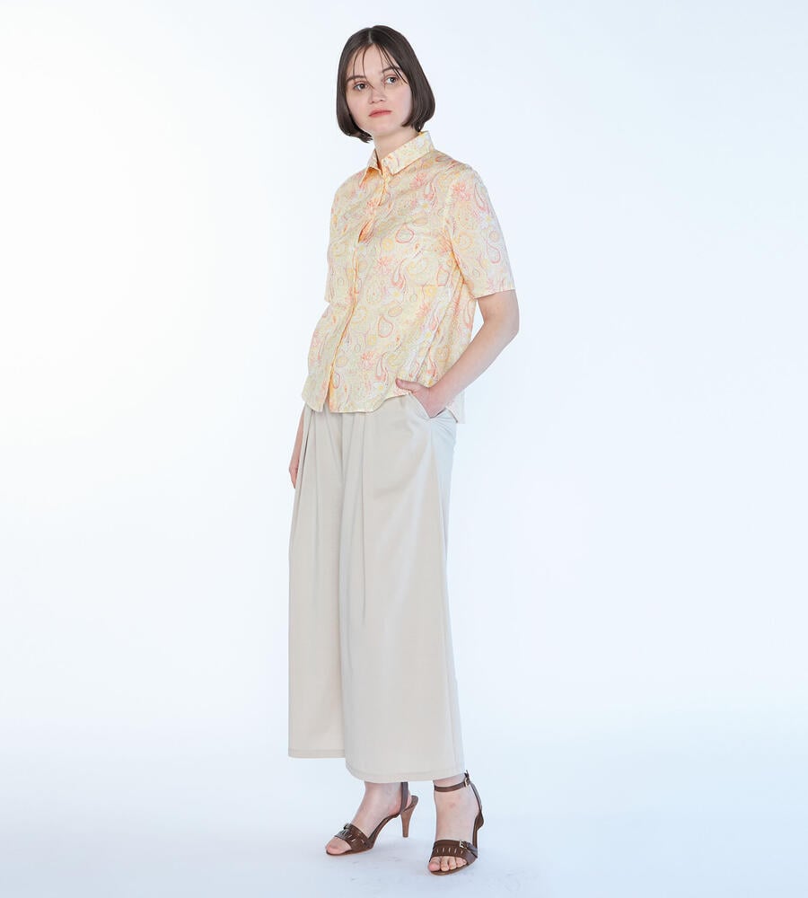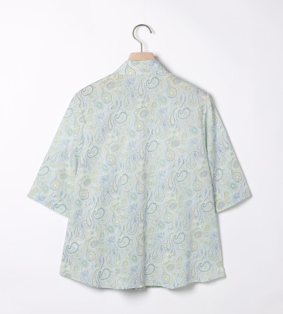 ペイズリー柄を明るく爽やかな印象の配色で描いたブラウス。衿付きのデザインがシャープさをプラスして、幅広いシーンで活用できます。すっきりと着こなせる丈感でパンツともスカートとも好相性のアイテムです。ガウチョパンツと合わせるのもおすすめのコーディネート。シンプルなジレを重ねても素敵です。
