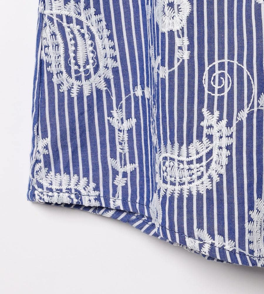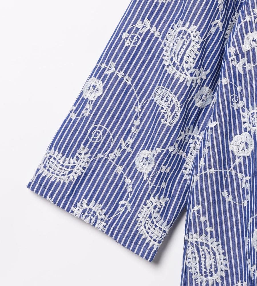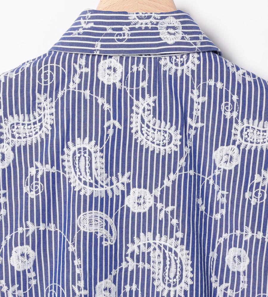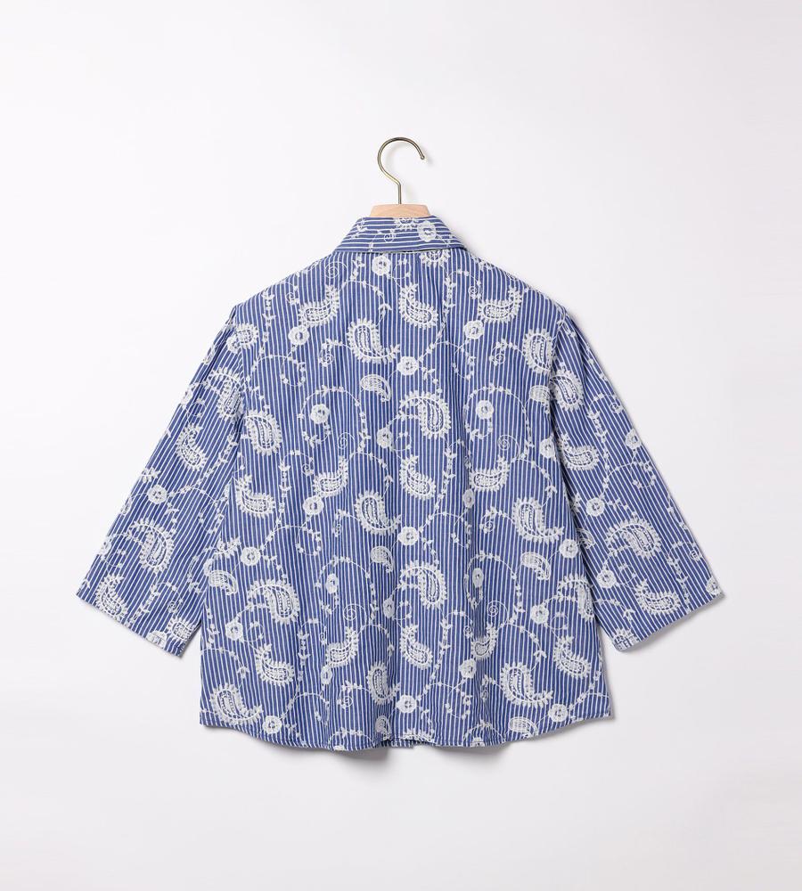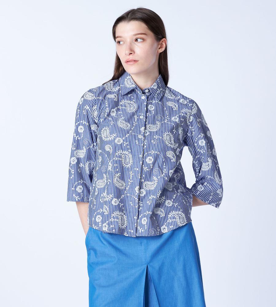 ストライプ柄のコットン生地に丁寧なペイズリー刺繍をあしらった5分袖ブラウス。爽やかでエレガント、そしてエスニックな雰囲気が漂う一着です。ややコンパクトな作りですっきりと着用でき、無地のボトムを合わせるだけで華やかな装いが完成します。ワンピースなどの軽い羽織りとして使うのもおすすめです。