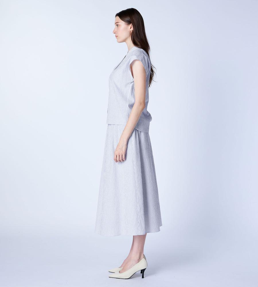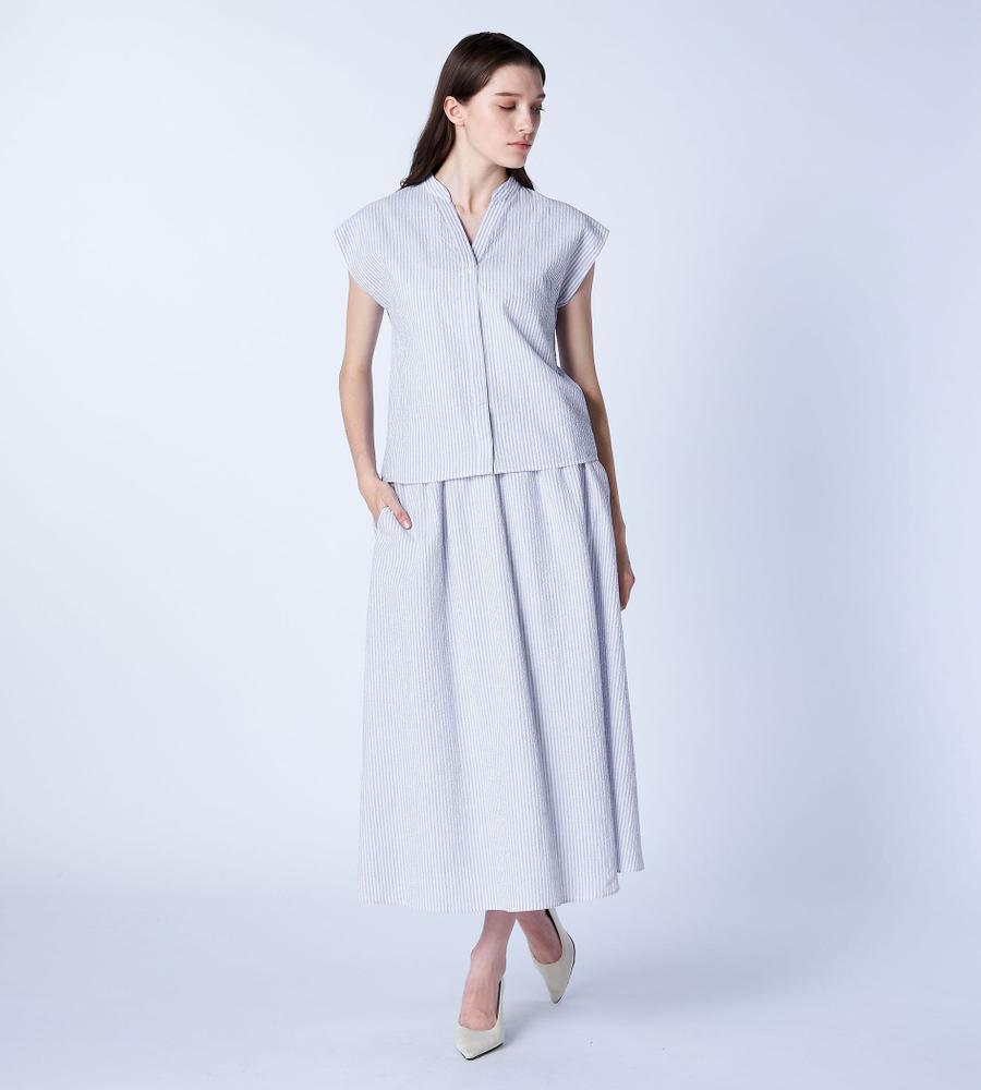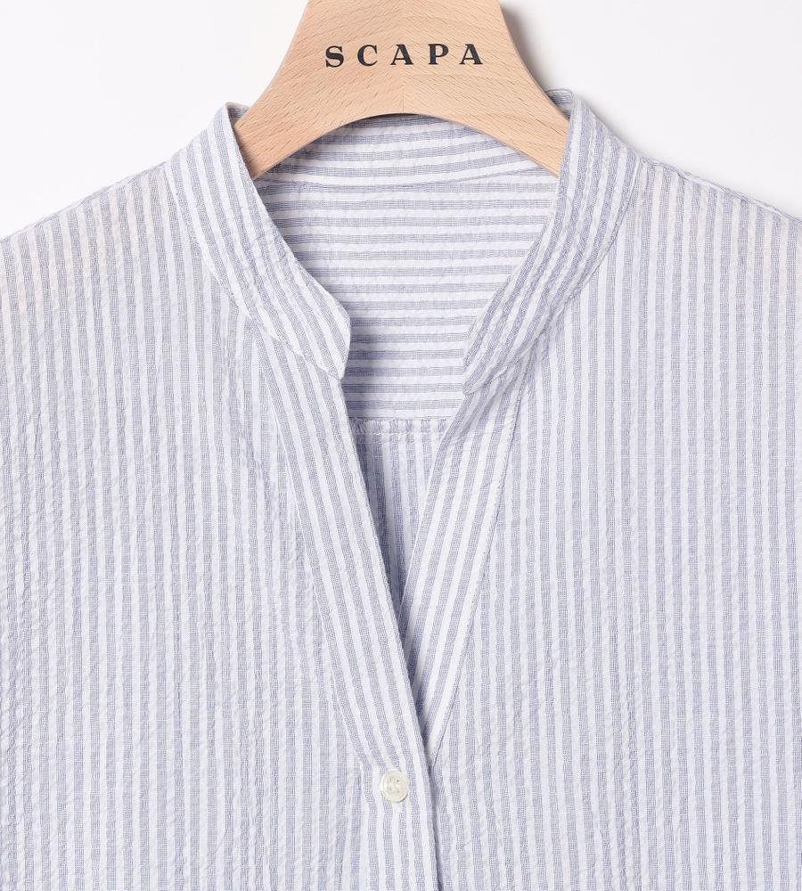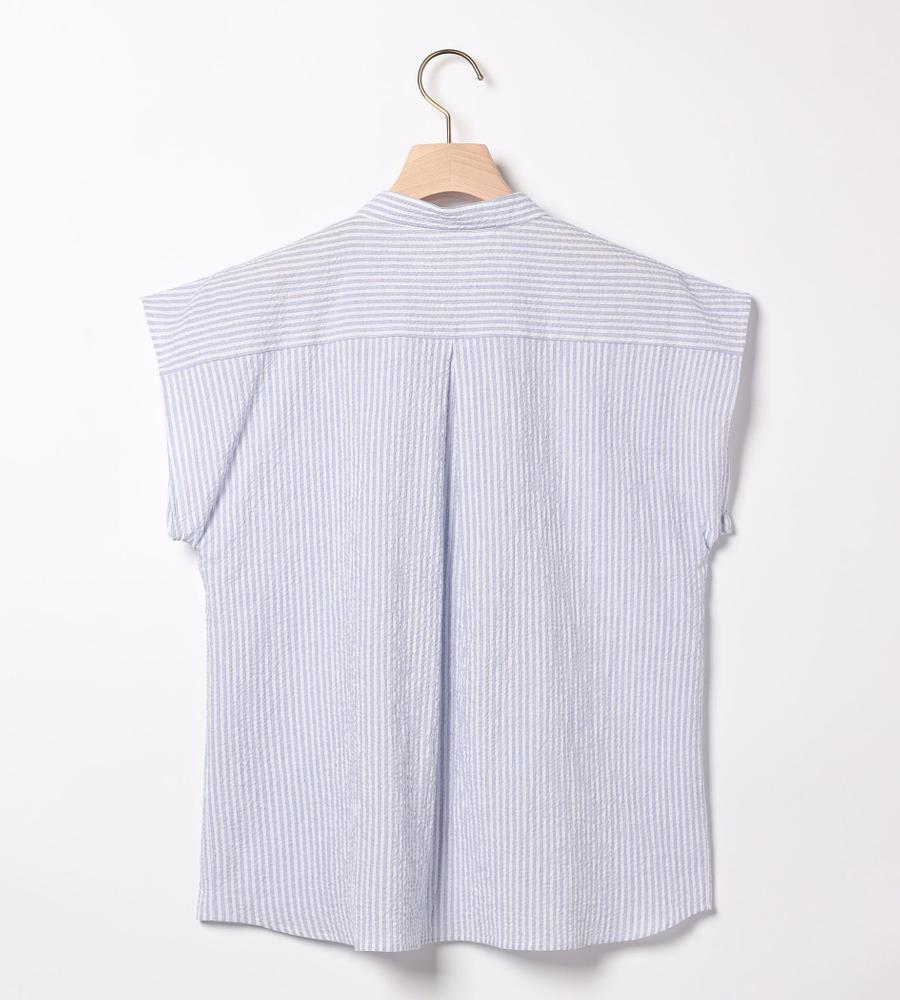 爽やかで夏らしいサッカーストライプ生地のブラウスです。フレンチスリーブを特徴とした軽やかなシルエット。スキッパー仕様のバンドカラーも首まわりを涼しげに演出します。フロントはシンプルな比翼仕立てで、バックにはボックスプリーツをデザイン。様々なボトムと相性がよく、幅広いコーディネートに活躍します。