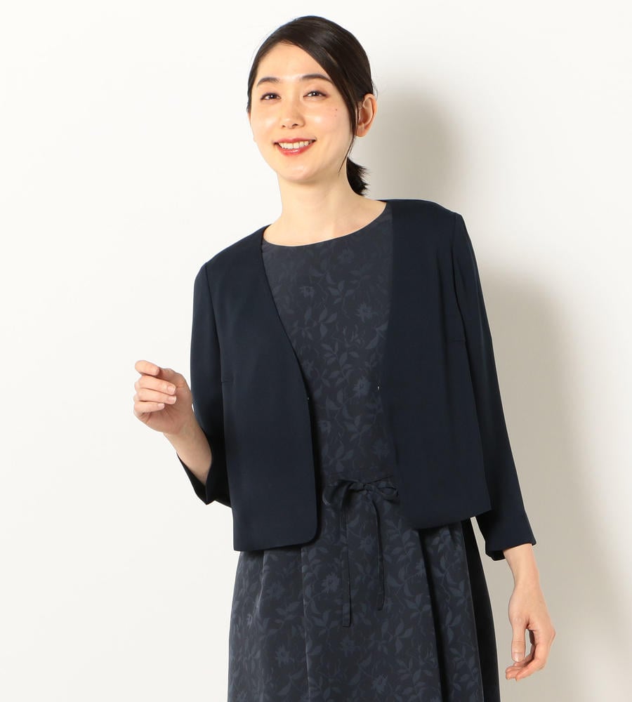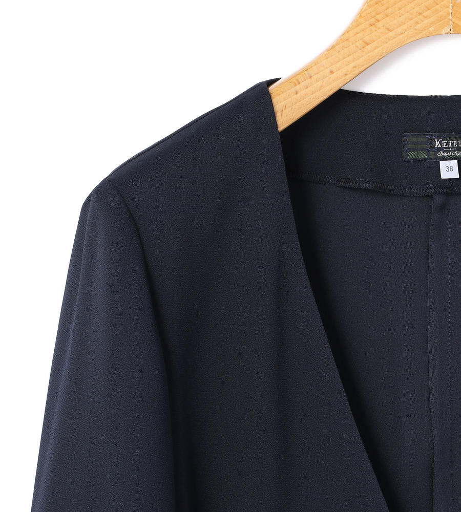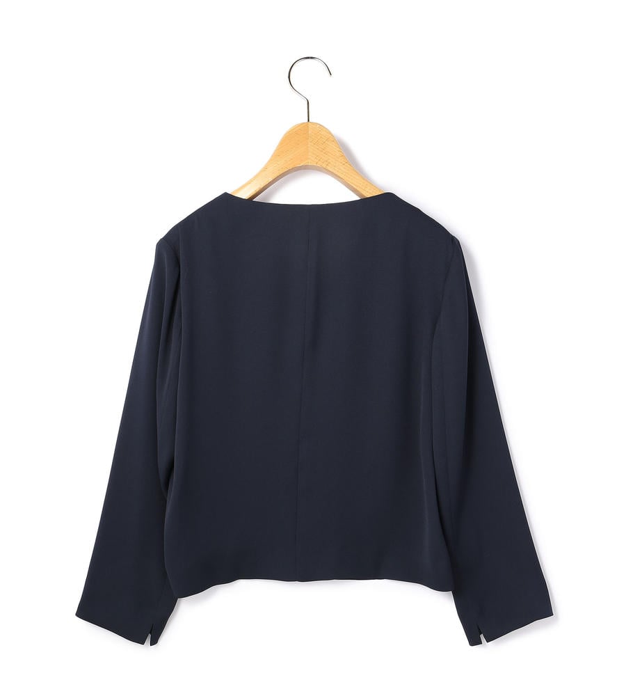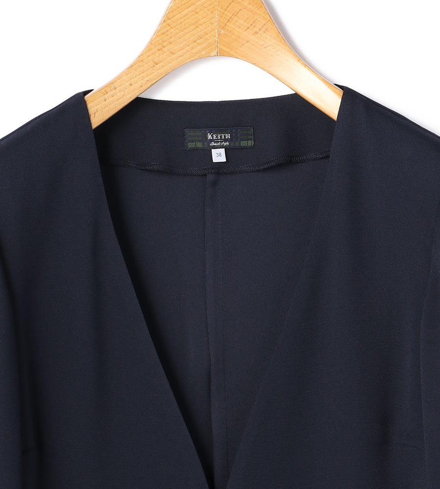 すっきりとした印象に着こなせるノーカラー×Vネックのジャケット。とろみのあるソフトな風合いが際立つよう、裏地を省いて仕立てています。着心地が軽く、普段のコーディネートにも気軽に取り入れられるアイテムです。ほどよい着丈はパンツにもスカートにも、ワンピースにも似合います。