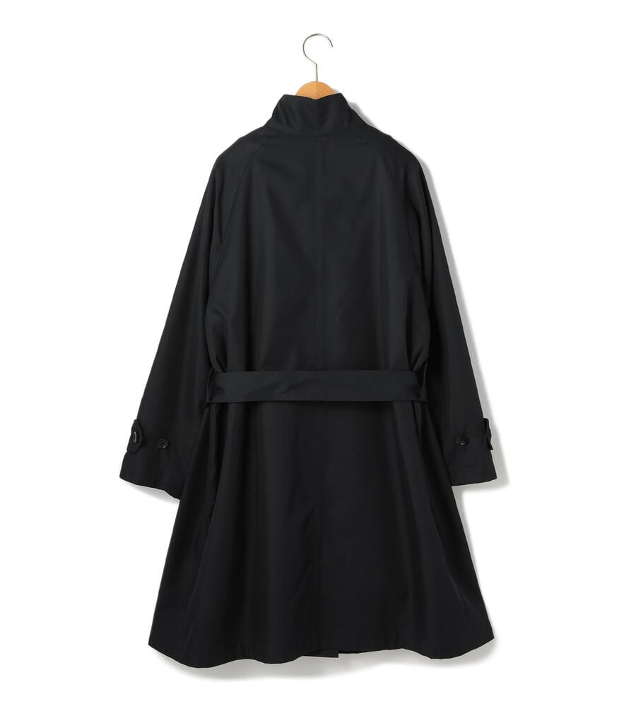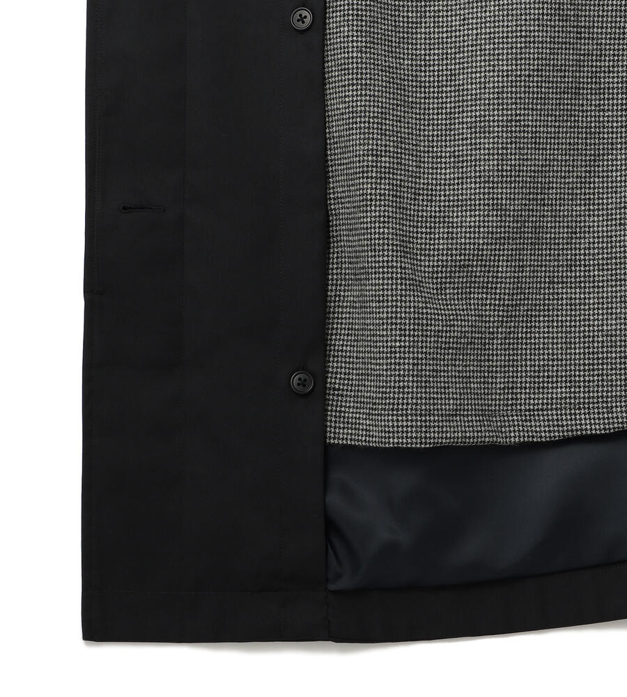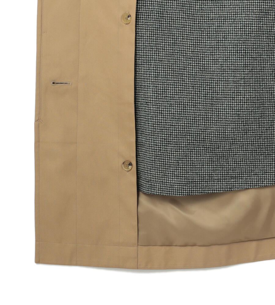 裾に向かって広がるAラインシルエットのベルト付きギャバジンコート。フロントはボタンの見えない比翼仕立て、サイドにポケットを配置。ボタンで取り外しが可能になっているライナーにはハウンドトゥース柄を採用し、クラシカルなエッセンスを取り入れています。