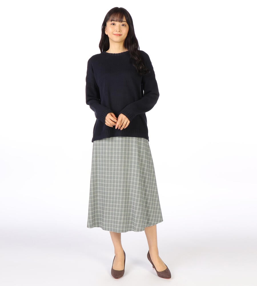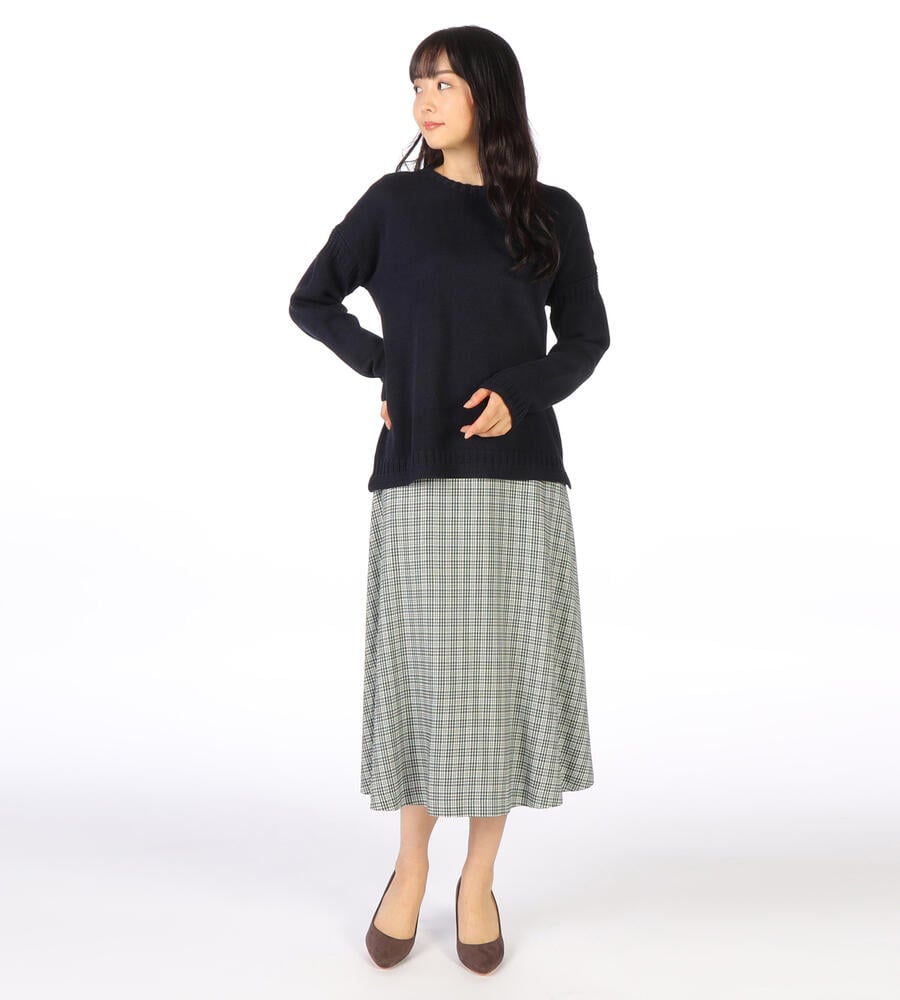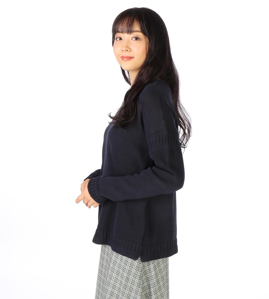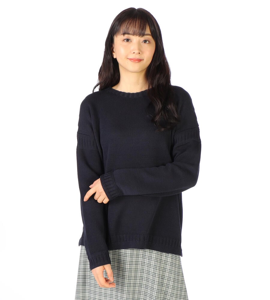 ルーズなシルエットバランスがモダンな、ミドルゲージのコットンニット。さらっとした肌当たりで、長いシーズン着回せます。袖と裾には編み柄を入れ、シンプルなデザインにさりげないアクセントをプラス。フェミニンな抜け感があり、ジーンズとラフにスタイリングするのがおすすめです。ロングスカートに合わせても旬の着こなしに仕上がります。