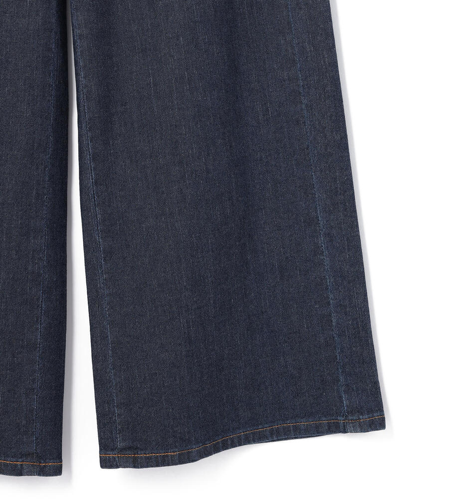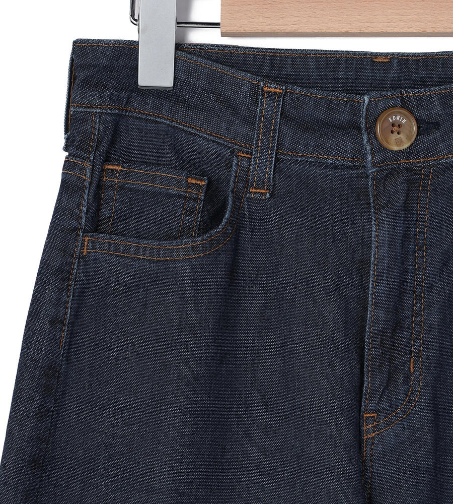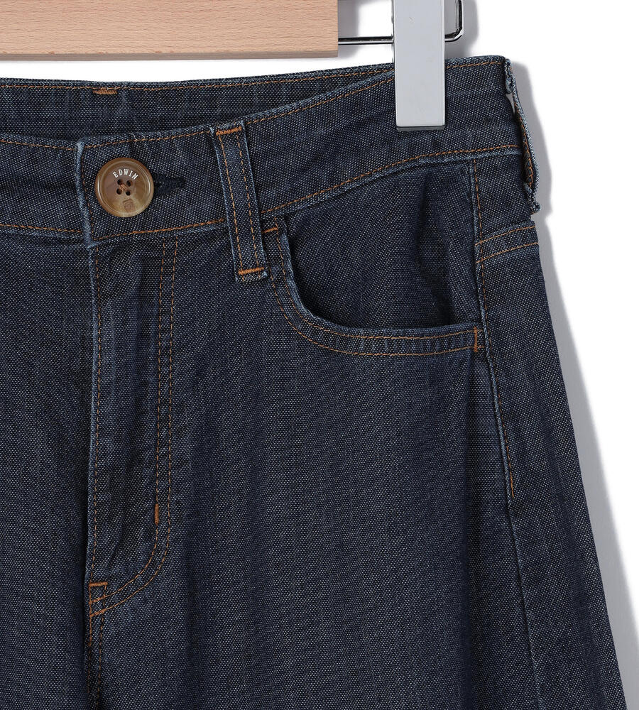 着こなしやすくさわやかなブルードビー織りのパンツ。デニムアイテムで有名な老舗ブランドEDWIN(エドウィン)とのコラボレーションアイテムです。裾に向かって広がるワイド幅のシルエットが今年らしいデザイン。パンツながら、スカートのようなフェミニンなボリューム感があり華やかな雰囲気が魅力です。