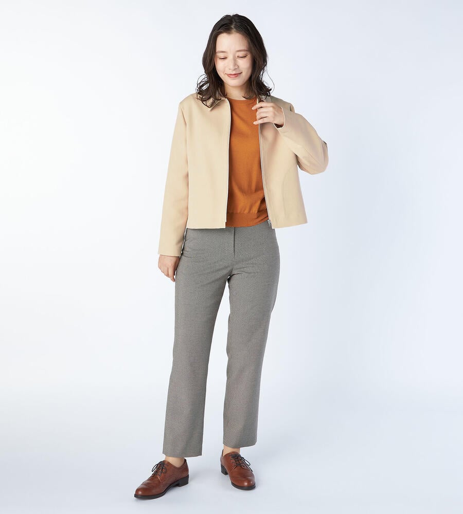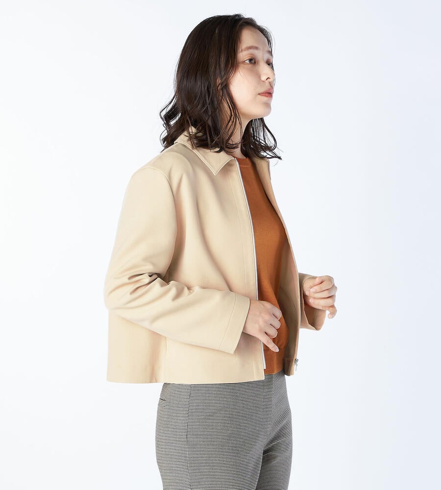 衿付きのシャープさとジップ開きのカジュアル感のバランスが良いジャケット。着丈は短めですっきりと着こなせ、さまざまなボトムスとのコーディネートを楽しめます。ベーシックな無地ならではの取り入れやすさも魅力です。裏地は省き、軽い着心地に仕立てています。ハンカチなどの小物の収納にも便利なサイドポケット付き。