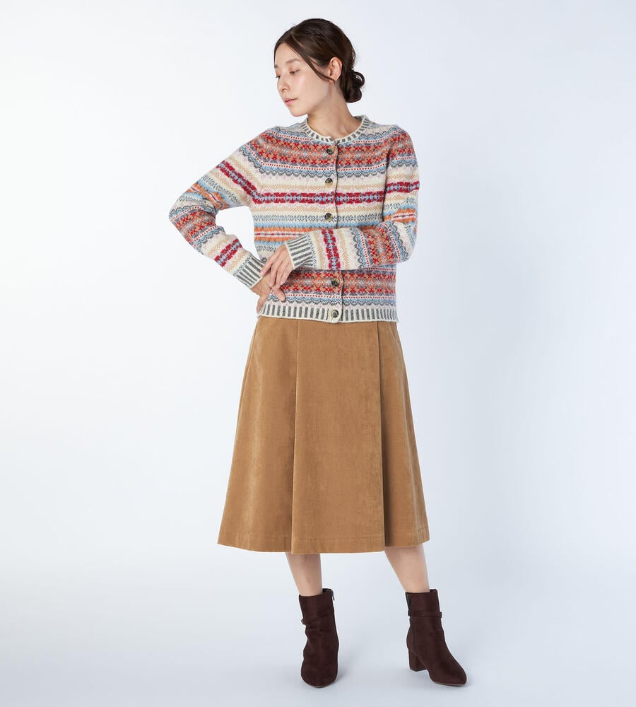 こっくりとした、深みのある風合いを持つ別珍素材のスカートです。裾に掛けて大きく広がる綺麗な台形シルエット。実際に着用することで、クラシカルな装いを楽しめます。膝が隠れる程度の着丈が、淑女の気品たっぷり。足元にブーツなどを合わせると、より季節感のある着こなしが完成します。