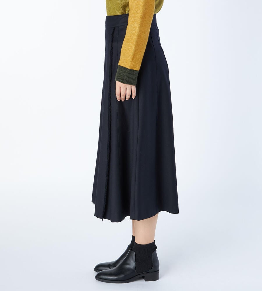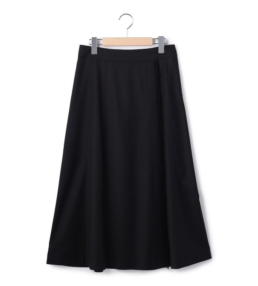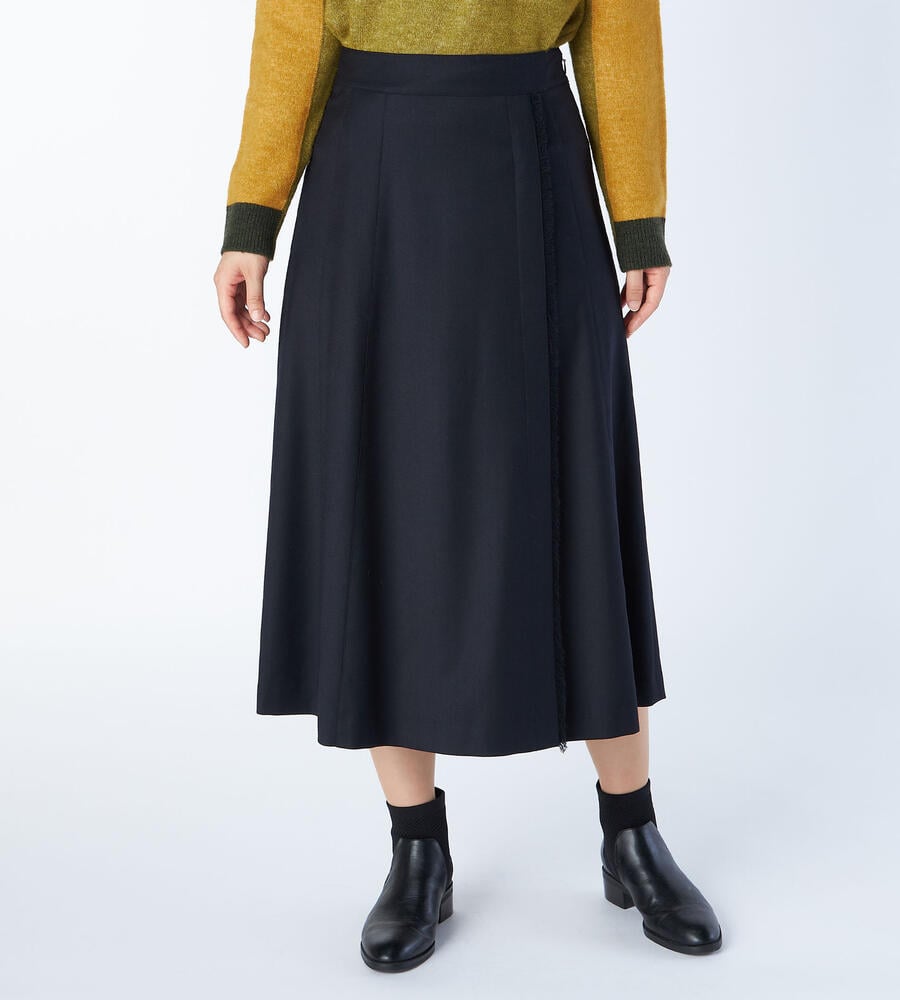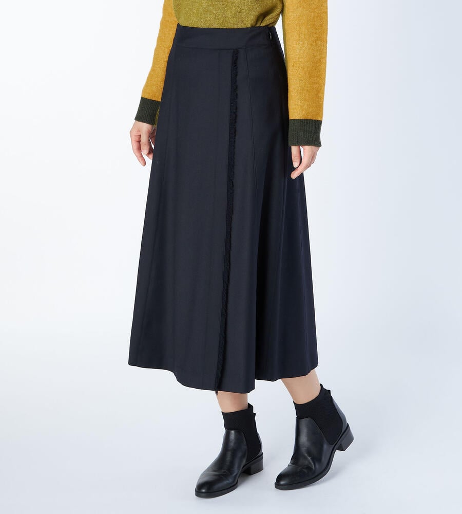 タイムレスかつエレガントな装いを完成させる、シックなスカート。合わせるトップスを選ぶことなく、長くご愛用いただけます。フリンジ使いとラップスカート風のディテールが、さりげなく装いにアクセントをプラスします。ウールを混紡した温かみのある風合いで、これからの秋冬シーズンに最適な1着です。