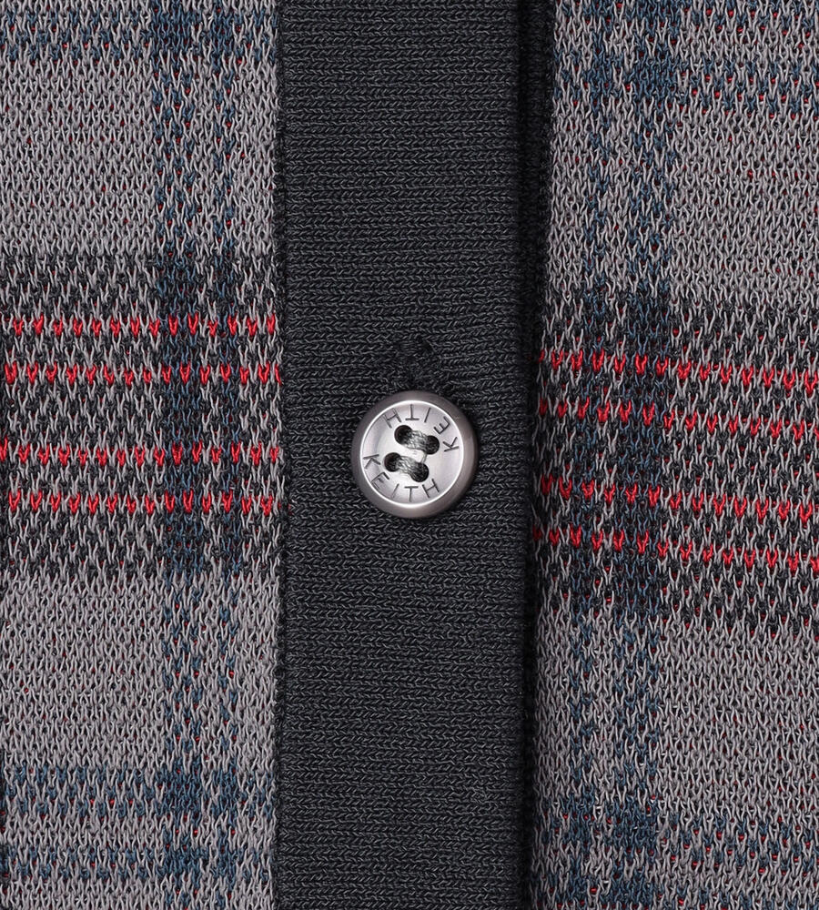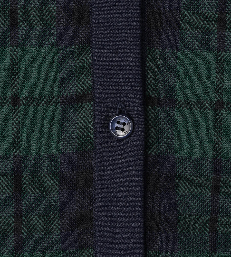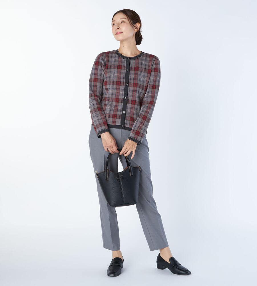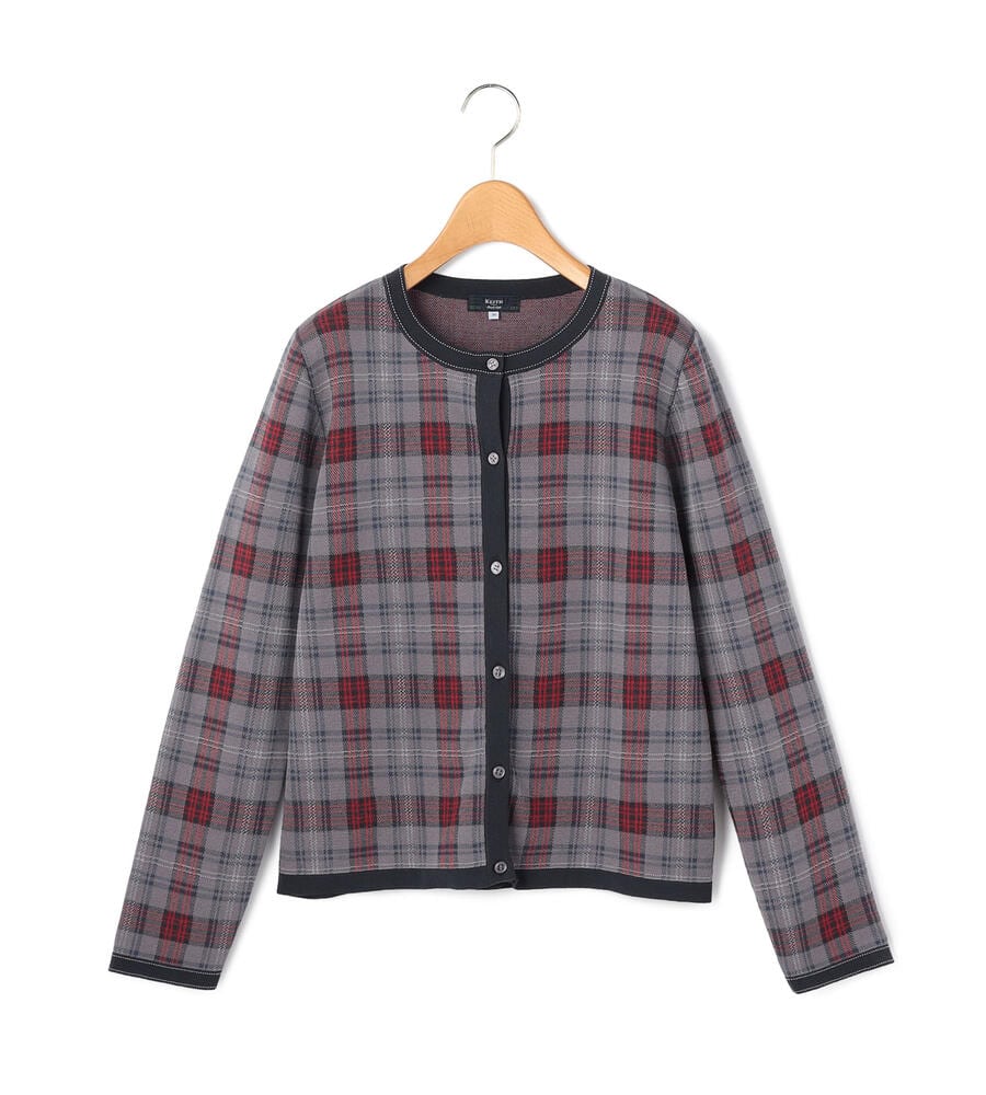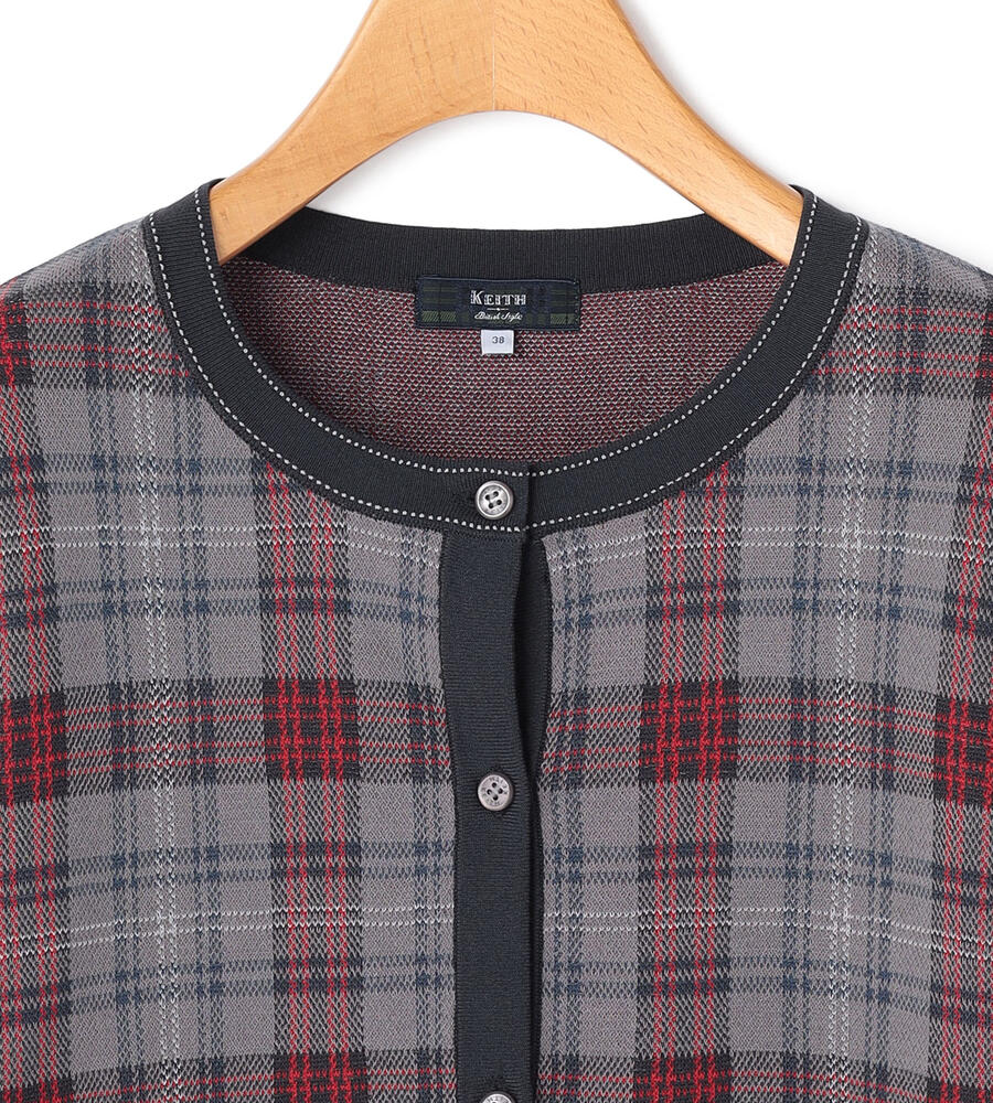 トラッドで上品なチェック柄のニットカーディガン。襟ぐりや前立ての配色デザインもクラシカルな雰囲気です。クルーネック仕様のコンパクトなシルエットで、羽織りとしてもトップス感覚でも着こなせます。滑らかさのある綿×ナイロン素材で肌触りも快適。オンオフ兼用でおすすめのアイテムです。