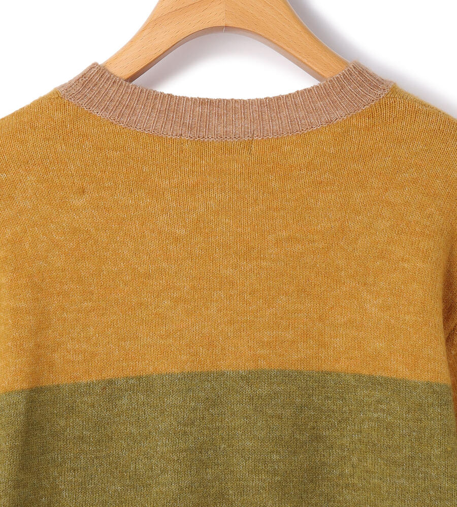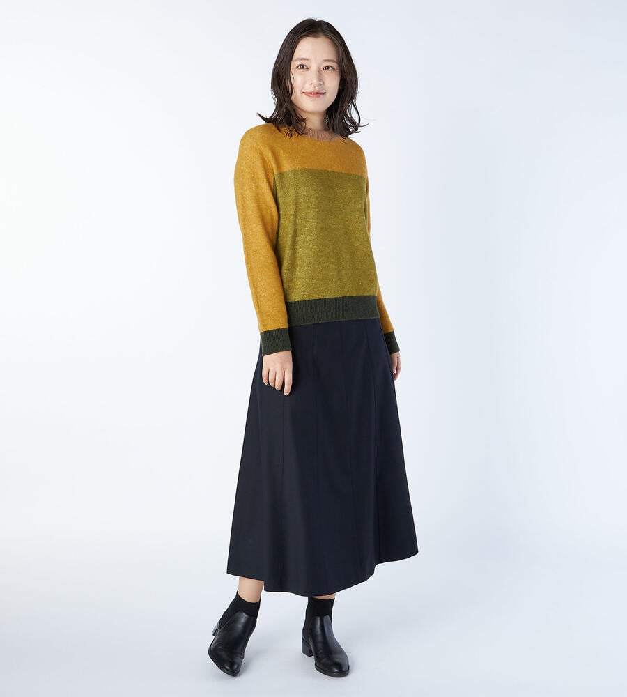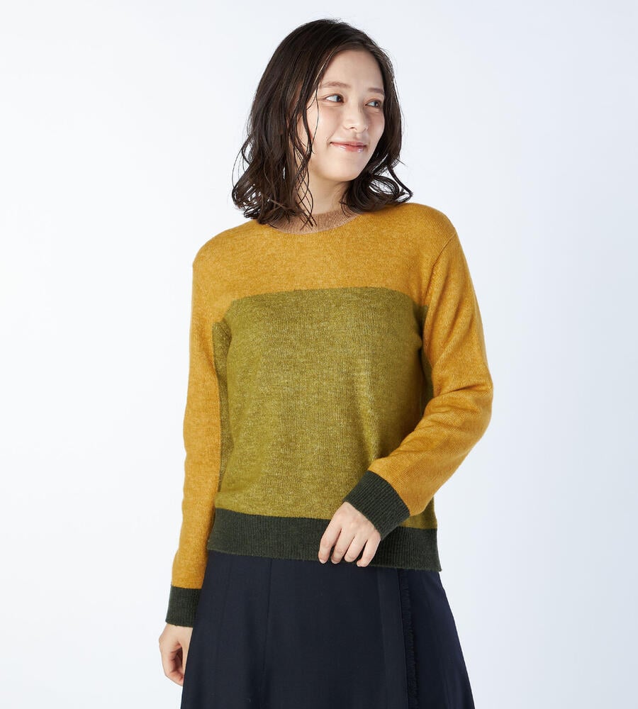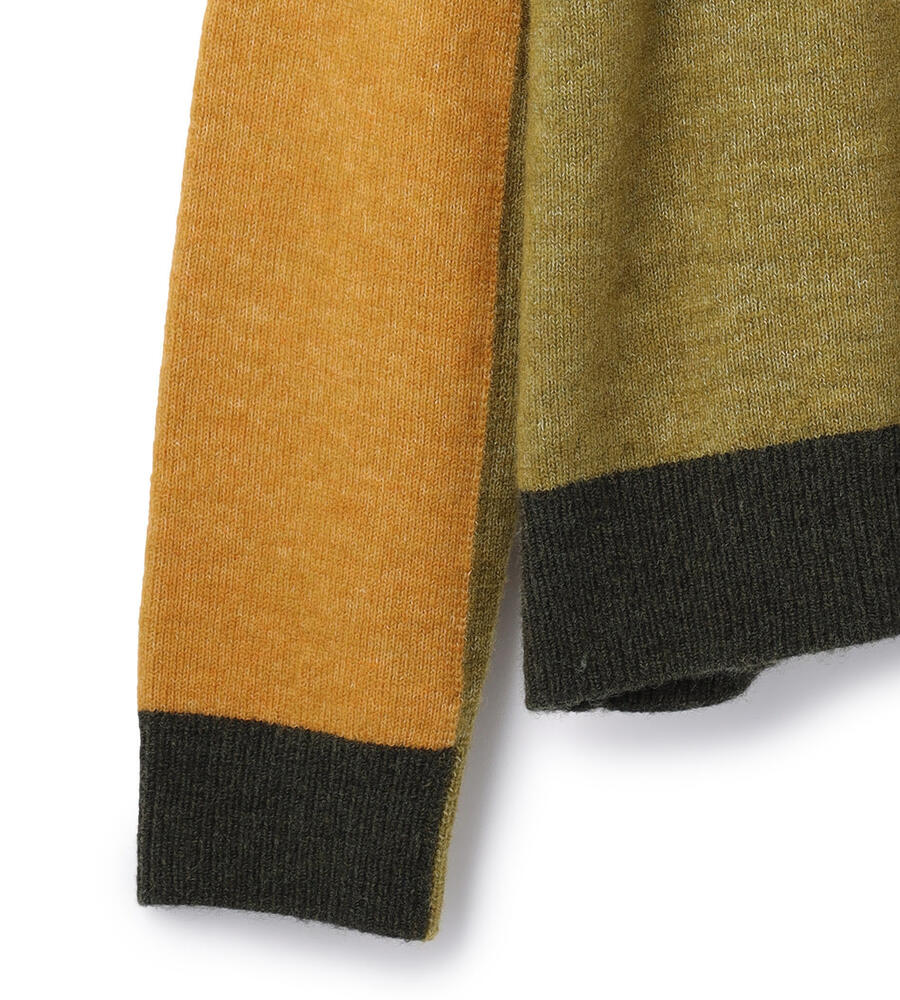 カラーブロックのメリハリが目を引くニットプルオーバー。アーティスティックな雰囲気があり、華やかなコーディネートを楽しめます。胸元の切り替えデザインによって顔回りがすっきりと見えるのもポイント。厚みを出しすぎない仕上がりとすっきりとしたシルエットはコートやダウンベストのインにもおすすめです。