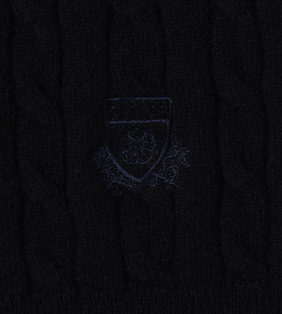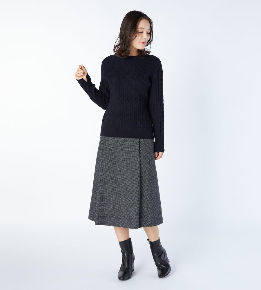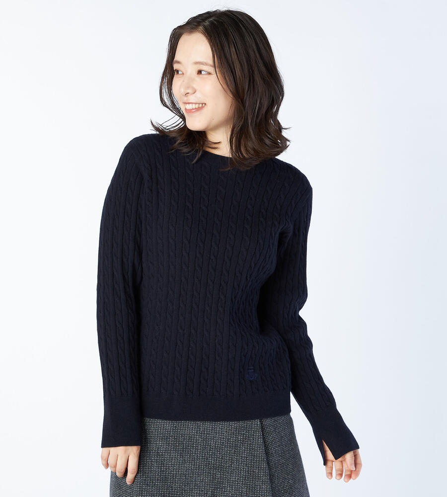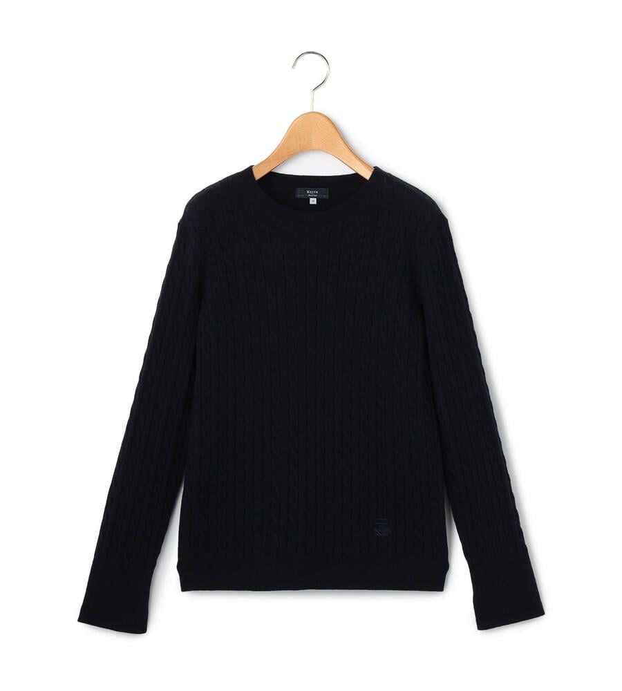シンプルなルックスがデイリーに愛用できるニットトップス。上品な雰囲気を醸す細やかなケーブル編みから大人の余裕を感じられる1着。左裾にさりげなくエンブレム刺繍を添えたディテールへのこだわりもポイントです。
