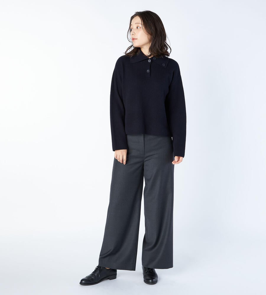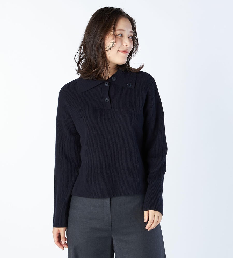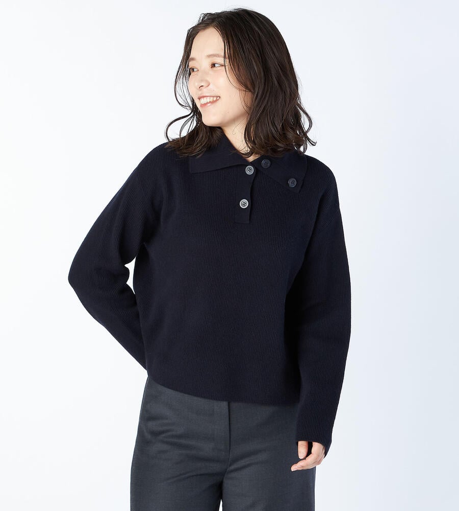 襟にあしらったボタンで個性をプラスしたロングスリーブニット。シンプルになりがちなニットにさりげなく遊び心をプラスしたアイテムです。毛100%素材を採用した暖かな風合いが快適な着心地。ロングスカートやワイドパンツとも合わせやすい軽やかな着丈がトレンドライクな表情に仕上げてくれます。