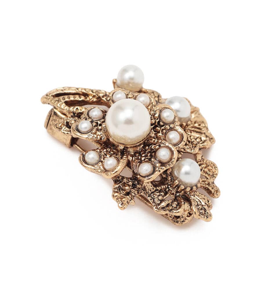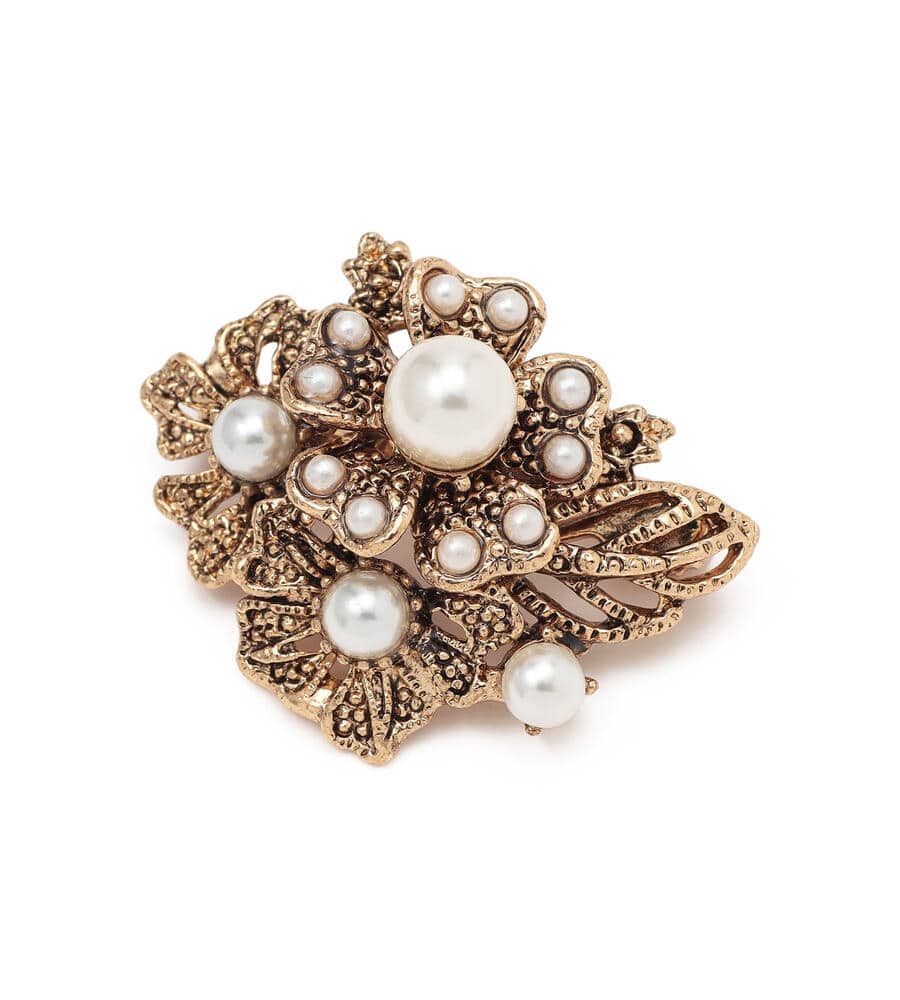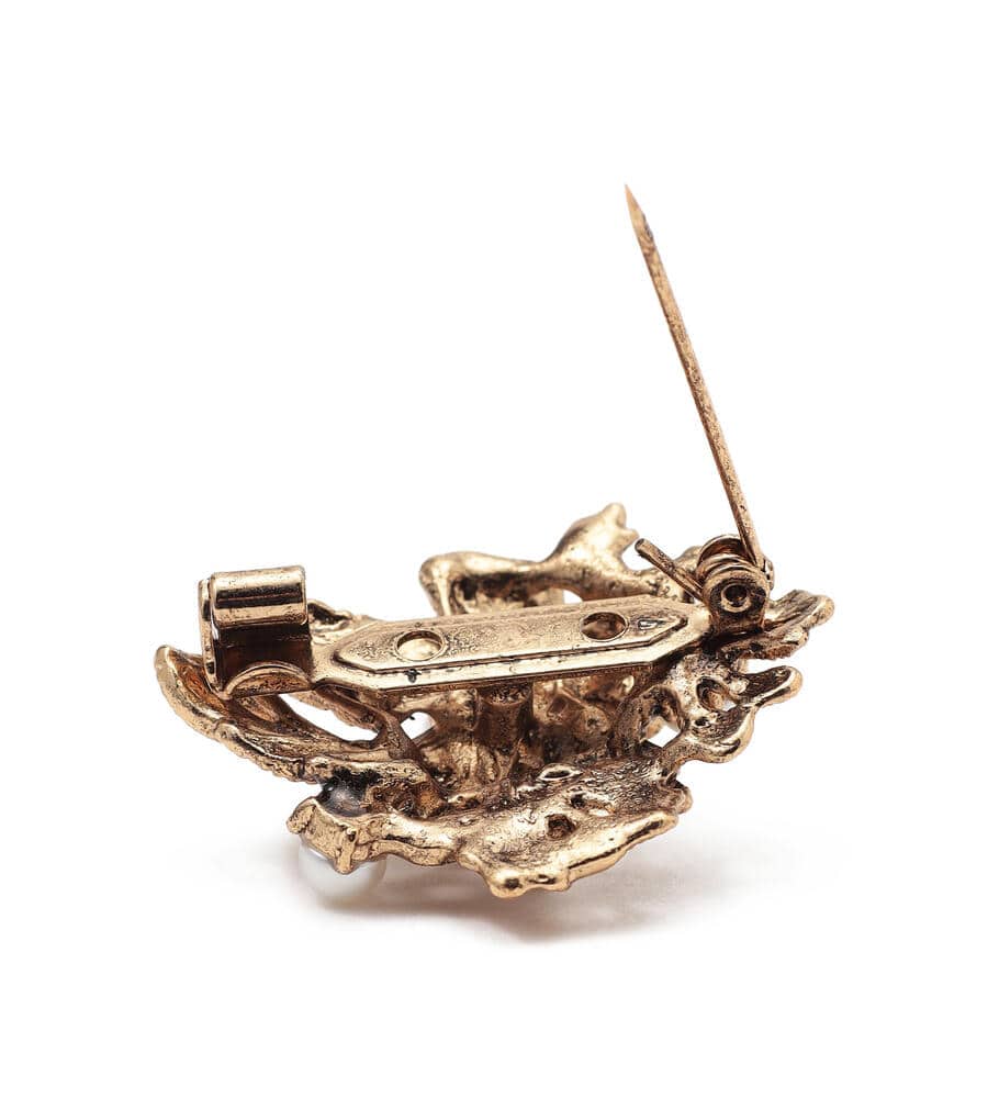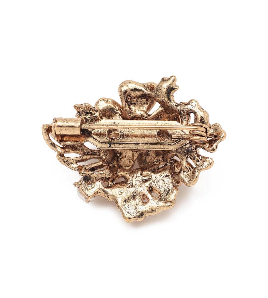 クラシカルなムードのデザインのブローチ。立体的に表現されたフラワーモチーフにパールのあしらいが華やかなデザインポイント。ヴィンテージ調のゴールドが落ち着いたカラーで様々なスタイルにマッチします。ピン仕様でいつもの着こなしに簡単に取り入れられて、シックなコーディネートが完成するアイテムです。