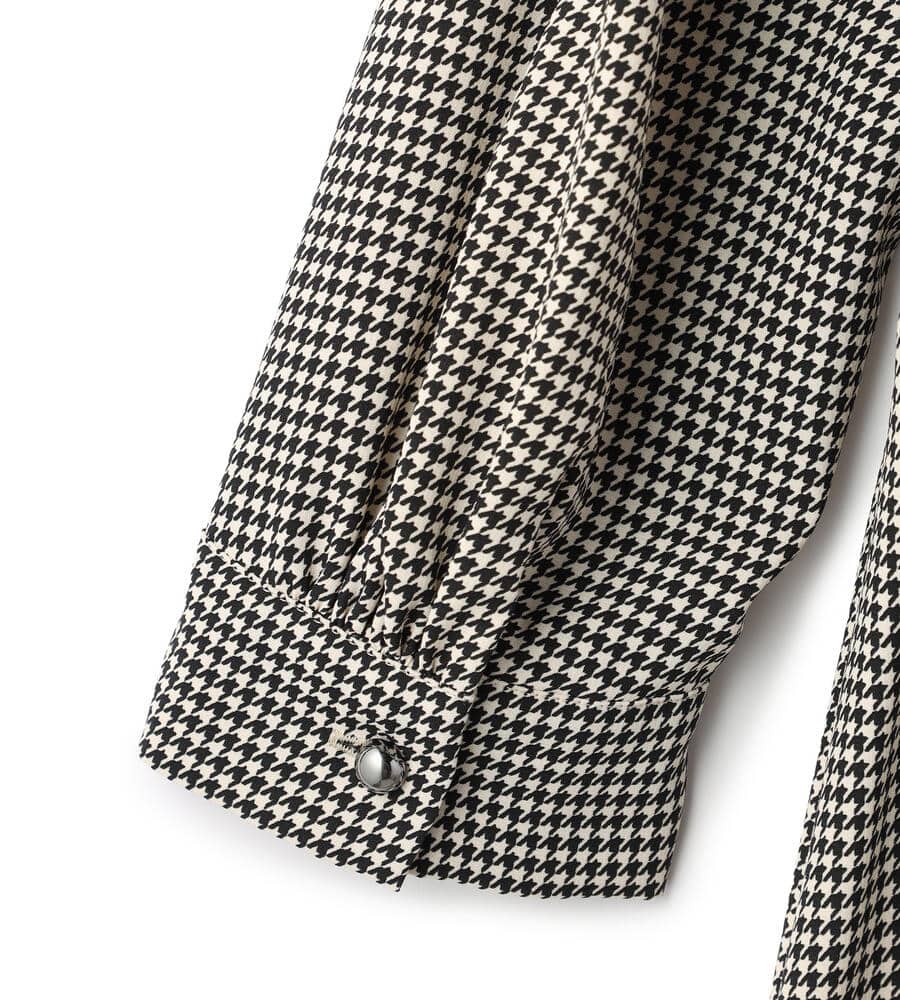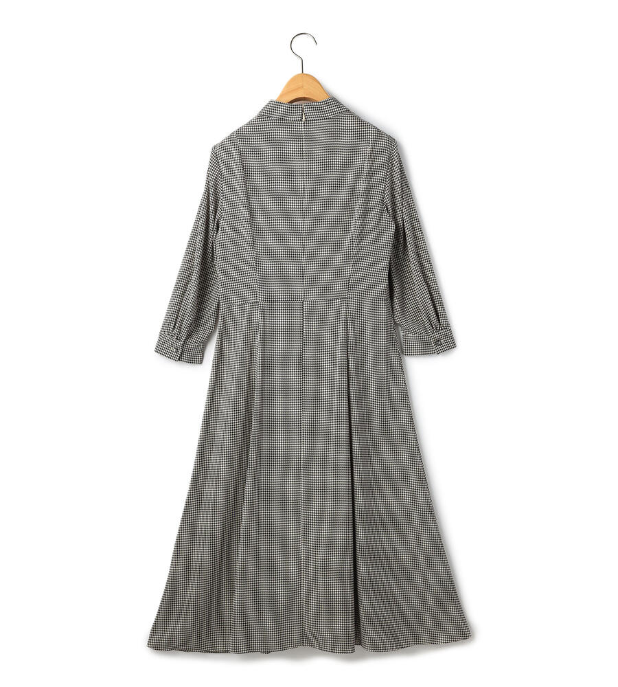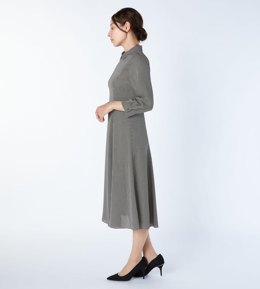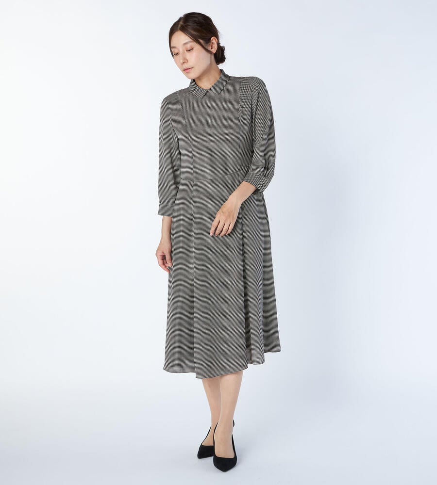 ハウンドトゥース柄プリントがさりげなく華やかな長袖ワンピース。ウエスト位置に切り返しがあり、ロング丈でもバランスよく着こなせます。スカートの美しいドレープがフェミニンなシルエット。落ち感のある上品な生地感と、衿付きのデザインでエレガントなお出かけコーディネートが完成するアイテムです。