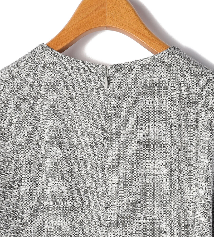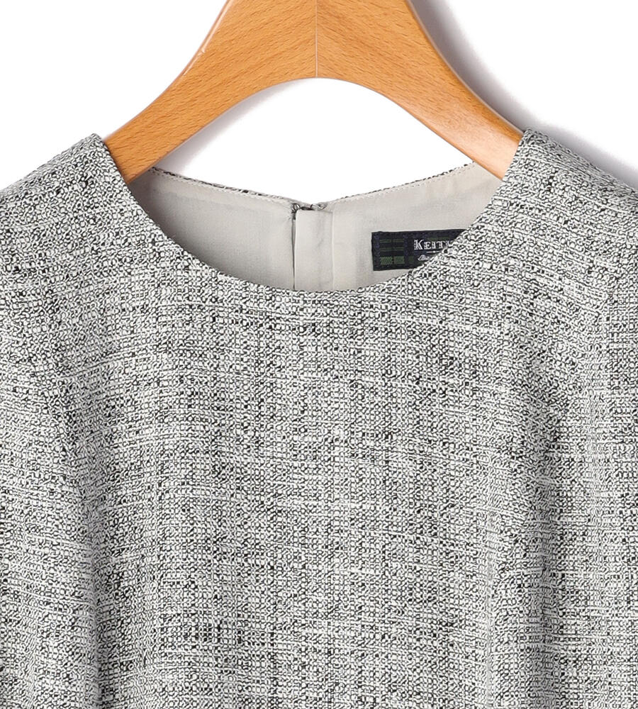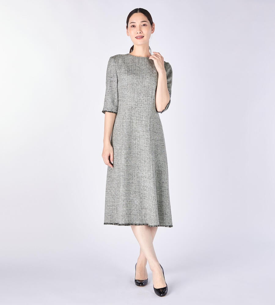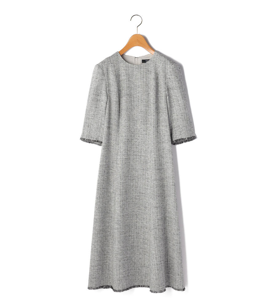 袖口と裾にほどこしたショートフリンジがアクセントになったスプリングツィードワンピース。裾に向かって広がるフィット&フレアシルエットが美しく、しなやかでエレガントなスタイルが完成。同素材のノーカラージャケットを合わせたセットアップコーディネートも素敵です。
