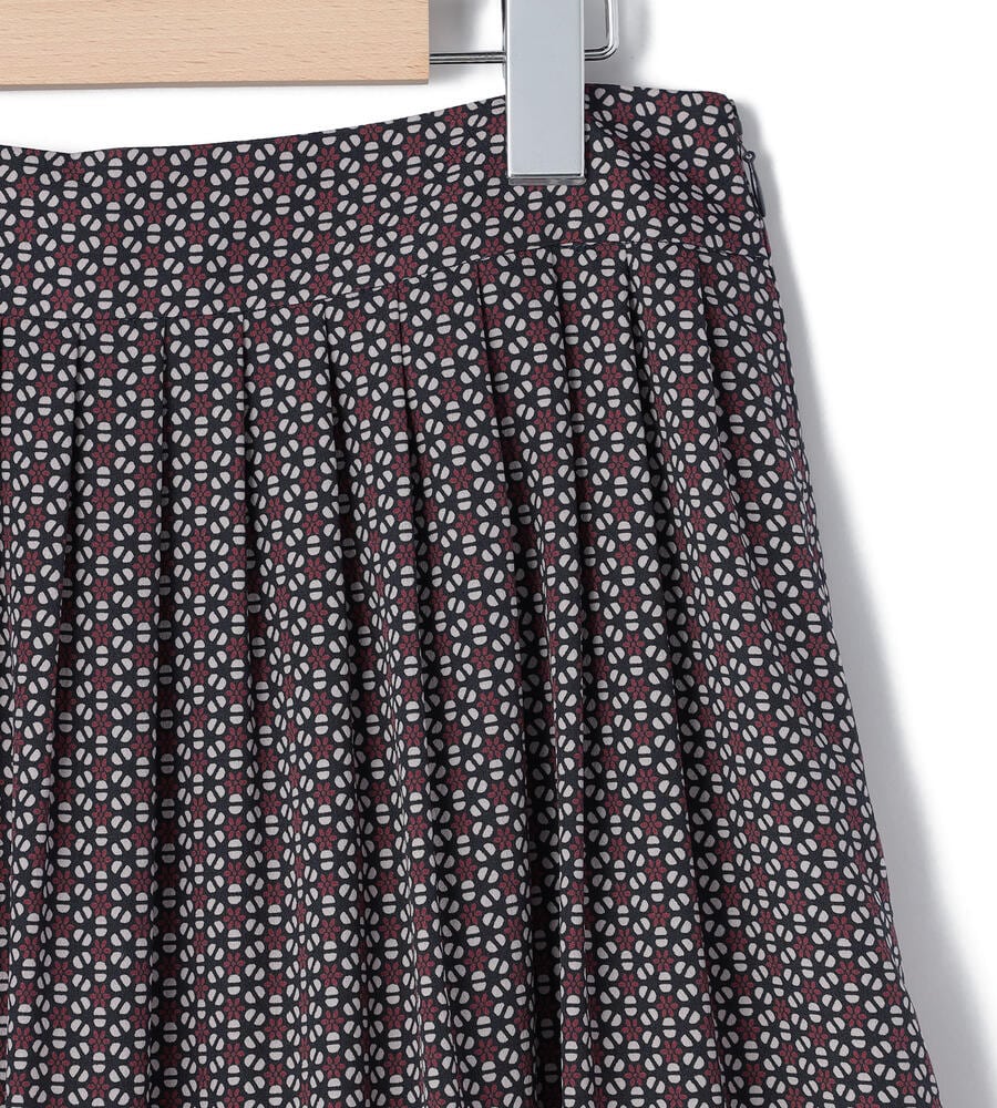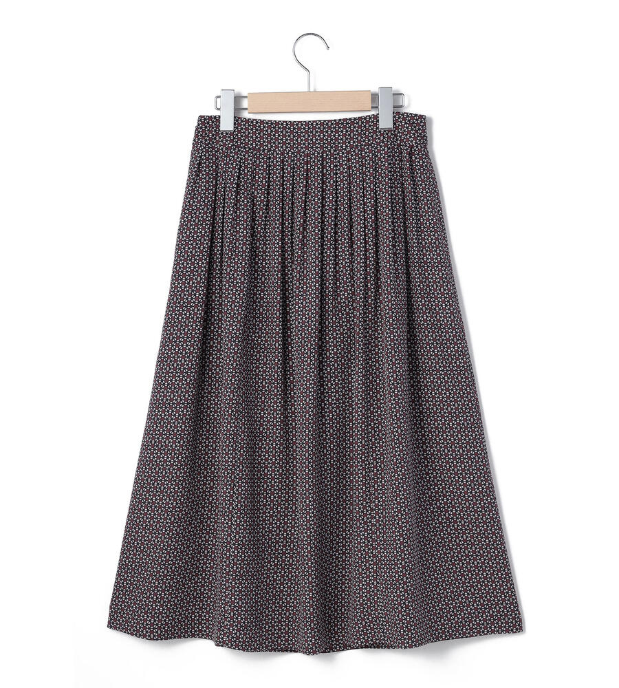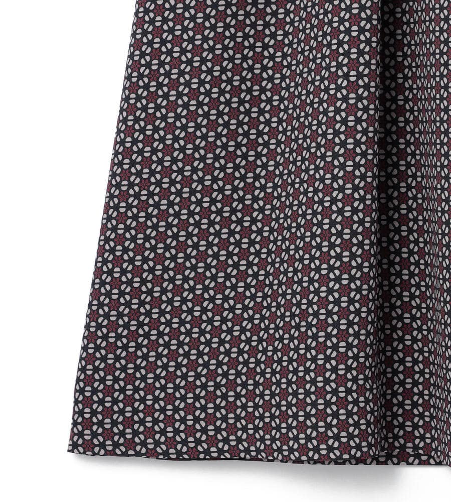 幾何学的で繊細な小紋柄を用いたミモレ丈スカート。シボのあるポリエステル素材はさらりとしており、プリーツから展開するドレープが軽やかに揺れる素材です。膝が隠れる程度の着丈で、淑女らしい着こなしを楽しめるのが魅力。ニットやブラウスなど、合わせるトップスの質感を選ばず、多彩なスタイリングに活躍します。
