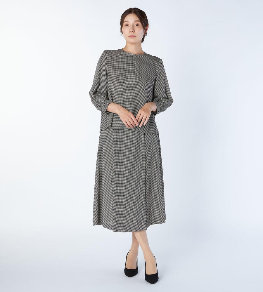 ハウンドトゥース柄プリントが着こなしのアクセントになる7分袖ブラウス。トレンド感のあるふんわりとしたボリュームの袖とフレアに広がる裾がフェミニンなシルエット。落ち感のある上品なムードの生地感も魅力。お手持ちのボトムと合わせて、エレガントなお出かけコーディネートが完成するアイテムです。
