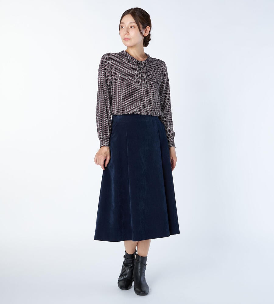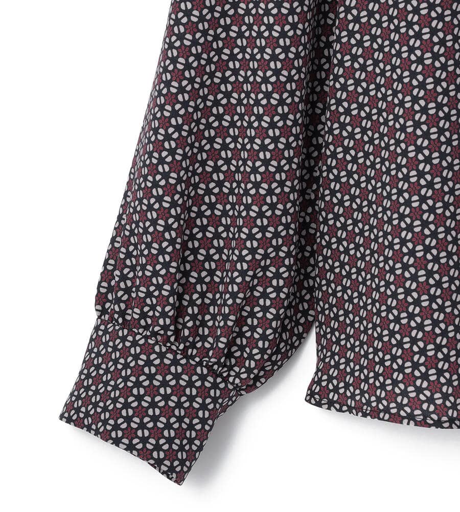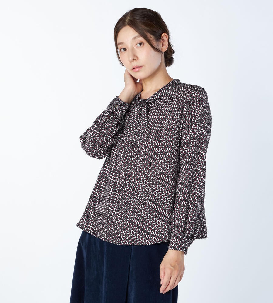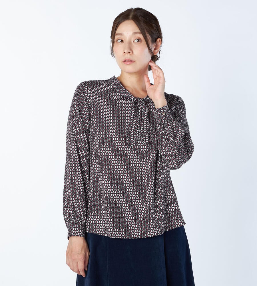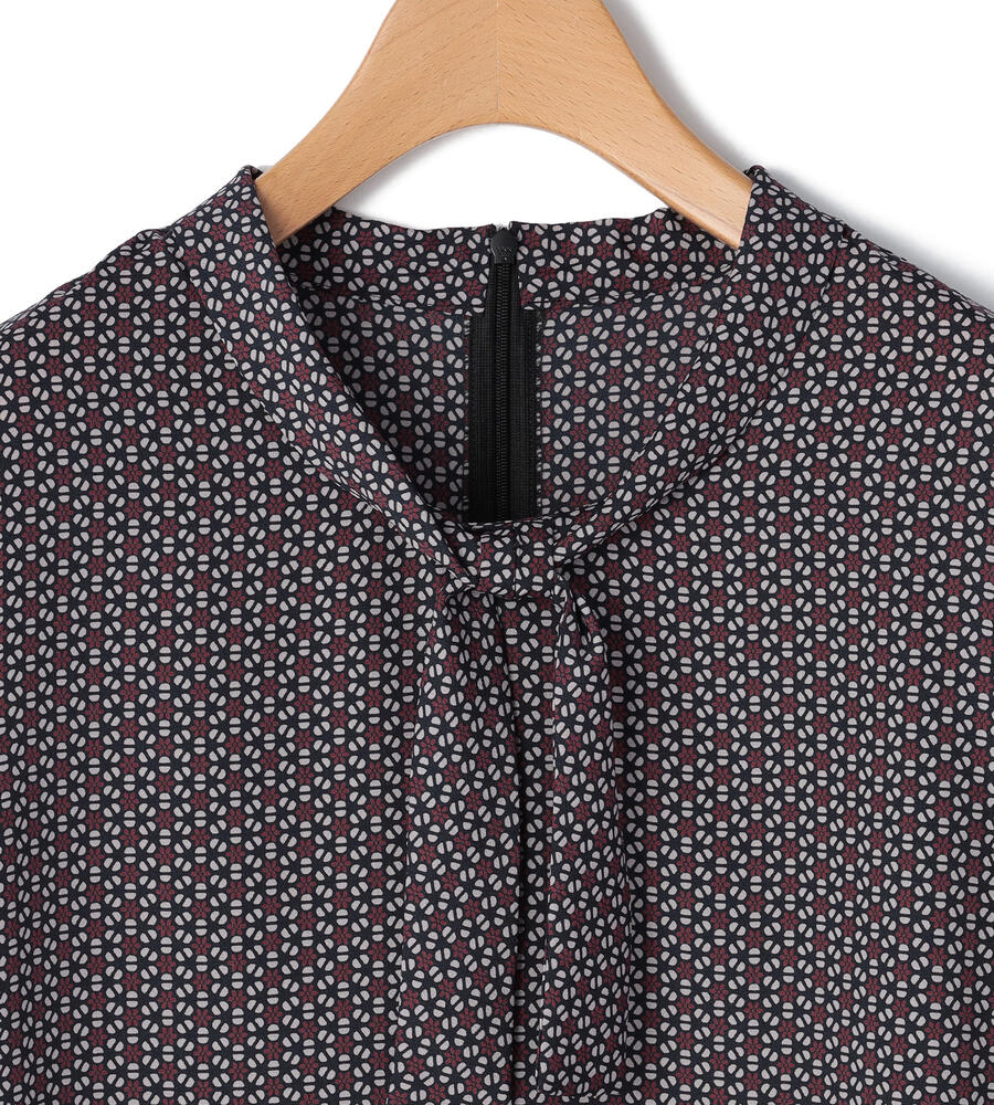 幾何学的で繊細な小紋柄を用いたフェミニンなブラウス。シボのあるポリエステル素材は、さらりとしており、上品な印象で楽しめます。ネックラインを立たせてボウを添えることで、淑女の気品を備えた仕上がりに。ミモレ丈のスカートやくるぶし丈のブーツなどを合わせると、よりレディライクにまとまります。